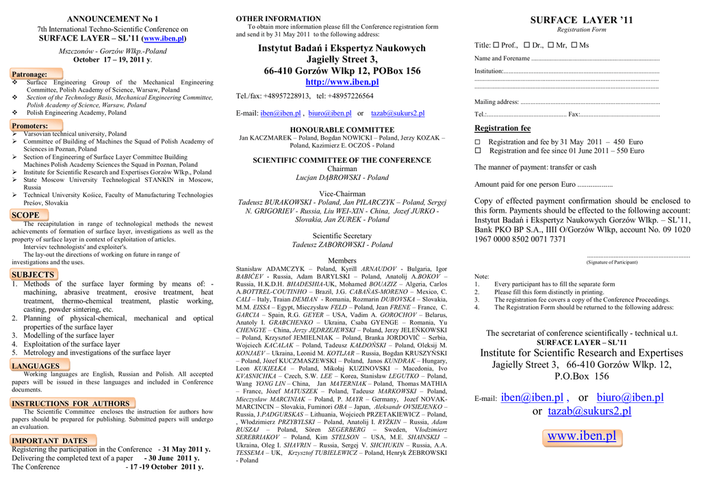 ANNOUNCEMENT No 1 7th International Techno-Scientific Conference on SURFACE LAYER – SL’11 (www.iben.pl) Mszczonów - Gorzów Wlkp.-Poland October 17 – 19, 2011 y. Patronage: Surface Engineering Group of the Mechanical Engineering Committee, Polish Academy of Science, Warsaw, Poland Section of the Technology Basis, Mechanical Engineering Committee, Polish Academy of Science, Warsaw, Poland Polish Engineering Academy, Poland Promoters: Varsovian technical university, Poland Committee of Building of Machines the Squad of Polish Academy of Sciences in Poznan, Poland Section of Engineering of Surface Layer Committee Building Machines Polish Academy Sciences the Squad in Poznan, Poland Institute for Scientific Research and Expertises Gorzów Wlkp., Poland State Moscow University Technological STANKIN in Moscow, Russia Technical University Kośice, Faculty of Manufacturing Technologies Preśov, Słovakia SCOPE The recapitulation in range of technological methods the newest achievements of formation of surface layer, investigations as well as the property of surface layer in context of exploitation of articles. Interviev technologists' and exploiter's. The lay-out the directions of working on future in range of investigations and the uses. SUBJECTS 1. Methods of the surface layer forming by means of: machining, abrasive treatment, erosive treatment, heat treatment, thermo-chemical treatment, plastic working, casting, powder sintering, etc. 2. Planning of physical-chemical, mechanical and optical properties of the surface layer 3. Modelling of the surface layer 4. Exploitation of the surface layer 5. Metrology and investigations of the surface layer LANGUAGES Working languages are English, Russian and Polish. All accepted papers will be issued in these languages and included in Conference documents. INSTRUCTIONS FOR AUTHORS The Scientific Committee encloses the instruction for authors how papers should be prepared for publishing. Submitted papers will undergo an evaluation. IMPORTANT DATES Registering the participation in the Conference - 31 May 2011 y. Delivering the completed text of a paper - 30 June 2011 y. The Conference - 17 -19 October 2011 y. SURFACE LAYER ’11 OTHER INFORMATION To obtain more information please fill the Conference registration form and send it by 31 May 2011 to the following address: Instytut Badań i Ekspertyz Naukowych Jagiełły Street 3, 66-410 Gorzów Wlkp 12, POBox 156 http://www.iben.pl Tel./fax: +48957228913, tel: +48957226564 E-mail: [email protected] , [email protected] or [email protected] HONOURABLE COMMITTEE Jan KACZMAREK – Poland, Bogdan NOWICKI – Poland, Jerzy KOZAK – Poland, Kazimierz E. OCZOŚ - Poland SCIENTIFIC COMMITTEE OF THE CONFERENCE Chairman Lucjan DĄBROWSKI - Poland Vice-Chairman Tadeusz BURAKOWSKI - Poland, Jan PILARCZYK – Poland, Sergej N. GRIGORIEV - Russia, Liu WEI-XIN - China, Jozef JURKO Slovakia, Jan ŻUREK - Poland Scientific Secretary Tadeusz ZABOROWSKI - Poland Registration Form Title: Prof., Dr., Mr, Ms Name and Forename ............................................................................. Institution:.............................................................................................. ............................................................................................................... ............................................................................................................... Mailing address: .................................................................................... Tel.:................................................ Fax:................................................ Registration fee Registration and fee by 31 May 2011 – 450 Euro Registration and fee since 01 June 2011 – 550 Euro The manner of payment: transfer or cash Amount paid for one person Euro ................... Copy of effected payment confirmation should be enclosed to this form. Payments should be effected to the following account: Instytut Badań i Ekspertyz Naukowych Gorzów Wlkp. – SL’11, Bank PKO BP S.A., IIII O/Gorzów Wlkp, account No. 09 1020 1967 0000 8502 0071 7371 .............................................................. Members Stanisław ADAMCZYK – Poland, Kyrill ARNAUDOV - Bulgaria, Igor BABIĆEV - Russia, Adam BARYLSKI – Poland, Anatolij A.BOKOV – Russia, H.K.D.H. BHADESHIA-UK, Mohamed BOUAZIZ – Algeria, Carlos A.BOTTREL-COUTINHO – Brazil, J.G. CABAŃAS-MORENO – Mexico, C. CALI – Italy, Traian DEMIAN - Romania, Rozmarin DUBOVSKA – Slovakia, M.M. EISSA – Egypt, Mieczysław FELD – Poland, Jean FRENE – France, C. GARCIA – Spain, R.G. GEYER – USA, Vadim A. GOROCHOV – Belarus, Anatoly I. GRABCHENKO – Ukraina, Csaba GYENGE – Romania, Yu CHENGYE – China, Jerzy JĘDRZEJEWSKI – Poland, Jerzy JELEŃKOWSKI – Poland, Krzysztof JEMIELNIAK – Poland, Branka JORDOVIĆ – Serbia, Wojciech KACALAK – Poland, Tadeusz KAŁDOŃSKI – Poland, Oleksij M. KONJAEV – Ukraina, Leonid M. KOTLJAR – Russia, Bogdan KRUSZYŃSKI – Poland, Józef KUCZMASZEWSKI – Poland, Janos KUNDRAK – Hungary, Leon KUKIEŁKA – Poland, Mikołaj KUZINOVSKI – Macedonia, Ivo KVASNICHKA – Czech, S.W. LEE – Korea, Stanisław LEGUTKO – Poland, Wang YONG LIN – China, Jan MATERNIAK – Poland, Thomas MATHIA – France, Józef MATUSZEK – Poland, Tadeusz MARKOWSKI – Poland, Mieczysław MARCINIAK – Poland, P. MAYR – Germany, Jozef NOVAKMARCINCIN – Slovakia, Fuminori OBA – Japan, Aleksandr OVSIEJENKO – Russia, J.PADGURSKAS – Lithuania, Wojciech PRZETAKIEWICZ – Poland, , Włodzimierz PRZYBYLSKI – Poland, Anatolij I. RYŻKIN – Russia, Adam RUSZAJ – Poland, Sören SEGERBERG – Sweden, Vłodzimierz SEREBRIAKOV – Poland, Kim STELSON – USA, M.E. SHAINSKIJ – Ukraina, Oleg I. SHAVRIN – Russia, Sergej V. SHCHUKIN – Russia, A.A. TESSEMA – UK, Krzysztof TUBIELEWICZ – Poland, Henryk ŻEBROWSKI - Poland (Signature of Participant) Note: 1. 2. 3.