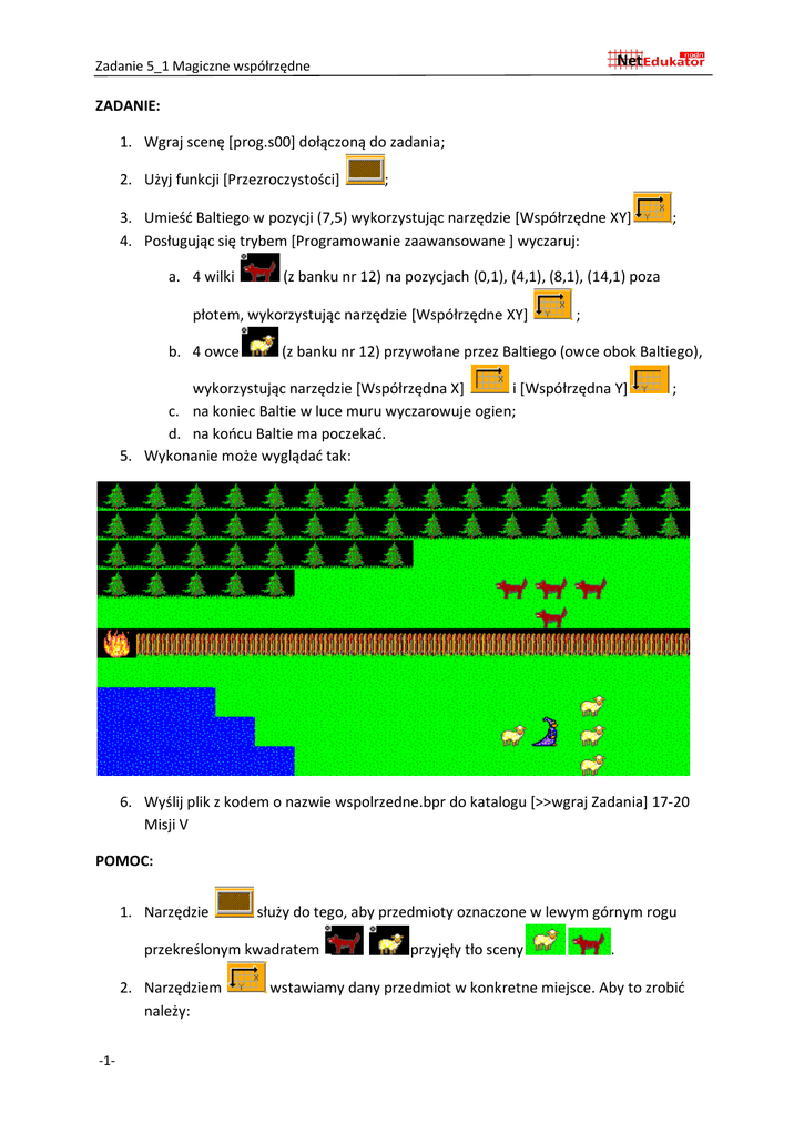 Zadanie 5_1 Magiczne współrzędne ZADANIE: 1. Wgraj scenę [prog.s00] dołączoną do zadania; 2. Użyj funkcji [Przezroczystości] ; 3. Umieść Baltiego w pozycji (7,5) wykorzystując narzędzie [Współrzędne XY] 4. Posługując się trybem [Programowanie zaawansowane ] wyczaruj: a. 4 wilki (z banku nr 12) na pozycjach (0,1), (4,1), (8,1), (14,1) poza płotem, wykorzystując narzędzie [Współrzędne XY] b. 4 owce ; ; (z banku nr 12) przywołane przez Baltiego (owce obok Baltiego), wykorzystując narzędzie [Współrzędna X] i [Współrzędna Y] c. na koniec Baltie w luce muru wyczarowuje ogien; d. na końcu Baltie ma poczekać. 5. Wykonanie może wyglądać tak: ; 6. Wyślij plik z kodem o nazwie wspolrzedne.bpr do katalogu [>>wgraj Zadania] 17-20 Misji V POMOC: 1. Narzędzie służy do tego, aby przedmioty oznaczone w lewym górnym rogu przekreślonym kwadratem 2. Narzędziem należy: -1- przyjęły tło sceny . wstawiamy dany przedmiot w konkretne miejsce. Aby to zrobić Zadanie 5_1 Magiczne współrzędne a. wybrać przedmiot, b. następnie narzędzie [Współrzędne XY] c. określić miejsce na planszy (współrzędne X,Y). Pozycja X obejmuje numery od 0 do 14; pozycja Y od 0 do 9), np: 3. Narzędziem określamy tylko pozycję X (od 0 do 14), względem aktualnej pozycji Baltiego na osi igreków (Y); 4. Narzędziem określamy tylko pozycję Y (od 0 do 9), względem aktualnej pozycji Baltiego na osi ixów (X) 4. Baltiego też można tak przenosić: -2-