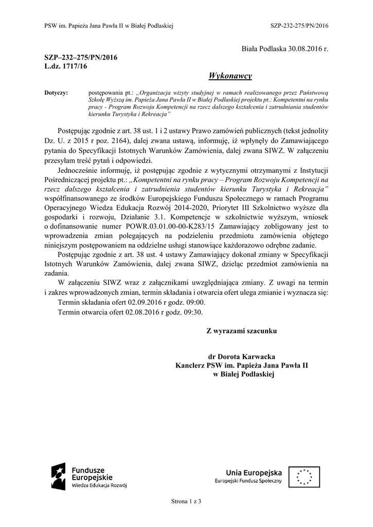 PSW im. Papieża Jana Pawła II w Białej Podlaskiej SZP-232-275/PN/2016 Biała Podlaska 30.08.2016 r. SZP–232–275/PN/2016 L.dz. 1717/16 Wykonawcy Dotyczy: postępowania pt.: „Organizacja wizyty studyjnej w ramach realizowanego przez Państwową Szkołę Wyższą im. Papieża Jana Pawła II w Białej Podlaskiej projektu pt.: Kompetentni na rynku pracy - Program Rozwoju Kompetencji na rzecz dalszego kształcenia i zatrudniania studentów kierunku Turystyka i Rekreacja” Postępując zgodnie z art. 38 ust. 1 i 2 ustawy Prawo zamówień publicznych (tekst jednolity Dz. U. z 2015 r poz. 2164), dalej zwana ustawą, informuję, iż wpłynęły do Zamawiającego pytania do Specyfikacji Istotnych Warunków Zamówienia, dalej zwana SIWZ. W załączeniu przesyłam treść pytań i odpowiedzi. Jednocześnie informuję, iż postępując zgodnie z wytycznymi otrzymanymi z Instytucji Pośredniczącej projektu pt.: „Kompetentni na rynku pracy – Program Rozwoju Kompetencji na rzecz dalszego kształcenia i zatrudnienia studentów kierunku Turystyka i Rekreacja” współfinansowanego ze środków Europejskiego Funduszu Społecznego w ramach Programu Operacyjnego Wiedza Edukacja Rozwój 2014-2020, Priorytet III Szkolnictwo wyższe dla gospodarki i rozwoju, Działanie 3.1. Kompetencje w szkolnictwie wyższym, wniosek o dofinansowanie numer POWR.03.01.00-00-K283/15 Zamawiający zobligowany jest to wprowadzenia zmian polegających na podzieleniu przedmiotu zamówienia objętego niniejszym postępowaniem na oddzielne usługi stanowiące każdorazowo odrębne zadanie. Postępując zgodnie z art. 38 ust. 4 ustawy Zamawiający dokonał zmiany w Specyfikacji Istotnych Warunków Zamówienia, dalej zwana SIWZ, dzieląc przedmiot zamówienia na zadania. W załączeniu SIWZ wraz z załącznikami uwzględniająca zmiany. Z uwagi na termin i zakres wprowadzonych zmian, termin składania i otwarcia ofert ulega zmianie i wyznacza się: Termin składania ofert 02.09.2016 r godz. 09:00. Termin otwarcia ofert 02.08.2016 r godz. 09:30. Z wyrazami szacunku dr Dorota Karwacka Kanclerz PSW im. Papieża Jana Pawła II w Białej Podlaskiej Strona 1 z 3 PSW im. Papieża Jana Pawła II w Białej Podlaskiej SZP-232-275/PN/2016 Treść pisma nr 1 z 03.08.2016 r. Pytanie nr 1 W zawiązku z postępowaniem przetargowym informujemy, że nie ma połączenia bezpośredniego, które mieściłoby się w 7 dniach, tj. 6 noclegach i dolot byłby do 17.00 i powrót do 17.00, więc zapytujemy Zamawiającego, czy dopuszczalne jest wydłużenie pobytu do 8 dni, tj. 7 noclegów, czy może dopuszczalne jest zapewnienie lotu o dowolnych godzinach? Odpowiedź na pismo nr 1 z 03.08.2016 r. Odpowiedź na pytanie nr 1 Zamawiający nie dopuszcza takiego rozwiązania. Treść pisma nr 2 z 04.08.2016 r. Pytanie nr 2 Czy Zamawiający umawiał spotkania i wykłady na Uniwersytecie w Granadzie? Jest okres wakacyjny, a termin złożenia oferty krótki. Pytanie nr 3 Jakim poziomem znajomości języka hiszpańskiego w Skali Rady Europy i ilu letnim doświadczeniem tłumaczenia konsekutywnego powinien wykazać się tłumacz? Odpowiedzi na pismo nr 2 z 04.08.2016 r. Odpowiedź na pytanie nr 2 Zamawiający nie umawiał żadnych spotkań. Odpowiedź na pytanie nr 3 Poziom znajomości języka umożliwiający komunikację między studentami a pracownikami hoteli. Treść pisma nr 3 z 04.08.2016 r. Pytanie nr 4 Proszę o informacje ile godzin w sumie ma trwać dwudniowe spotkanie na Uniwersytecie w Grandzie oraz ile godzin ma trwać spotkanie w Akademickim Biurze Karier? Pytanie nr 5 Chciałabym się dowiedzieć również czy hotele, które grupa ma odwiedzić w ramach wizyt studyjnych mogą znajdować się w Alicante? Odpowiedzi na pismo nr 3 z 04.08.2016 r. Odpowiedź na pytanie nr 4 Łączny czas spotkań 5-6 godz. Odpowiedź na pytanie nr 5 Zamówienie należy zrealizować zgodnie z SIWZ. Strona 2 z 3 PSW im. Papieża Jana Pawła II w Białej Podlaskiej SZP-232-275/PN/2016 Treść pisma nr 4 z 05.08.2016 r. Pytanie nr 6 W podanym prze Państwa terminach nie ma bezpośrednio przelotu do Grenady jeżeli bezpośredni lot to czy jest możliwość przesunięcie wylotu z Hiszpanii o 1 dzień później ? Pytanie nr 7 Czy uczestnicy wyjazdu mogą być zakwaterowani 3 noce w jednym hotelu i 4 noce w innym hotelu ??? Odpowiedzi na pismo nr 4 z 05.08.2016 r. Odpowiedź na pytanie nr 6 Zamawiający dokonał zmiany Opisu przedmiotu zamówienia. Odpowiedź na pytanie nr 7 Nie Treść pisma nr 5 z 05.08.2016 r. Pytanie nr 8 Zamawiający wymaga w SIWZ, aby powrót na lotnisko w Warszawie lub Modlinie nastąpił do godz. 17.00 w terminie pomiędzy 1.09. a 15.09.2016. Jedynym możliwym wariantem jest powrót najwcześniej o godz. 18.50. Czy zamawiający dopuszcza późniejszą godzinę przylotu do Warszawy lub Modlina. Odpowiedź na pismo nr 5 z 05.08.2016 r. Odpowiedź na pytanie nr 8 Zamawiający dokonał zmiany Opisu przedmiotu zamówienia. Treść pisma nr 6 z 05.08.2016 r. Pytanie nr 9 Czy istnieje możliwość wydłużenia wyjazdu o jeden dzień ze względu na brak dostępności połączeń lotniczych zgodnie z Państwa oczekiwaniem. Odpowiedź na pismo nr 6 z 05.08.2016 r. Odpowiedź na pytanie nr 9 Nie Strona 3 z 3