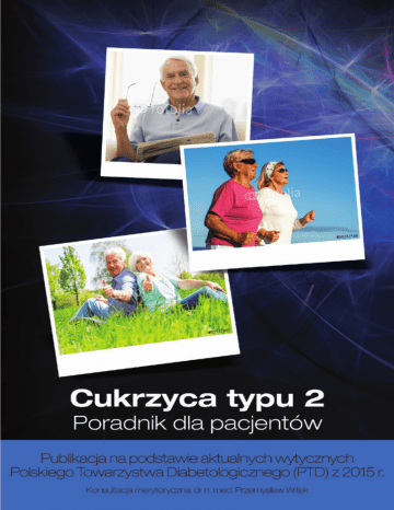 Jak prawidłowo wykonać pomiar stężenia glukozy we krwi glukometrem iXell®? 1 Umyj i osusz ręce. Wyjmij pasek testowy, szczelnie zamknij fiolkę. 2 Włóż pasek do szczeliny glukometru. Na wyświetlaczu kolejno pojawią się symbole: „CH” i pasek testowy temperatura otoczenia, godzina, data i migająca kropla krwi . 3 Wykonaj prawidłowo nakłucie (zgodnie z instrukcją „Jak prawidłowo wykonać nakłucie?”). 4 Podczas gdy na wyświetlaczu miga symbol kropli krwi przyłóż otwór chłonny na szczycie paska testowego do próbki krwi do czasu, aż okienko potwierdzenia całkowicie wypełni się krwią. 5 Po odliczeniu do 0 na wyświetlaczu glukometru pojawi się wynik pomiaru wraz z datą i godziną. Odczyt automatycznie zostanie zapisany w pamięci glukometru. 6 Korzystając z automatycznego wyrzutu usuń zużyty pasek testowy. Glukometr wyłączy się automatycznie. Wyrzuć zużyty pasek testowy i lancet. OFF 2 Spis treści 1. Wprowadzenie 4 2. Słownik podstawowych pojęć 5 3. Definicja cukrzycy 7 4. Rodzaje cukrzycy 7 5. Dlaczego dochodzi do rozwoju cukrzycy typu 2 8 6. Objawy cukrzycy typu 2 10 7. Diagnoza cukrzycy typu 2 12 8. Cele leczenia cukrzycy 14 9. Leczenie cukrzycy typu 2 16 10. Monitorowanie glikemii 17 11. Dieta 24 12. Aktywność fizyczna w cukrzycy 29 13. Doustne leki przeciwcukrzycowe 32 14. Insulina w leczeniu cukrzycy typu 2 33 15. Monitorowanie pacjenta z cukrzycą 34 16. Nadciśnienie tętnicze w cukrzycy 35 17. Zaburzenia lipidowe w cukrzycy 36 18. Ostre powikłania cukrzycy 38 19. Przewlekłe powikłania cukrzycy 41 1 1. Wprowadzenie Jeśli zdiagnozowano cukrzycę u Ciebie lub kogoś z Twoich bliskich, zapewne odczuwasz lęk, a w Twojej głowie kłębi się mnóstwo pytań: • dlaczego choroba wystąpiła? • na czym polega? • jak będzie wyglądało życie z cukrzycą? Zanim spróbujemy pomóc w znalezieniu odpowiedzi na te pytania, ważne byś wiedział, że na cukrzycę choruje w Polsce ponad 3 mln osób. Zdecydowana większość – około 90% to chorzy z cukrzycą typu 2. Zapewne nie jest Ci łatwo przyjąć informacje o chorobie spokojnie i bez emocji. Nie mniej jednak fakt postawienia diagnozy spróbuj potraktować jako pozytywny czynnik – możesz podjąć działania, które zminimalizują ryzyko powikłań choroby. A to właśnie powikłania cukrzycy są najbardziej niebezpiecznym obliczem tej choroby. Ogromny postęp, jaki dokonał się w ostatnich latach w zakresie leczenia i monitorowania cukrzycy, spowodował, że diabetycy cieszą się tak samo barwnym, pełnym wyzwań i możliwości życiem, jak ludzie zdrowi. Uprawiają sport, zdobywają medale, podróżują. PO PROSTU ŻYJĄ! Niniejszy poradnik powstał, by przybliżyć osobom ze świeżo rozpoznaną cukrzycą typu 2 i ich opiekunom podstawowe informacje na temat cukrzycy, objawów, sposobu diagnozy i leczenia. Z lektury poradnika dowiesz się również o roli samokontroli w cukrzycy, ostrych i przewlekłych powikłaniach choroby oraz sposobie zapobiegania im. 2 2. Słownik podstawowych pojęć cholesterol całkowity – cholesterol to związek chemiczny, który bierze udział w powstawaniu hormonów, kwasów żółciowych, witaminy D, jest składnikiem błon komórkowych. Jest niezbędny do funkcjonowania organizmu, ale jego nadmiar powoduje miażdżycę, czyli zwężenie tętnic prowadząc m.in. do choroby wieńcowej. Cholesterol całkowity jest sumą wszystkich rodzajów cholesterolu we krwi cholesterol frakcja HDL – tak zwany „dobry” cholesterol. Wysoki poziom HDL zapobiega miażdżycy naczyń krwionośnych, a tym samym zmniejsza ryzyko zawału serca, czy udaru mózgu cholesterol frakcja LDL – tak zwany „zły” cholesterol. Jego nadmiar odkłada się w ścianach tętnic prowadząc do wzrostu ryzyka chorób sercowo-naczyniowych, np. zawału serca, czy udaru mózgu diabetyk – osoba chorująca na cukrzycę dieta DASH (Dietary Approaches to Stop Hypertension) – dieta nakierowana na zapobieganie i leczenie nadciśnienia. Badania kliniczne potwierdziły, że stosowanie diety DASH powoduje istotne obniżenie ciśnienia tętniczego glikemia – stężenie glukozy we krwi glukoza – cukier prosty otrzymywany w wyniku trawienia spożywanych węglowodanów. Wykorzystywana jest w procesach energetycznych organizmu – jest niezbędna do utrzymania ciepłoty ciała, pracy organów wewnętrznych i mięśni. Utrzymanie poziomu glukozy we krwi regulowane jest przez insulinę hemoglobina glikowana HbA1c – wskaźnik oceny wyrównania cukrzycy, który odzwierciedla średnie stężenie glukozy we krwi w ciągu ostatnich 90 dni hiperglikemia – stan, w którym poziom glukozy we krwi osiąga wartość powyżej normy hipoglikemia – niedocukrzenie, czyli stan, w którym poziom glukozy we krwi osiąga wartość poniżej normy 3 insulina – hormon wydzielany przez komórki beta trzustki. Odpowiada za utrzymanie stałego stężenia glukozy we krwi. Jeśli wydzielanie i/lub działanie insuliny jest zaburzone, wówczas glukoza zamiast trafiać do komórek, pozostaje we krwi, powodując szereg negatywnych następstw określanych jako powikłania cukrzycy jednostki pomiaru glikemii – poziom glikemii może być wyrażony w mg/dl lub mmol/l. W Polsce najczęściej stosuje się jednostkę mg/dl. Chcąc przeliczyć jednostki między sobą należy zastosować przelicznik: 1 mmol/l = 18 mg/dl lipidogram – wynik badania laboratoryjnego określający poziom stężeń we krwi substancji tłuszczowych, czyli lipidów: cholesterolu całkowitego, cholesterolu frakcji HDL i LDL oraz triglicerydów otyłość brzuszna – rodzaj otyłości rozpoznawany na podstawie pomiaru obwodu talii. Otyłość brzuszną u kobiet stwierdza się jeśli obwód talii ≥ 80 cm, zaś u mężczyzn ≥ 94 cm Polskie Towarzystwo Diabetologiczne (PTD) – instytucja zrzeszająca największe autorytety w dziedzinie diabetologii w Polsce. Opracowuje wytyczne dotyczące leczenia cukrzycy, które szczegółowo określ