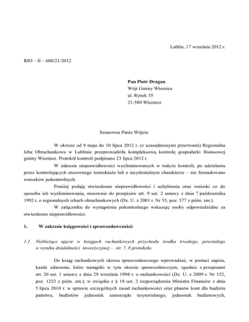 Lublin, 17 września 2012 r. RIO – II – 600/21/2012 Pan Piotr Dragan Wójt Gminy Wisznice ul. Rynek 35 21-580 Wisznice Szanowna Panie Wójcie W okresie od 9 maja do 10 lipca 2012 r. (z uzasadnionymi przerwami) Regionalna Izba Obrachunkowa w Lublinie przeprowadziła kompleksową kontrolę gospodarki finansowej gminy Wisznice. Protokół kontroli podpisano 23 lipca 2012 r. W zakresie nieprawidłowości wyeliminowanych w trakcie kontroli, po udzieleniu przez kontrolujących stosownego instruktażu lub o incydentalnym charakterze – nie formułowano wniosków pokontrolnych. Poniżej podaję stwierdzone nieprawidłowości i uchybienia oraz wnioski co do sposobu ich wyeliminowania, stosownie do przepisów art. 9 ust. 2 ustawy z dnia 7 października 1992 r. o regionalnych izbach obrachunkowych (Dz. U. z 2001 r. Nr 55, poz. 577 z późn. zm.). W załączniku do wystąpienia pokontrolnego wskazuję osoby odpowiedzialne za stwierdzone nieprawidłowości. 1. W zakresie księgowości i sprawozdawczości: 1.1. Niebieżące ujęcie w księgach rachunkowych przychodu środka trwałego, powstałego w wyniku działalności inwestycyjnej – str. 7, 8 protokołu. Do ksiąg rachunkowych okresu sprawozdawczego wprowadzać, w postaci zapisu, każde zdarzenie, które nastąpiło w tym okresie sprawozdawczym, zgodnie z przepisami art. 20 ust. 1 ustawy z dnia 29 września 1994 r. o rachunkowości (Dz. U. z 2009 r. Nr 152, poz. 1223 z późn. zm.), w związku z § 18 ust. 2 rozporządzenia Ministra Finansów z dnia 5 lipca 2010 r. w sprawie szczególnych zasad rachunkowości oraz planów kont dla budżetu państwa, budżetów jednostek samorządu terytorialnego, jednostek budżetowych, samorządowych zakładów budżetowych, państwowych funduszy celowych oraz państwowych jednostek budżetowych mających siedzibę poza granicami Rzeczypospolitej Polskiej (Dz. U. Nr 128, poz. 861 z późn. zm.), zwanego w dalszej części tego wystąpienia „rozporządzeniem Ministra Finansów z dnia 5 lipca 2010 r.” 1.2. Nieprawidłowe sporządzenie sprawozdania Rb-PDP i Rb-27S (rocznego) za 2011 r., przez: - niewyliczenie skutków obniżenia górnej stawki w podatku rolnym dla rowów oraz skutków zwolnienia tych gruntów z podatku rolnego na podstawie uchwały Rady Gminy, - zawyżenie skutków obniżenia górnych stawek w podatku od środków transportowych (o 3.414,65 zł) oraz skutków udzielonych ulg i zwolnień w tym podatku (o 489,25 zł), - zaniżenie skutków decyzji wydanych przez organ podatkowy w zakresie umorzeń zaległości w podatku: od nieruchomości (o 248 zł), rolnym (o 1.973,50 zł) i leśnym (o 62 zł), w wyniku nieujęcia - w tych sprawozdaniach - kwot dotyczących skutków umorzeń zaległości podatkowych udzielonych w 2011 r., a powstałych w latach ubiegłych (ujęto umorzenia zaległości powstałe wyłącznie w 2011 r.). Niewykazanie – w sprawozdaniu Rb-27S za 2011 r. - kwoty 1.544 zł, dotyczącej skutków udzielonych w 2011 r. umorzeń odsetek za zwłokę od zaległości podatkowych powstałych w latach ubiegłych (ujęto umorzenia odsetek za zwłokę od zaległości powstałych wyłącznie w 2011 r.), a także wykazanie - w tym sprawozdaniu - skutków obniżenia górnej stawki w podatku rolnym i leśnym oraz skutków zwolnienia w tych podatkach, na podstawie uchwał Rady Gminy, dla gruntów stanowiących wspólnoty wsi w rozdziale dotyczącym osób prawnych (75615 „Wpływy z podatku rolnego, podatku leśnego, podatku od czynności cywilnoprawnych, podatków i opłat lokalnych od osób prawnych i innych jednostek organizacyjnych”) – str. 14, 15, 29, 30 protokołu. W sprawozdaniu Rb-PDP „Roczne sprawozdanie z wykonania dochodów podatkowych gminy” i Rb-27S „Miesięczne/roczne sprawozdanie z wykonania planu dochodów budżetowych jednostki samorządu terytorialnego” wykazywać kwoty stanowiące rzeczywiste skutki obniżenia górnych stawek podatków, udzielonych przez gminę ulg i zwolnień oraz skutki decyzji wydanych przez organ podatkowy na podstawie ustawy – Ordynacja podatkowa, stosownie do przepisów § 3 ust. 1 pkt 9, 10 i 11 w związku z przepisami § 7 ust. 3 „Instrukcji sporządzania sprawozdań budżetowych w zakresie budżetów jednostek samorządu terytorialnego”, stanowiącej załącznik Nr 39 do rozporządzenia Ministra Finansów z dnia 3 lutego 2010 r. w sprawie sprawozdawczości budżetowej (Dz. U. Nr 20, poz. 103). Przy obliczaniu skutków obniżenia górnych stawek podatkowych (jako różnicy pomiędzy dochodami, jakie gmina mogłaby uzyskać stosując górne stawki podatkowe, a dochodami, jakie powinna uzyskać stosując niższe stawki uchwalone przez Radę Gminy) – wykazywanych w kolumnie „Skutki obniżenia górnych stawek podatków obliczone za okres sprawozdawczy” – uwzględniać wszystkie przedmioty opodatkowania zwolnione z podatku uchwałami Rady Gminy. W kolumnie „Skutki decyzji wydanych przez organ podatkowy na podstawie ustawy – Ordynacja podatkowa, obliczone za okres sprawozdawczy”, w zakresie umorzeń zaległości podatkowych, wykazywać rzeczywiste kwoty, dotyczące skutków udzielonych przez organ podatkowy umorzeń zaległości podatkowych i odsetek za zwłokę za dany okres sprawozdawczy, pamiętając że: - wykazane skutki powinny wynikać z decyzji organu podatkowego w zakresie zarówno bieżących, jak i zaległych należności i być zgodne z rejestrem przypisów i odpisów, stosownie do przepisów § 3 ust. 1 pkt 11 lit. a w związku z § 7 ust. 3 cytowanej „Instrukcji ...”, - kwoty stanowiące skutki umorzenia odsetek za zwłokę od zaległości podatkowych należy wykazywać jedynie w sprawozdaniu Rb-27S w § 0910 „Odsetki od nieterminowych wpłat z tytułu podatków i opłat”, zgodnie z „Klasyfikacją paragrafów dochodów, przychodów i środków”, stanowiącą załącznik Nr 3 do rozporządzenia Ministra Finansów z dnia 2 marca 2010 r. w sprawie szczegółowej klasyfikacji dochodów, wydatków, przy