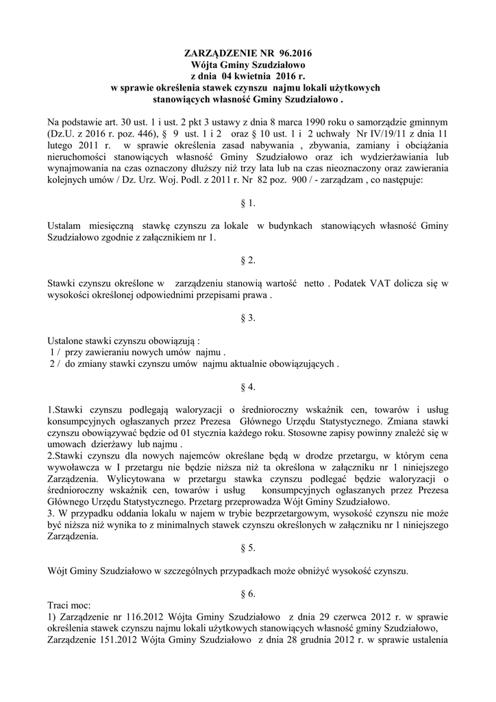 ZARZĄDZENIE NR 96.2016 Wójta Gminy Szudziałowo z dnia 04