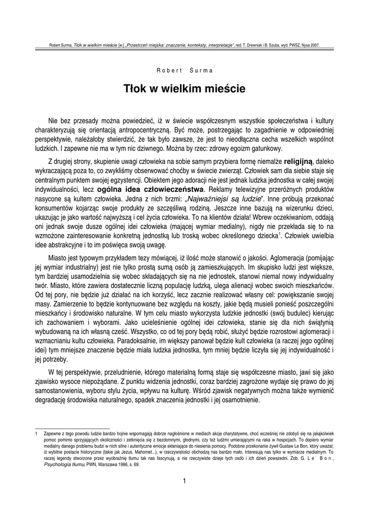 Robert Surma, Tłok w wielkim mieście [w:] „Przestrzeń miejska: znaczenie, konteksty, interpretacje”, red. T. Drewniak i B. Szuba, wyd. PWSZ, Nysa 2007. Robert Surma Tłok w wielkim mieś cie Nie bez przesady można powiedzieć, iż w świecie współczesnym wszystkie społeczeństwa i kultury charakteryzują się orientacją antropocentryczną. Być może, postrzegając to zagadnienie w odpowiedniej perspektywie, należałoby stwierdzić, że tak było zawsze, że jest to nieodłączna cecha wszelkich wspólnot ludzkich. I zapewne nie ma w tym nic dziwnego. Można by rzec: zdrowy egoizm gatunkowy. Z drugiej strony, skupienie uwagi człowieka na sobie samym przybiera formę niemalże religijną, daleko wykraczającą poza to, co zwykliśmy obserwować choćby w świecie zwierząt. Człowiek sam dla siebie staje się centralnym punktem swojej egzystencji. Obiektem jego adoracji nie jest jednak ludzka jednostka w całej swojej indywidualności, lecz ogó lna idea człowieczeń stwa. Reklamy telewizyjne przeróżnych produktów nasycone są kultem człowieka. Jedna z nich brzmi: „Najważniejsi są ludzie”. Inne próbują przekonać konsumentów kojarząc swoje produkty ze szczęśliwą rodziną. Jeszcze inne bazują na wizerunku dzieci, ukazując je jako wartość najwyższą i cel życia człowieka. To na klientów działa! Wbrew oczekiwaniom, oddają oni jednak swoje dusze ogólnej idei człowieka (mającej wymiar medialny), nigdy nie przekłada się to na wzmożone zainteresowanie konkretną jednostką lub troską wobec określonego dziecka 1. Człowiek uwielbia idee abstrakcyjne i to im poświęca swoją uwagę. Miasto jest typowym przykładem tezy mówiącej, iż ilość może stanowić o jakości. Aglomeracja (pomijając jej wymiar industrialny) jest nie tylko prostą sumą osób ją zamieszkujących. Im skupisko ludzi jest większe, tym bardziej usamodzielnia się wobec składających się na nie jednostek, stanowi niemal nowy indywidualny twór. Miasto, które zawiera dostatecznie liczną populację ludzką, ulega alienacji wobec swoich mieszkańców. Od tej pory, nie będzie już działać na ich korzyść, lecz zacznie realizować własny cel: powiększanie swojej masy. Zamierzenie to będzie kontynuowane bez względu na koszty, jakie będą musieli ponieść poszczególni mieszkańcy i środowisko naturalne. W tym celu miasto wykorzysta ludzkie jednostki (swój budulec) kierując ich zachowaniem i wyborami. Jako ucieleśnienie ogólnej idei człowieka, stanie się dla nich świątynią wybudowaną na ich własną cześć. Wszystko, co od tej pory będą robić, służyć będzie rozrostowi aglomeracji i wzmacnianiu kultu człowieka. Paradoksalnie, im większy panował będzie kult człowieka (a raczej jego ogólnej idei) tym mniejsze znaczenie będzie miała ludzka jednostka, tym mniej będzie liczyła się jej indywidualność i jej potrzeby. W tej perspektywie, przeludnienie, którego materialną formą staje się współczesne miasto, jawi się jako zjawisko wysoce niepożądane. Z punktu widzenia jednostki, coraz bardziej zagrożone wydaje się prawo do jej samostanowienia, wyboru stylu życia, wpływu na kulturę. Wśród zjawisk negatywnych można także wymienić degradację środowiska naturalnego, spadek znaczenia jednostki i jej osamotnienie. 1 Zapewne z tego powodu ludzie bardzo hojnie wspomagają dobrze nagłośnione w mediach akcje charytatywne, choć wcześniej nie zdobyli się na jakąkolwiek pomoc pomimo sprzyjających okoliczności i zetknięcia się z bezdomnymi, głodnymi, czy też ludźmi umierającymi na raka w hospicjach. To dopiero wymiar medialny danego problemu budzi w nich silne i autentyczne emocje skłaniające do niesienia pomocy. Podobne przekonanie żywił Gustaw Le Bon, który uważał, iż wybitne postacie historyczne (takie jak Jezus, Mahomet...), w rzeczywistości obchodzą nas bardzo mało. Interesują nas tylko w wymiarze medialnym. To raczej legendy stworzone przez wyobraźnię tłumu tak nas fascynują, a nie rzeczywiste dzieje tych osób i ich dzień powszedni. Zob. G. L e B o n , Psychologia tłumu, PWN, Warszawa 1986, s. 69. 1 Robert Surma, Tłok w wielkim mieście [w:] „Przestrzeń miejska: znaczenie, konteksty, interpretacje”, red. T. Drewniak i B. Szuba, wyd. PWSZ, Nysa 2007. Miasto i jego rozrost Gustaw Le Bon w swoim przełomowym dziele „Psychologia tłumu” na nowo definiuje pojęcie tłumu. Od tej pory nie będzie to już tylko zbiegowisko ludzi w określonym miejscu, ale także zbiór osób połączonych mentalnie przez jakąkolwiek ideę. W świecie współczesnym, medium łączącym mieszkańców miasta jest przede wszystkim telewizja. To już nie rynek staje się miejscem spotkań mieszkańców i przestrzenią dialogu społecznego. Współczesne miasta są zbyt duże, zbyt zasobne w ludzi, aby rynek mógł spełniać swoją tradycyjną rolę znaną choćby z greckiego polis. Telewizja przejęła jego rolę stając się nową platformą łączącą mieszkańców miast i nowym przekaźnikiem treści. Ale także czymś więcej: kreatorem mentalności społecznej. Mieszkańcy miast spotykają się codziennie... w świecie telewizji. Codziennie są widzami tych samych wydarzeń politycznych, sportowych, społecznych. Codziennie wysłuchują także niewiele różniących się w treści wiadomości telewizyjnych, odpowiednio spreparowanych i wyselekcjonowanych. Można pokusić się o stwierdzenie, iż z biegiem czasu wykształca się w nich ta sama perspektywa świata i podobna mentalność. Stają się tłumem. Od tej pory posiadać będą zbieżne cele jednostkowe, podobne pojęcie dobra i zła... i wspólne, często nieuświadomione, tendencje do wspomagania wszelkich inicjatyw mających na celu rozrost skupisk ludzkich. Rozrost jest bowiem prostą i najłatwiej dostępną formą kultu człowieka przez człowieka. A jak mówią reklamy: „Człowiek jest najważniejszy”. Stąd trudno by znaleźć dzisiaj miasta, 