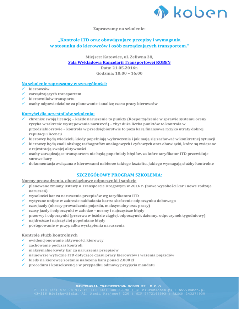 Zapraszamy na szkolenie: „Kontrole ITD oraz obowiązujące przepisy i wymagania w stosunku do kierowców i osób zarządzających transportem.“ Miejsce: Katowice, ul. Żeliwna 38, Sala Wykładowa Kancelarii Transportowej KOBEN Data: 21.05.2016r. Godzina: 10:00 – 16:00 Na szkolenie zapraszamy w szczególności: kierowców zarządzających transportem kierowników transportu osoby odpowiedzialne za planowanie i analizę czasu pracy kierowców Korzyści dla uczestników szkolenia: chronisz swoją licencję – każde naruszenie to punkty (Rozporządzenie w sprawie systemu oceny ryzyka w zakresie występowania naruszeń) – zbyt duża liczba punktów to kontrola w przedsiębiorstwie – kontrola w przedsiębiorstwie to poza karą finansową ryzyko utraty dobrej reputacji i licencji kierowcy będą wiedzieli, kiedy popełniają wykroczenia i jak mają się zachować w konkretnej sytuacji kierowcy będą znali obsługę tachografów analogowych i cyfrowych oraz obowiązki, które są związane z rejestracją swojej aktywności osoby zarządzające transportem nie będą popełniały błędów, za które taryfikator ITD przewiduje surowe kary dokumentacja związana z kierowcami nabierze takiego kształtu, jakiego wymagają służby kontrolne SZCZEGÓŁOWY PROGRAM SZKOLENIA: Normy prowadzenia, obowiązkowe odpoczynki i sankcje planowane zmiany Ustawy o Transporcie Drogowym w 2016 r. (nowe wysokości kar i nowe rodzaje naruszeń) wysokości kar za naruszenia przepisów wg taryfikatora ITD wytyczne unijne w zakresie nakładania kar za skrócenie odpoczynku dobowego czas jazdy (okresy prowadzenia pojazdu, maksymalny czas pracy) czasy jazdy i odpoczynki w załodze – normy i najczęstsze błędy przerwy i odpoczynki (przerwa w jeździe ciągłej, odpoczynek dzienny, odpoczynek tygodniowy) najdroższe i najczęściej popełniane błędy postępowanie w przypadku wystąpienia naruszenia Kontrole służb kontrolnych ewidencjonowanie aktywności kierowcy zachowanie podczas kontroli maksymalne kwoty kar za naruszenia przepisów najnowsze wytyczne ITD dotyczące czasu pracy kierowców i ważenia pojazdów kiedy na kierowcę zostanie nałożona kara ponad 2.000 zł procedura i konsekwencje w przypadku odmowy przyjęcia mandatu KANCELARIA TRANSPORTOWA KOBEN SP. Z O.O. T: +48 (33) 472 08 91, F: +48 (33) 300 30 98 | E: [email protected] | www.koben.pl 43-316 Bielsko-Biała, Al. Armii Krajowej 220 | NIP 5472146593 | REGON 243274930 Dokumentacja i szkolenia obowiązkowe kwalifikacje kierowców zawodowych zaświadczenia dni wolnych – nowe przepisy od marca 2015r. sposoby wypełniania zaświadczeń ewidencja zaświadczeń konieczna dokumentacja wymagana podczas kontroli ITD na drodze Dane cyfrowe – tachograf cyfrowy zasady pobierania danych z tachografów cyfrowych obsługa tachografu cyfrowego – ćwiczenia na symulatorach wpisy manualne / opisy wydruków najczęściej popełniane błędy przy użytkowaniu tachografu cyfrowego zasady rejestrowania aktywności kierowcy w tachografie Wykresówki – tachograf analogowy poprawne uzupełnienie wykresówki wykresówka dla kilku pojazdów wpisy ręczne najczęściej popełniane błędy związane z wykresówkami, zagrożone karą z taryfikatora System Elektronicznego poboru opłat ViaToll podstawy prawne procedury kontrolne zasada działania odpowiedzialność i sankcje za nieopłacenie lub opłacenie w niepełnej wysokości Szkolenie przeprowadzą: Inspektor Transportu Drogowego - specjalista w zakresie prawa transportowego, najnowszych regulacji prawnych związanych z transportem drogowym, mocowania ładunków, przewozu towarów niebezpiecznych, inspektor z wieloletnim stażem w służbie czynnej. Jego ogromne doświadczenie praktycznej znajomości przepisów pozwala rozwiązać nawet najbardziej zawiłe przypadki prawa transportowego Ekspert Kancelarii Transportowej KOBEN w zakresie analizy i rozliczania czasu pracy kierowców, naliczania wynagrodzeń oraz innych świadczeń ze stosunku pracy, praktyk prawa transportowego, trener z bogatym doświadczeniem praktycznym, absolwent uczelni ekonomicznej, wykładowca wielu renomowanych ośrodków szkoleniowych, autor licznych artykułów z zakresu czasu pracy kierowców. Zajmuje się obroną przewoźników przed niesłusznie nałożonymi karami przez polskie i zagraniczne służby kontrolne, przygotowuje firmy do kontroli służb kontrolnych, doradza jak nie zabłądzić w gąszczu zmieniających się przepisów w dziedzinie transportu. Warunki uczestnictwa: Koszt szkolenia 249,00 zł netto za osobę (+23% VAT) RABAT 10% - przy zgłoszeniu do dnia 15.05.2016r.* RABAT 10% - przy zgłoszeniu więcej niż jednej osoby z tej samej firmy* Przy zgłoszeniu większej ilości uczestników cena szkolenia ustalana jest indywidualnie Cena obejmuje: udział w szkoleniu, autorskie materiały szkoleniowe i pomocnicze, certyfikat uczestnictwa, przerwy kawowe oraz parking. W przerwach jak i po szkoleniu każdy uczestnik ma możliwość rozmowy z ekspertami na tematy związane z zakresem szkolenia. *rabaty sumują się KANCELARIA TRANSPORTOWA KOBEN SP. Z O.O. T: +48 (33) 472 08 91, F: +48 (33) 300 30 98 | E: [email protected] | www.koben.pl 43-316 Bielsko-Biała, Al. Armii Krajowej 220 | NIP 5472146593 | REGON 243274930