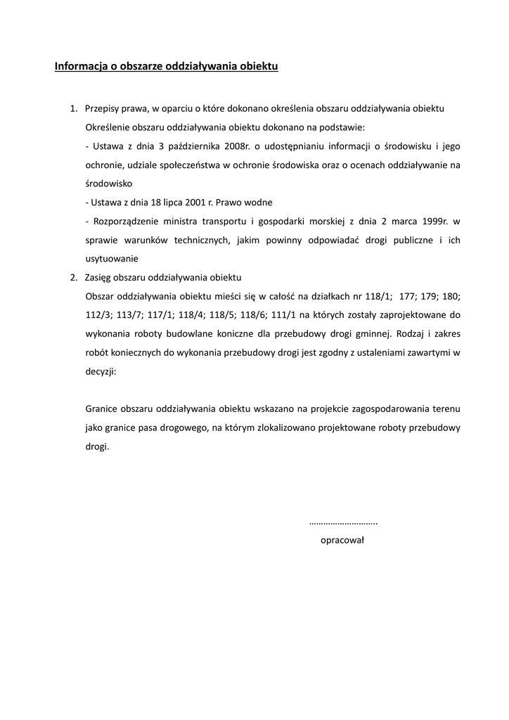 Informacja o obszarze oddziaływania obiektu 1. Przepisy prawa, w oparciu o które dokonano określenia obszaru oddziaływania obiektu Określenie obszaru oddziaływania obiektu dokonano na podstawie: - Ustawa z dnia 3 października 2008r. o udostępnianiu informacji o środowisku i jego ochronie, udziale społeczeństwa w ochronie środowiska oraz o ocenach oddziaływanie na środowisko - Ustawa z dnia 18 lipca 2001 r. Prawo wodne - Rozporządzenie ministra transportu i gospodarki morskiej z dnia 2 marca 1999r. w sprawie warunków technicznych, jakim powinny odpowiadać drogi publiczne i ich usytuowanie 2. Zasięg obszaru oddziaływania obiektu Obszar oddziaływania obiektu mieści się w całość na działkach nr 118/1; 177; 179; 180; 112/3; 113/7; 117/1; 118/4; 118/5; 118/6; 111/1 na których zostały zaprojektowane do wykonania roboty budowlane koniczne dla przebudowy drogi gminnej. Rodzaj i zakres robót koniecznych do wykonania przebudowy drogi jest zgodny z ustaleniami zawartymi w decyzji: Granice obszaru oddziaływania obiektu wskazano na projekcie zagospodarowania terenu jako granice pasa drogowego, na którym zlokalizowano projektowane roboty przebudowy drogi. ……………………….. opracował
