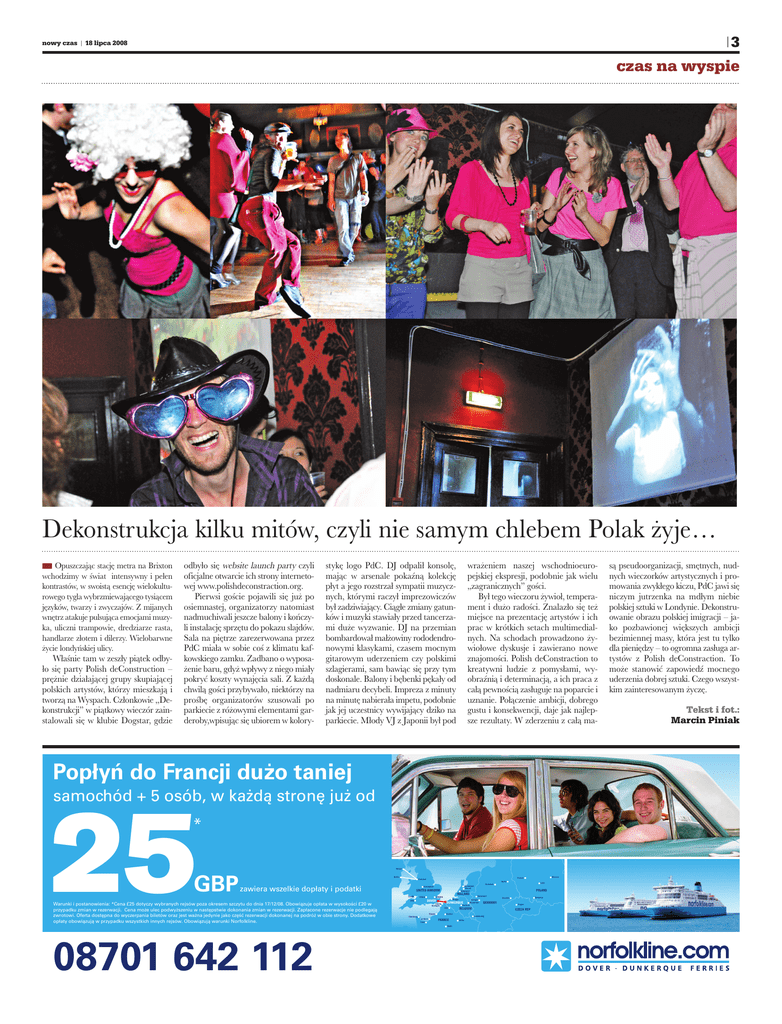 |3 nowy czas | 18 lipca 2008 czas na wyspie Dekonstrukcja kilku mitów, czyli nie samym chlebem Polak żyje… Opuszczając stację metra na Brixton wchodzimy w świat intensywny i pełen kontrastów, w swoistą esencję wielokulturowego tygla wybrzmiewającego tysiącem języków, twarzy i zwyczajów. Z mijanych wnętrz atakuje pulsująca emocjami muzyka, uliczni trampowie, dredziarze rasta, handlarze złotem i dilerzy. Wielobarwne życie londyńskiej ulicy. Właśnie tam w zeszły piątek odbyło się party Polish deConstruction – prężnie działającej grupy skupiającej polskich artystów, którzy mieszkają i tworzą na Wyspach. Członkowie „Dekonstrukcji” w piątkowy wieczór zainstalowali się w klubie Dogstar, gdzie odbyło się website launch party czyli oficjalne otwarcie ich strony internetowej www.polishdeconstraction.org. Pierwsi goście pojawili się już po osiemnastej, organizatorzy natomiast nadmuchiwali jeszcze balony i kończyli instalację sprzętu do pokazu slajdów. Sala na piętrze zarezerwowana przez PdC miała w sobie coś z klimatu kafkowskiego zamku. Zadbano o wyposażenie baru, gdyż wpływy z niego miały pokryć koszty wynajęcia sali. Z każdą chwilą gości przybywało, niektórzy na prośbę organizatorów szusowali po parkiecie z różowymi elementami garderoby,wpisując się ubiorem w kolory- stykę logo PdC. DJ odpalił konsolę, mając w arsenale pokaźną kolekcję płyt a jego rozstrzał sympatii muzycznych, którymi raczył imprezowiczów był zadziwiający. Ciągłe zmiany gatunków i muzyki stawiały przed tancerzami duże wyzwanie. DJ na przemian bombardował małżowiny rododendronowymi klasykami, czasem mocnym gitarowym uderzeniem czy polskimi szlagierami, sam bawiąc się przy tym doskonale. Balony i bębenki pękały od nadmiaru decybeli. Impreza z minuty na minutę nabierała impetu, podobnie jak jej uczestnicy wywijający dziko na parkiecie. Młody VJ z Japonii był pod wrażeniem naszej wschodnioeuropejskiej ekspresji, podobnie jak wielu „zagranicznych” gości. Był tego wieczoru żywioł, temperament i dużo radości. Znalazło się też miejsce na prezentację artystów i ich prac w krótkich setach multimedialnych. Na schodach prowadzono żywiołowe dyskusje i zawierano nowe znajomości. Polish deConstraction to kreatywni ludzie z pomysłami, wyobraźnią i determinacją, a ich praca z całą pewnością zasługuje na poparcie i uznanie. Połączenie ambicji, dobrego gustu i konsekwencji, daje jak najlepsze rezultaty. W zderzeniu z całą ma- 0OPYÈ DO &RANCJI DUO TANIEJ SAMOCHÊD OSÊB W KAD STRONÁ JU OD 25 '"0 Belfast Dublin Berlin 7ARUNKI I POSTANOWIENIA #ENA ã DOTYCZY WYBRANYCH REJSÊW POZA OKRESEM SZCZYTU DO DNIA /BOWIZUJE OPATA W WYSOKOuCI ã W PRZYPADKU ZMIAN W REZERWACJI #ENA MOE ULEC PODWYSZENIU W NASTÁPSTWIE DOKONANIA ZMIAN W REZERWACJI :APACONE REZERWACJE NIE PODLEGAJ ZWROTOWI /FERTA DOSTÁPNA DO WYCZERPANIA BILETÊW ORAZ JEST WANA JEDYNIE JAKO CZÁu½ REZERWACJI DOKONANEJ NA PODRÊ W OBIE STRONY $ODATKOWE OPATY OBOWIZUJ W PRZYPADKU WSZYSTKICH INNYCH REJSÊW /BOWIZUJ WARUNKI .ORFOLKLINE Lodz Hannover Amsterdam Utrecht Rotterdam Birmingham UNITED KINGDOM POLAND HOLLAND Cardiff Oxford Düsseldorf LONDON Brugge DOVER Bath Calais Boulogne Lille Dieppe Cologne Maastricht Brussels DUNKERQUE GERMANY BELGIUM Luxembourg Le Havre Caen FRANCE Reims Katowice Dresden Prague CZECH REP Amiens Cherbourg PARIS Warsaw Poznan Liverpool ZAWIERA WSZELKIE DOPATY I PODATKI są pseudoorganizacji, smętnych, nudnych wieczorków artystycznych i promowania zwykłego kiczu, PdC jawi się niczym jutrzenka na mdłym niebie polskiej sztuki w Londynie. Dekonstruowanie obrazu polskiej imigracji – jako pozbawionej większych ambicji bezimiennej masy, która jest tu tylko dla pieniędzy – to ogromna zasługa artystów z Polish deConstraction. To może stanowić zapowiedź mocnego uderzenia dobrej sztuki. Czego wszystkim zainteresowanym życzę. Tekst i fot.: Marcin Piniak