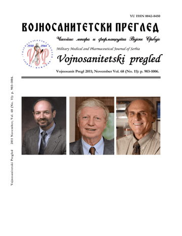 YU ISSN 0042-8450 VOJNOSANITETSKI PREGLED ^asopis lekara i farmaceuta Vojske Srbije Military Medical and Pharmaceutical Journal of Serbia Vojnosanitetski pregled Vojnosanitetski Pregled 2011 November; Vol. 68 (No. 11): p. 903–1006. Vojnosanit Pregl 2011; November Vol. 68 (No. 11): p. 903-1006. YU ISSN 0042-8450 vol. 68, br. 11, 2011. VOJNOSANITETSKI PREGLED Prvi broj Vojnosanitetskog pregleda izašao je septembra meseca 1944. godine Časopis nastavlja tradiciju Vojno-sanitetskog glasnika, koji je izlazio od 1930. do 1941. godine IZDAVAČ Uprava za vojno zdravstvo MO Srbije IZDAVAČKI SAVET prof. dr sc. pharm. Mirjana Antunović prof. dr sc. med. Snežana Cerović prof. dr sc. med. Dragan Dinčić, puk. prof. dr sc. med. Zoran Hajduković, puk. dr Mladen Milivojević, puk. prof. dr sc. med. Marijan Novaković, puk. prof. dr sc. med. Zoran Popović, puk prof. dr sc. med. Predrag Romić, puk. prim. dr Stevan Sikimić, puk. doc. dr Veljko Todorović, brigadni general (predsednik) MEĐUNARODNI UREĐIVAČKI ODBOR Prof. Andrej Aleksandrov (Russia) Assoc. Prof. Kiyoshi Ameno (Japan) Prof. Rocco Bellantone (Italy) Prof. Hanoch Hod (Israel) Prof. Abu-Elmagd Kareem (USA) Prof. Hiroshi Kinoshita (Japan) Prof. Celestino Pio Lombardi (Italy) Prof. Philippe Morel (Switzerland) Prof. Kiyotaka Okuno (Japan) Prof. Stane Repše (Slovenia) Prof. Mitchell B. Sheinkop (USA) Prof. Hitoshi Shiozaki (Japan) Prof. H. Ralph Schumacher (USA) Prof. Miodrag Stojković (UK) Assist. Prof. Tibor Tot (Sweden) UREĐIVAČKI ODBOR Glavni i odgovorni urednik prof. dr sc. pharm. Silva Dobrić Urednici: prof. dr sc. med. Bela Balint prof. dr sc. stom. Zlata Brkić prof. dr sc. med. Snežana Cerović akademik Miodrag Čolić, puk. akademik Radoje Čolović prof. dr sc. med. Aleksandar Đurović, puk. doc. dr sc. med. Branka Đurović prof. dr sc. med. Borisav Janković doc. dr sc. med. Lidija Kandolf-Sekulović akademik Vladimir Kanjuh akademik Vladimir Kostić prof. dr sc. med. Zvonko Magić prof. dr sc. med. Đoko Maksić, puk. doc. dr sc. med. Gordana Mandić-Gajić prof. dr sc. med. Dragan Mikić, puk. prof. dr sc. med. Darko Mirković doc. dr sc. med. Slobodan Obradović, major akademik Miodrag Ostojić prof. dr sc. med. Predrag Peško, FACS akademik Đorđe Radak prof. dr sc. med. Ranko Raičević, puk. prof. dr sc. med. Predrag Romić, puk. prof. dr sc. med. Vojkan Stanić, puk. doc. dr sc. med. Dara Stefanović prof. dr sc. med. Dušan Stefanović, puk. prof. dr sc. med. Vesna Šuljagić prof. dr sc. stom. Ljubomir Todorović prof. dr sc. med. Milan Višnjić prof. dr sc. med. Slavica Vučinić Tehnički sekretari uređivačkog odbora dr sc. Aleksandra Gogić, dr Maja Marković REDAKCIJA mr sc. med. dr Sonja Andrić-Krivokuća, dr sc. Aleksandra Gogić, dr Snežana Janković, dr Maja Marković Tehnički urednik: Milan Perovanović Redaktor za srpski i engleski jezik: Dragana Mučibabić, prof. Korektori: Ljiljana Milenović, Brana Savić Kompjutersko-grafička obrada: Vesna Totić, Jelena Vasilj, Snežana Ćujić Adresa redakcije: Vojnomedicinska akademija, Institut za naučne informacije, Crnotravska 17, poštanski fah 33–55, 11040 Beograd, Srbija. Telefoni: glavni i odgovorni urednik 3609 311, tehnički sekretar 3608 943, redakcija 3609 479 i 3609 179, pretplata 3608 997. Faks 2669 689. E-mail (redakcija): [email protected] Radove objavljene u „Vojnosanitetskom pregledu“ indeksiraju: Science Citation Index Expanded (SCIE), Journal Citation Reports/Science Edition, Index Medicus (Medline), Excerpta Medica (EMBASE), EBSCO, Biomedicina Serbica. Sadržaje objavljuju Giornale di Medicine Militare i Revista de Medicina Militara. Prikaze originalnih radova i izvoda iz sadržaja objavljuje International Review of the Armed Forces Medical Services. Časopis izlazi dvanaest puta godišnje. Pretplate: žiro račun kod Uprave za javna plaćanja u Beogradu br. 840-941621-02 – VMA (za Vojnosanitetski pregled), PIB 102116082. Za pretplatu iz inostranstva obratiti se službi pretplate na tel. 3608 997. Godišnja pretplata: 4 000 dinara za građane Srbije, 8 000 dinara za ustanove iz Srbije i 150 € (u dinarskoj protivvrednosti na dan uplate) za pretplatnike iz inostranstva. Kopiju uplatnice dostaviti na gornju adresu. Štampa Vojna štamparija, Beograd, Resavska 40 b. YU ISSN 0042-8450 vol. 68 No. 11, 2011 VOJNOSANITETSKI PREGLED The first issue of Vojnosanitetski pregled was published in September 1944 The Journal continues the tradition of Vojno-sanitetski glasnik which was published between 1930 and 1941 PUBLISHER Military Health Department, Ministry of Defence, Serbia PUBLISHER’S ADVISORY BOARD Assoc. Prof. Mirjana Antunović, BPharm, PhD Assoc. Prof. Snežana Cerović, MD, PhD Col. Assoc. Prof. Dragan Dinčić, MD, PhD Col. Assoc. Prof. Zoran Hajduković, MD, PhD Col. Mladen Milivojević, MD Col. Prof. Marijan Novaković, MD, PhD Col. Prof. Zoran Popović, MD, PhD Col. Prof. Predrag Romić, MD, PhD Brigadier General Assist. Prof. Veljko Todorović, MD. PhD (Chairman) INTERNATIONAL EDITORIAL BOARD Prof. Andrej Aleksandrov (Russia) Assoc. Prof. Kiyoshi Ameno (Japan) Prof. Rocco Bellantone (Italy) Prof. Hanoch Hod (Israel) Prof. Abu-Elmagd Kareem (USA) Prof. Hiroshi Kinoshita (Japan) Prof. Celestino Pio Lombardi (Italy) Prof. Philippe Morel (Switzerland) Prof. Kiyotaka Okuno (Japan) Prof. Stane Repše (Slovenia) Prof. Mitchell B. Sheinkop (USA) Prof. Hitoshi Shiozaki (Japan) Prof. H. Ralph Schumacher (USA) Prof. Miodrag Stojković (UK) Assist. Prof. Tibor Tot (Sweden) EDITORIAL BOARD Editor-in-chief Prof. Silva Dobrić, BPharm, PhD Co-editors: Prof. Bela Balint, MD, PhD Assoc. Prof. Zlata Brkić, DDM, PhD Assoc. Prof. Snežana Cerović, MD, PhD Col. Prof. Miodrag Čolić, MD, PhD, MSAAS Prof. Radoje Čolović, MD, PhD, MSAAS Col. Assoc. Prof. Aleksandar Đurović, MD, PhD Assist. Prof. Branka Đurović, MD, PhD Prof. Borisav Janković, MD, PhD Assist. Prof. Lidija Kandolf-Sekulović, MD, PhD Prof. Vladimir Kanjuh, MD, 
