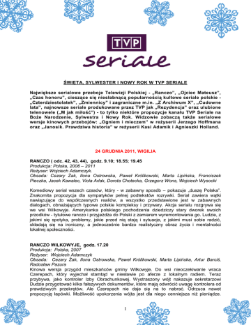 ŚWIĘTA, SYLWESTER I NOWY ROK W TVP SERIALE Największe serialowe przeboje Telewizji Polskiej - „Ranczo”, „Ojciec Mateusz”, „Czas honoru”, cieszące się niesłabnącą popularnością kultowe seriale polskie „Czterdziestolatek”, „Zmiennicy” i zagraniczne m.in. „Z Archiwum X”, „Cudowne lata”, najnowsze seriale produkowane przez TVP jak „Rezydencja” oraz ulubione telenowele („M jak miłość”) - to tylko niektóre propozycje kanału TVP Seriale na BoŜe Narodzenie, Sylwestra i Nowy Rok. Widzowie zobaczą takŜe serialowe wersje kinowych przebojów: „Ogniem i mieczem” w reŜyserii Jerzego Hoffmana oraz „Janosik. Prawdziwa historia” w reŜyserii Kasi Adamik i Agnieszki Holland. 24 GRUDNIA 2011, WIGILIA RANCZO ( odc. 42, 43, 44), godz. 9.10; 18.55; 19.45 Produkcja: Polska, 2006 – 2011 ReŜyser: Wojciech Adamczyk. Obsada: Cezary śak, Ilona Ostrowska, Paweł Królikowski, Marta Lipińska, Franciszek Pieczka, Jacek Kawalec, Viola Arlak, Dorota Chotecka, Grzegorz Wons, Wojciech Wysocki Komediowy serial wszech czasów, który - w zabawny sposób – pokazuje „duszę Polaka”. Znakomita propozycja dla sympatyków pełnej podtekstów rozrywki. Serial zawiera wątki nawiązujące do współczesnych realiów, a wszystko przedstawione jest w zabawnych dialogach, obnaŜających typowe polskie kompleksy i przywary. Akcja serialu rozgrywa się we wsi Wilkowyje. Amerykanka polskiego pochodzenia dziedziczy stary dworek swoich przodków - tytułowe ranczo i przyjeŜdŜa do Polski z zamiarem wyremontowania go. Ludzie, z jakimi się spotyka, problemy, jakie przed nią stają i sytuacje, z jakimi musi sobie radzić, składają się na ironiczny, a jednocześnie bardzo realistyczny obraz Ŝycia i mentalności lokalnej społeczności. RANCZO WILKOWYJE, godz. 17.20 Produkcja: Polska, 2007 ReŜyser: Wojciech Adamczyk Obsada: Cezary śak, Ilona Ostrowska, Paweł Królikowski, Marta Lipińska, Artur Barciś, Radosław Pazura Kinowa wersja przygód mieszkańców gminy Wilkowyje. Do wsi nieoczekiwanie wraca Czerepach, który wyjechał stamtąd w niesławie po aferze z lokalnym radiem. Teraz przybywa, jako kontroler Izby Obrachunkowej. Wystraszony wójt nakazuje sekretarzowi Dudzie przygotować kilka fałszywych dokumentów, które mają odwrócić uwagę kontrolera od prawdziwych przekrętów. Ale Czerepach nie daje się na to nabrać. Odrzuca nawet propozycję łapówki. MoŜliwość upokorzenia wójta jest dla niego cenniejsza niŜ pieniądze. 1 Wójt dochodzi do wniosku, Ŝe jedynym sposobem pozbycia się dociekliwego kontrolera będzie zabicie go. Lucy i Kusy cieszą się swoją miłością. Idyllę zakłóca im Czerepach, który poszukuje u nich pokoju na czas kontroli w gminie. Ale na tym nie kończą się przykre niespodzianki. Oto, bowiem pewnego dnia w domu Lucy zjawia się kolejny nieproszony gość - jej były mąŜ Louis. Bywalcy ławeczki mają ciągłe problemy ze zdobyciem pieniędzy na alkohol, a sklepowa Więcławska uparcie odmawia sprzedaŜy na krechę. Postanawiają zatem otworzyć swoją budkę z piwem. Dostają nawet niezbędne dofinansowanie z urzędu gminy. CZARNE CHMURY (odc. 3), godz. 10.10 Produkcja: Polska, 1973 ReŜyser: Andrzej Konic Obsada: Leonard Pietraszak, Ryszard Pietruski, Mariusz Dmochowski, ElŜbieta Starostecka, Anna Seniuk Polski Fanfan - pierwszy polski serial spod znaku „płaszcza i szpady” – tak pisano o „Czarnych chmurach” w prasie lat 70. Osią fabuły stały się dramatyczne epizody z walk o utrzymanie przy Polsce Prus KsiąŜęcych. Pozostawały one w lennej zaleŜności od Rzeczypospolitej od 1525 r., kiedy Albrecht Hohenzollern złoŜył w Krakowie hołd królowi polskiemu. W XVII wieku ziemie te przypadły elektorowi brandenburskiemu. Polska była wówczas krajem wolności szlacheckich, w Prusach szlachcie wiodło się znacznie gorzej. Na czele opozycji przeciwko elektorowi stanął pułkownik Krystian Ludwik Kalkstein - Stoliński. W 1670 r. musiał on uciekać z Prus do Polski. Burzliwe dzieje Kalksteina - Stolińskiego stały się osnową scenariusza serialu. To film akcji, awanturniczo-przygodowy. Na pierwszy plan wysuwają się ucieczki, pogonie, pojedynki, intrygi i oczywiście miłość. ZMIENNICY (odc. 2), godz. 11.00 Produkcja: Polska, 1986 ReŜyser: Stanisław Bareja Obsada: Ewa Błaszczyk, Mieczysław Hryniewicz, Bronisław Pawlik, Piotr Pęgowski, Irena Kwiatkowska Młoda dziewczyna w przebraniu męŜczyzny zatrudnia się jako kierowca w Warszawskim Przedsiębiorstwie Taksówkowym. Tylko w ten sposób moŜe otrzymać posadę. Wraz ze swoim zmiennikiem jeździ taksówką po Warszawie. Świat zza szyb „taryfy” wygląda czasem śmiesznie, czasem groteskowo, a niekiedy tragikomicznie. JANOSIK. PRAWDZIWA HISTORIA (odc. 1, 2), godz. 12.00 Produkcja: Polska, Węgry, Czechy, Słowacja, 2009 ReŜyser: Kasia Adamik, Agnieszka Holland Obsada: Václav Jiráček, Ivan Martinka, Michał śebrowski Młody góral Janosik, Ŝołnierz powstańczej armii Rakoczego, podczas jednej z potyczek dostaje się do niewoli i zostaje wcielony do cesarskiej armii. Swoją słuŜbę zaczyna w twierdzy, w której uwięziony jest słynny przywódca zbójników Tomasz Uhorczyk. Między dwoma góralami szybko zawiązuje się nić sympatii. Janosik pomaga uciec Tomaszowi, a tamten w podzięce daje ojcu Janosika pieniądze na wykup syna z cesarskiego wojska. Po wojnie Janosik wraca do rodzinnego domu i zakochuje się. Niestety, ukochana wybiera 2 innego. Wypalony wojną, zawiedziony w miłości, nie moŜe sobie znaleźć miejsca. Odnajduje go Tomasz, który namawia Janosika do przystąpienia do swojej bandy - sam chce zrezygnować ze zbójowania. Janosik odmawia i postanawia zostać juhasem. Podstępem zwabiony do bandy, Janosik wkrótce zostaje jej przywódcą i zaczyna się cieszyć sławą dzielnego zbójnika, który przestrzega honorowego kodeksu - nikt z napadniętych nie moŜe zginąć ….. MIŁOŚĆ, HONOR I POSŁUSZEŃST