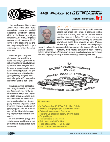 Magazyn Klubowy Nr 2 VW Polo Klub Polska styczeń marzec 2010 r. Już niebawem 3 czerwca OFF TOPIK 201 0 roku cała brać poloPropozycja poprowadzenia gazetki klubowej maniaków ruszy na podbój spadła na mnie jak grom z jasnego nieba. Kozienic. Będziemy obchoOtrzymałem szereg doznań w postaci zaskodzić V Jubileuszowy Ogólczenia, radości i lęku. W końcu nie na co nopolski Zlot klubu. Impreza dzień mam okazję zajmować się na poważnie potrwa do 6 czerwca 201 0r czymś, co może być czytane w całej Polsce. czyli 4 dni spędzone w groSłowo się rzekło i po wielu nieprzespanych nie wspaniałych ludzi - ponocach udało się doprowadzić ten numer do końca. Sporo tutaj siadaczy wspaniałych samoWaszej zasługi i pomocy, bez której powstanie tego numeru chodów. byłoby niemożliwe. Zapraszam zatem do chwilowego porzucenia forum i pogarążeniu się w mam nadzieję ciekawej lekturze. Ośrodek położony nad Artpolo Jeziorem Kozienickim, w lesie sosnowym, posiada atrakcyjną ofertę turystyczną i sportową oraz miejsca noclegowe w pensjonacie, domkach campingowych i na polu namiotowym. Dla każdego wystarczy miejsca również dla tych, którzy wpadną na chwilę zrobić ach i och. Trwają ostatnie gorączkowe przygotowania do imprezy. Jedni polerują ranty, codziennie woskują inni dopiero kładą lakier. Jeszcze inni może dojadą na słowo honoru. Ważne jednak, że dojadą. Na dwa tygodnie przed imprezą zaczęły się tworzyć grupy wypadowe. W kolumnie raźniej i trudniej zgubić się między dziurami na drogach. W tym ostatnim przypadku zglebione polówki winny być pilotowane przez jakieś auto terenowe. W numerze: - V Ogólnopolski Zlot VW Polo Klub Polska - Wywiad z największym spamerem forum - Cotygodniowe spoty: Szczecin - Raport: Co zrobiłem dziś w swoim aucie - Grupa Śląsk - Podkarpacie rośnie w siłę - Polo stycznia 201 0- d4ri0 - Polo lutego 201 0 - TOFIK_6n2 - Polo marca 201 0 - dzienciol VW Polo Klub Polska 1 PATRONAT HONOROWY PLAN V OGÓLNOPOLSKIEGO ZLOTU DZIEŃ PIERWSZY – 3 CZERWIEC 201 0 (CZWARTEK): 1 5:00 - Przyjazd uczestników Zlotu i zakwaterowanie się. 20:00 - Oficjalnie otwarcie Zlotu. DZIEŃ DRUGI – 4 CZERWIEC 201 0 (PIĄTEK): 9:00 – Turniej Piłki Nożnej. 1 2:00 – Rzut oponą, felgą. 1 3:30 – Przerwa obiadowa. 1 5:30 – Konkurs dla Par oraz Dance Dance Revolution. 1 9:00 – Czas wolny. 21 :00 – Ognisko oraz Karaoke Night. PATRONAT MEDIALNY DZIEŃ TRZECI – 5 CZERWIEC 201 0 (SOBOTA): 9:00 – Turniej Piłki Siatkowej 1 2:00 – Plac Manewrowy 1 4:00 – Przerwa obiadowa. 1 5:00 – Uroczysty Przejazd VW Polo Klub Polska przez miasto. 1 7:00 – Mega rowerek. 1 8:00 – Czas wolny. 21 :00 – Impreza pożegnalna. Wyniki konkursów i wręczenie nagród. DZIEŃ CZWARTY – 6 CZERWIEC 201 0 (NIEDZIELA): Odpoczywamy, wspominamy dobrą zabawę i żegnamy się. Do godziny 1 4:00 musimy zdać wszystkie domki i mieszkania w hotelu. WYWIADY: Rozmowa z największym spamerem forum - Rat 4 Artpolo: Co skłoniło cię do pobicia rekordu postów na forum PKP? Rat4: Powiem Ci szczerze, że nie myslałem o tym, że pobije jakiś rekord. Nie zależy i nie zależało mi na tym, tak jakoś wyszło. Co do funkcji "Pomógł", która kiedyś była dostępna to powiem, że zależało mi aby zebrać trochę punkcików, tak dla własnej satysfakcji. Forum padło i tak nie dziala. Artpolo: Przecież musi być jakaś przyczyna - coś co powoduje, że poświę-casz swój cenny czas wyjaśniając innym to i owo. Nie masz nic przeciwko, że przejdziemy na Ty? VW Polo Klub Polska 2 Rat4: No pewnie. Nie patrzyłem nigdy z tej perspektywy. Może lubię pomagać. Dużo by tu gadać. Powiem Ci, że z tym forum to tak dziwnie wyszło. Najpierw byłem na forum hondy 4generacji z racji tego, że posiadałem hondę z '88 roku, która miała prawo być już trochę awaryjna i tak się to zaczęło z pisaniem postów. Przy okazji pozdrawiam wszystkich maniaków hondy 4 generacji.:) Zrobiłem tam chyba jednego tutoriala z tego co pamiętam i do dziś się tam znajduje. Motoryzacja od kuchni mnie zawsze interesowała i bardzo mnie cieszy jak coś naprawię lub też jak komuś coś wyjaśnię Pomimo tego, że wykształcenie mam całkiem inne i w sumie nie powinienem brać głosu w pewnych kwestiach to pomimo tego jeśli coś wiem na 1 00% czy też miałem podobny problem to go zwyczajnie opisuje, a nóż widelec komuś się to przyda rozwiązanie. A ten wolny czas, no to mam go na razie na tyle, że mogę się jakoś udzielać. To działa troszkę jak hobby, nawet jeśli tego czasu nie masz to znajdujesz chwilę aby się tym zająć, choć ostatnio miałem inne obowiązki i forum poszło na terminową odstawkę i już nie jestem taki aktywny. Artpolo: Przebywając na forum czujesz się kiem, a tego nie znoszę :) Artpolo: Co czujesz gdy forum nie działa? Rat4: Zastanawiam się na co zostały przezna- czone pieniądze przesłane przez klubowiczów, a tak na serio to czuję się troszkę zawiedziony, że nie działa i tłumaczę sobie, że forum też musi kiedyś odpocząć :) Artpolo: Czy widzisz jakieś sensowne rozwią- zanie aby wszystko działało jak najlepiej? Odwiedzających coraz więcej więc i obciążenie rośnie. Rat4: Z punktu widzenia użytkownika, który nie miał do czynienia z prowadzeniem forum tzn. w kwestiach technicznych, można bez jakichkolwiek uprzedzeń odnieść się do innych for, które działają wiele lat nieprzerwanie i bez problemowo. To co chcę powiedzieć to to, aby zasięgnąć sprawdzonych technologii informatycznych używanych przez inne fora, które już ten problem wyeliminowały, Artpolo: Jaką przyszłość wróżysz naszemu forum i klubowi jako całości? Rat4: Nie chcę tu nic mówić na temat przysz- łości bo nie jestem jasnowidzem, ale jedno bardziej jako dorosły facet czy dzieciak? Czy to można powiedzieć, przyszłość forum w rękach jakaś forma odskoczni od szarej rzeczywistości jego użytkowników, to tak samo j