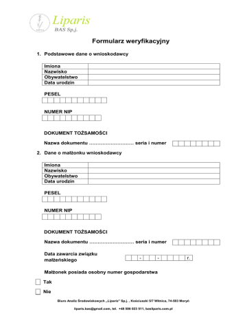 Formularz weryfikacyjny 1. Podstawowe dane o wnioskodawcy Imiona Nazwisko Obywatelstwo Data urodzin PESEL NUMER NIP DOKUMENT TOŻSAMOŚCI Nazwa dokumentu ……………………… seria i numer 2. Dane o małżonku wnioskodawcy Imiona Nazwisko Obywatelstwo Data urodzin PESEL NUMER NIP DOKUMENT TOŻSAMOŚCI Nazwa dokumentu ……………………… seria i numer Data zawarcia związku małżeńskiego - - r. Małżonek posiada osobny numer gospodarstwa Tak Nie Biuro Analiz Środowiskowych „Liparis” Sp.j. , Kościuszki 5/7 Witnica, 74-503 Moryń [email protected], tel. +48 506 023 511, basliparis.com.pl 3. Adres zameldowania Województwo Gmina Poczta Ulica Nr lokalu Faks Kraj Powiat Kod pocztowy Miejscowość Nr domu Telefon e-mail 4. Adres do korespondencji (wypełnić, jeśli inny niż w pkt. 3) Województwo Gmina Poczta Ulica Nr lokalu Faks Kraj Powiat Kod pocztowy Miejscowość Nr domu Telefon e-mail 5. Dane pełnomocnika lub osoby do kontaktu (jeśli ustanowiono) Imię PESEL Kraj Powiat Kod pocztowy Miejscowość Nr domu Telefon Nazwisko e-mail Województwo Gmina Poczta Ulica Nr lokalu Faks 6. Informacje o gospodarstwie rolnym Gospodarstwo posiada numer identyfikacyjny Tak numer identyfikacyjny Nie Na wskazany powyżej numer gospodarstwa został złożony wniosek o dopłaty bezpośrednie w roku 2014 Tak Nie Biuro Analiz Środowiskowych „Liparis” Sp.j. , Kościuszki 5/7 Witnica, 74-503 Moryń [email protected], tel. +48 506 023 511, basliparis.com.pl Numer/-y stada osoby przekazującej stado (dotyczy młodego rolnika, który będzie prowadził produkcję zwierzęca, zapis w układzie 12 cyfrowym). Numer/-y stada podstawowego (wypełnia osoba prowadząca produkcję zwierzęcą) nie dotyczy (zaznaczyć w pozostałych przypadkach) Wskazany numer gospodarstwa nadano osobie wymienionej w pkt. 1 Tak Nie (jeśli zaznaczono nie, proszę wskazać osobę do której należy numer) Imię PESEL Kraj Powiat Kod pocztowy Miejscowość Nr domu Telefon Nazwisko e-mail Województwo Gmina Poczta Ulica Nr lokalu Faks Proszę wskazać, z jakich działań korzystałem i otrzymałem pomoc w ramach PROW 2007-2013 (przykłady: Modernizacja gospodarstw rolnych, Ułatwianie startu młodym rolnikom, Różnicowanie w kierunku działalności nierolniczej, Tworzenie i rozwój mikroprzedsiębiorstw). Nie korzystałem z działań w ramach PROW 2007-2013 Nazwa działania Data zawarcia umowy - - Kwota dotacji zł Uwagi r. r. r. Proszę wskazać inwestycje w środki trwałe, jakie zrealizowane zostały w ramach PROW 2007-2013 w ramach działania „Modernizacja gospodarstw rolnych”. Biuro Analiz Środowiskowych „Liparis” Sp.j. , Kościuszki 5/7 Witnica, 74-503 Moryń [email protected], tel. +48 506 023 511, basliparis.com.pl nie dotyczy Producent Marka/ model/ typ Rok nabycia Parametr (np. szerokość robocza, moc) Uwagi Forma i czas ubezpieczenia społecznego Ubezpieczenie w KRUS Tak, od dnia - - r. Nie Jestem ubezpieczony jako: Rolnik Małżonek rolnika Domownik Ubezpieczenie w ZUS Tak, od dnia - - r. Nie Ubezpieczenie w urzędzie pracy Tak, od dnia - - r. Nie nie posiadam ubezpieczenia społecznego Prowadzę równolegle działalność gospodarczą, inną niż rolnicza Tak, od dnia - - r. Nie Biuro Analiz Środowiskowych „Liparis” Sp.j. , Kościuszki 5/7 Witnica, 74-503 Moryń [email protected], tel. +48 506 023 511, basliparis.com.pl Działalność pozarolnicza obejmuje usługi rolnicze Tak, od dnia - - r. Nie Nie dotyczy Opis posiadanego wykształcenia (zaznaczyć „X”) wyższe średnie policealne gimnazjalne podstawowe Inne Opis posiadanego wykształcenia rolniczego (zaznaczyć „X”) wyższe gimnazjalne średnie podstawowe policealne Inne Nie posiadam wykształcenia rolniczego Posiadam gospodarstwo rolne o powierzchni przynajmniej 1 ha UR Tak, od dnia - - r. Nie Lokalizacja gospodarstwa rolnego Województwo Powiat Kod pocztowy Miejscowość Nr domu Gmina Poczta Ulica Nr lokalu Struktura własnościowa użytków rolnych mojego gospodarstwa Własność , ha Dzierżawa (wymienić dzierżawę, która odbywa się w oparciu o umowę pisemną. Uwzględnić dzierżawy, które obowiązują do końca 2021 r. Można podać dzierżawy, które wygasają przed 2021 r. ale będą na pewno przedłużone). , ha Biuro Analiz Środowiskowych „Liparis” Sp.j. , Kościuszki 5/7 Witnica, 74-503 Moryń [email protected], tel. +48 506 023 511, basliparis.com.pl Sposób rozliczania z urzędem skarbowym Podatek VAT Ryczałt Gospodarstwo jest objęte dobrowolnym ubezpieczeniem Tak Nie Grunty mojego gospodarstwa leżą na obszarze Natura 2000 Tak, ponad 50% gruntów Tak, poniżej 50% gruntów Nie Grunty mojego gospodarstwa leżą na OSN Tak, ponad 50% gruntów Tak, poniżej 50% gruntów Nie Otrzymuję dopłaty do obszarów ONW Tak, ponad 50% gruntów jest objęte pomocą Tak, poniżej 50% gruntów jest objęte pomocą Nie W okresie 12 miesięcy poprzedzających miesiąc złożenia wniosku uzyskałem przychód ze sprzedaży produktów rolnych w wysokości co najmniej 5 tys. zł (faktura VAT lub faktura VAT RR) Tak Nie Posiadam ustalone prawo do renty z tytułu całkowitej niezdolności do pracy lub niezdolności do pracy w gospodarstwie Tak Nie Biuro Analiz Środowiskowych „Liparis” Sp.j. , Kościuszki 5/7 Witnica, 74-503 Moryń [email protected], tel. +48 506 023 511, basliparis.com.pl Jakimi programami w ramach nowego PROW jestem zainteresowany? Program „Restrukturyzacja małych gospodarstw rolnych” A. Tak Nie Program „Premia na rozpoczęcie działalności pozarolniczej” Tak Nie Krótka charakterystyka planowanej działalności (np. utworzenie gabinetu weterynaryjnego i miejsca pracy) Program „Rozwój usług rolniczych” Tak Nie Krótka charakterystyka planowanej działalności zbożowego o mocy 250 KM, szerokości roboczej 5,5 m) (np. zakup Program „Modernizacja gospodarstw rolnych” Tak Nie Proszę wskazać dominujący rodzaj produkcji w gospodarstwie Trzoda chlewna Bydło mleczne lub opasowe 