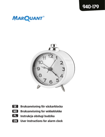 940-179 Bruksanvisning för väckarklocka Bruksanvisning for vekkeklokke Instrukcja obsługi budzika User Instructions for alarm clock SE - NO - PL - EN - Bruksanvisning i original Bruksanvisning i original Instrukcja obsługi w oryginale Operating instructions in original Date of production: 2015-02-02 © Jula AB Bruksanvisning för väckarklocka SVENSKA SE SÄKERHETSANVISNINGAR Läs bruksanvisningen noggrant innan användning! Spara den för framtida behov. BESKRIVNING 1 2 3 4 1. Alarm på/av 2.Batterifack 3.Alarmreglage 4.Tidsreglage HANDHAVANDE STARTA KLOCKAN • Öppna klockans bakstycke genom att vrida det medurs. Sätt i ett 1,5 V AAA-batteri med polerna rättvända. Sätt tillbaka bakstycket och vrid det medurs för att låsa det. STÄLLA IN TID • Ställ in korrekt tid genom att vrida tidsreglaget (4) moturs. • Avlägsna batteriet för att stanna sekundvisaren. Sätt i batteriet igen när sekundvisaren är i rätt läge. STÄLLA IN ALARM • Vrid alarmreglaget (3) moturs för att ställa in önskad tid då alarmet ska starta. Knappen för alarm på/av måste vara nertryckt för att alarmet ska vara aktiverat. STÄNGA AV ALARM • Tryck på knappen för alarm on-off för att stänga av alarmet. OBS! Ta ur batteriet om klockan inte används. 3 Rätten till ändringar förbehålles. Vid eventuella problem, kontakta vår serviceavdelning på telefon 0200-88 55 88. Jula AB, Box 363, 532 24 SKARA www.jula.se Bruksanvisning for vekkerklokke NORSK NO SIKKERHETSANVISNINGER Les bruksanvisningen nøye for bruk. Ta vare på den for fremtidig bruk. BESKRIVELSE 1 2 3 4 1. Alarm på/av 2.Batterirom 3.Alarminnstilling 4.Tidsinnstilling BRUK STARTE KLOKKEN • Åpne klokkens bakdeksel ved å dreie det med klokken. Sett inn ett 1,5 V AAA-batteri med polene som anvist. Sett bakdekselet på plass igjen, og lås det ved å dreie det med klokken. STILLE KLOKKEN • Still inn riktig klokkeslett ved å dreie time-/minuttknappen (4) moturs. • Ta ut batteriet for å stoppe sekundviseren. Sett batteriet inn igjen når sekundviseren er i riktig posisjon. STILLE INN ALARM • Vri knappen for alarminnstilling (3) moturs for å stille inn ønsket alarmtid. Knappen for alarm på/av må være trykket inn for at alarmen skal være aktivert. SLÅ AV ALARMEN • Trykk på knappen for alarm on/off for å slå av alarmen. OBS! Ta ut batteriet hvis klokken ikke er i bruk. 5 Med forbehold om endringer. Ved eventuelle problemer kan du kontakte vår serviceavdeling på telefon 67 90 01 34. Jula Norge AS, Solheimsveien 6–8, 1471 LØRENSKOG www.jula.no Instrukcja obsługi budzika POLSKI PL ZASADY BEZPIECZEŃSTWA Przed użyciem uważnie przeczytaj instrukcję obsługi! Zachowaj ją na przyszłość. OPIS 1 2 3 4 1. Alarm wł./wył. 3. Regulator alarmu 2. Komora na baterie 4. Regulator czasu OBSŁUGA WŁĄCZANIE ZEGARA • Otwórz tylną ściankę zegara, przekręcając ją w prawo. Włóż baterię AAA 1,5 V, zwracając uwagę na prawidłową biegunowość. Załóż z powrotem tylną ściankę zegara i przekręć ją w lewo, aby ją zablokować. USTAWIANIE CZASU • Ustaw prawidłowy czas, przekręcając regulator czasu (4) w lewo. • Aby zatrzymać wskazówkę sekundową, wyciągnij baterię. Po ustawieniu wskazówki sekundowej włóż baterię z powrotem. USTAWIANIE ALARMU • Aby ustawić wybraną porę alarmu, przekręć regulator alarmu (3) w lewo. Aby alarm był aktywny, przycisk wł./wył. alarmu powinien być wciśnięty. WYŁĄCZANIE ALARMU • Aby wyłączyć alarm, wciśnij przycisk wł./wył. alarmu. UWAGA! Jeżeli zegar nie będzie używany, wyjmij baterię. 7 Z zastrzeżeniem prawa do zmian. W razie ewentualnych problemów skontaktuj się telefonicznie z naszym działem obsługi klienta pod numerem: 801 600 500. Jula Poland Sp. z o.o., ul. Malborska 49, 03-286 Warszawa, Polska www.jula.pl User instructions for alarm clock ENGLISH EN SAFETY INSTRUCTIONS Read the User Instructions carefully before use. Save these instructions for future reference. DESCRIPTION 1 2 3 4 1. Alarm On/Off 3. Alarm wheel 2.Battery compartment 4. Time wheel USE START THE CLOCK • Open the back of the clock by turning it clockwise. Insert a 1.5 V AAA battery and make sure the terminals have the correct polarity. Replace the back and turn it clockwise to lock. SET THE TIME • Set the correct time by turning the time wheel (4) anticlockwise. • Remove the battery to stop the second hand. Insert the battery again when the second hand is in the correct position. SET THE ALARM • Turn the alarm wheel (3) anticlockwise to set the time when the alarm goes on. The button for alarm On/Off must be pressed in for the alarm to be active. SWITCH OFF THE ALARM • Press the button for alarm On/Off to switch off the alarm. NOTE: Remove the battery when the clock is not in use. 9 Jula reserves the right to make changes. In the event of problems, please contact our service department. www.jula.com