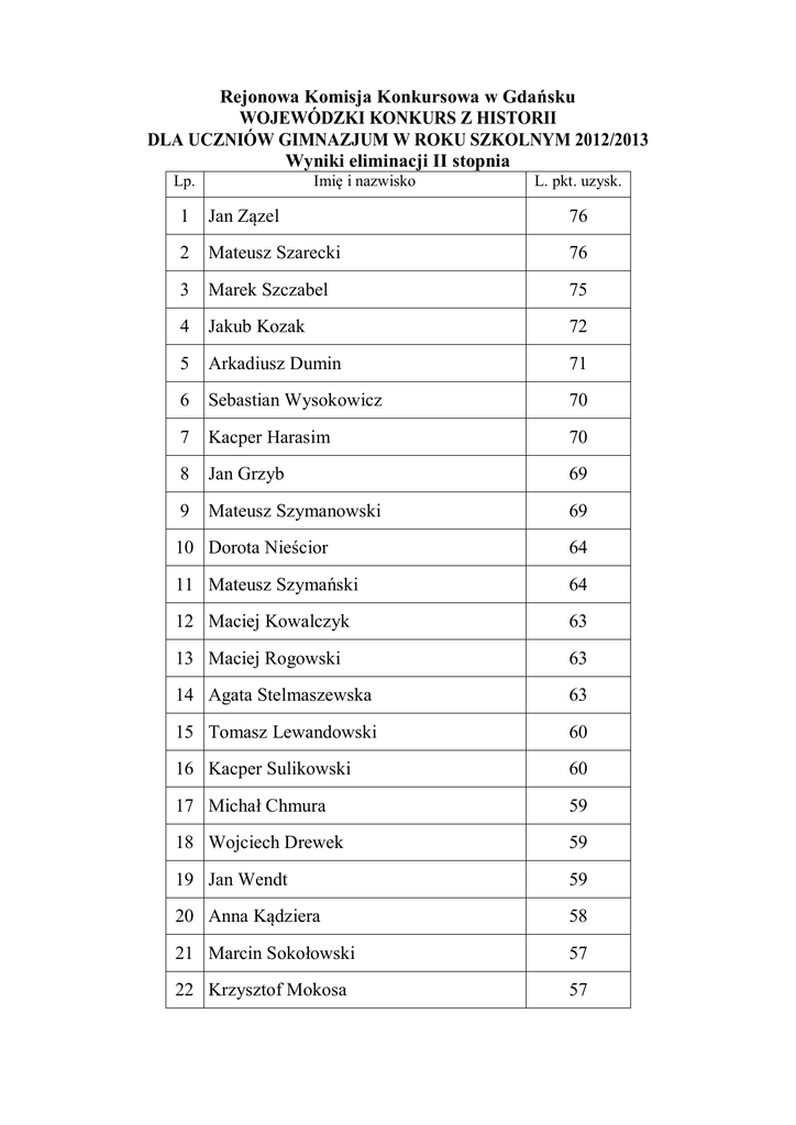 Rejonowa Komisja Konkursowa w Gdańsku WOJEWÓDZKI KONKURS Z HISTORII DLA UCZNIÓW GIMNAZJUM W ROKU SZKOLNYM 2012/2013 Wyniki eliminacji II stopnia Lp. Imię i nazwisko L. pkt. uzysk. 1 Jan Zązel 76 2 Mateusz Szarecki 76 3 Marek Szczabel 75 4 Jakub Kozak 72 5 Arkadiusz Dumin 71 6 Sebastian Wysokowicz 70 7 Kacper Harasim 70 8 Jan Grzyb 69 9 Mateusz Szymanowski 69 10 Dorota Nieścior 64 11 Mateusz Szymański 64 12 Maciej Kowalczyk 63 13 Maciej Rogowski 63 14 Agata Stelmaszewska 63 15 Tomasz Lewandowski 60 16 Kacper Sulikowski 60 17 Michał Chmura 59 18 Wojciech Drewek 59 19 Jan Wendt 59 20 Anna Kądziera 58 21 Marcin Sokołowski 57 22 Krzysztof Mokosa 57 23 Jowita Wieleszczyk 56 24 Antoni Płończak 55 25 Jakub Szczygielski 55 26 Mikołaj Kmieć 54 27 Tadeusz Janik 53 28 Przemysław Kmieciak 53 29 Kamil Sztramski 53 30 Bartosz Berecki 53 31 Eryk Wilmont 52 32 Koralia Linstedt 50 33 Huyen Emilia Truong Thi Minh 50 34 Dawid Bogut 49 35 Karolina Drabent 49 36 Artur Klimaszewski 49 37 Marcin König 49 38 Bartosz Kłódka 48 39 Sebastian Torłop 48 40 Piotr Kowalewski 47 41 Szymon Szarowski 47 42 Michał Tomasik 47 43 Robert Okuła 45 44 Borys Wartała 45 45 Elżbieta Żakiewicz 45 46 Magdalena Grotowska 44 47 Sara Wyrzykowska 44 48 Patrycja Kruczyńska 43 49 Marceli Mendyk 43 50 Krzysztof Prusinowski 43 51 Maciej Suchocki 43 52 Maciej Baum 41 53 Alicja Łojewska 41 54 Maciej Pietrusik 41 55 Grzegorz Pietruszyński 41 56 Ewa Świeżyńska 41 57 Ada Eichert 40 58 Aleksandra Myslińska 40 59 Daniel Sylwestrowicz 40 60 Józef Zienowicz 40 61 Kamila Bogucka 39 62 Piotr Pawlak 39 63 Agata Wódkowska 39 64 Anna Romankiewicz 38 65 Kinga Wróbel 38 66 Patryk Czerniewicz 37 67 Patryk Mucha 37 68 Monika Świerczyna 37 59 Konrad Ozdowski 36 70 Joanna Dardzińska 35 71 Konrad Majkowski 35 72 Natalia Czerniak 32 73 31 Tomasz Golec