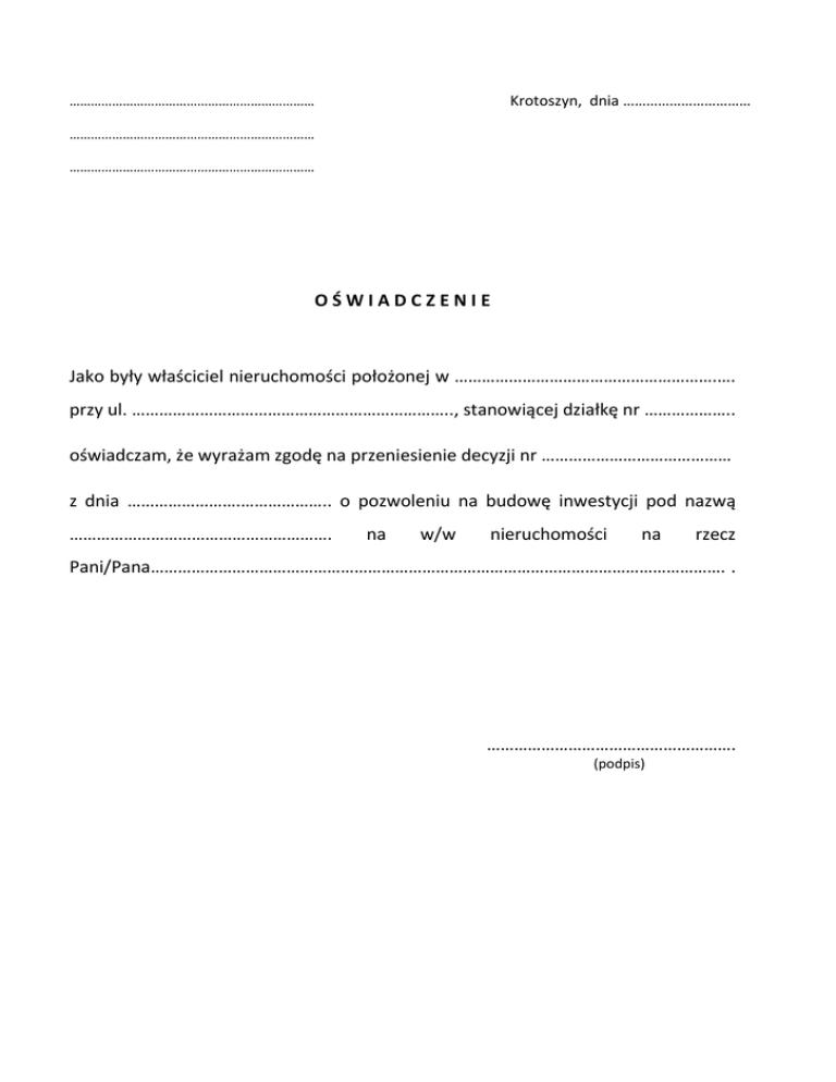 Krotoszyn, dnia …………………………… …………………………………………………………… …………………………………………………………… …………………………………………………………… OŚWIADCZENIE Jako były właściciel nieruchomości położonej w ………………………………………………….…. przy ul. …………………………………………………………….., stanowiącej działkę nr ……………….. oświadczam, że wyrażam zgodę na przeniesienie decyzji nr …………………………………… z dnia …………………….……………….. o pozwoleniu na budowę inwestycji pod nazwą …………………………………………………. na w/w nieruchomości na rzecz Pani/Pana………………………………………………………………………………………………………………. . ………………………………………………. (podpis)