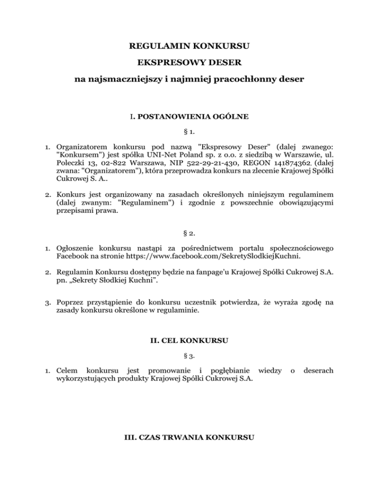 REGULAMIN KONKURSU EKSPRESOWY DESER na najsmaczniejszy i najmniej pracochłonny deser I. POSTANOWIENIA OGÓLNE § 1. 1. Organizatorem konkursu pod nazwą "Ekspresowy Deser" (dalej zwanego: "Konkursem") jest spółka UNI-Net Poland sp. z o.o. z siedzibą w Warszawie, ul. Poleczki 13, 02-822 Warszawa, NIP 522-29-21-430, REGON 141874362, (dalej zwana: "Organizatorem"), która przeprowadza konkurs na zlecenie Krajowej Spółki Cukrowej S. A.. 2. Konkurs jest organizowany na zasadach określonych niniejszym regulaminem (dalej zwanym: "Regulaminem") i zgodnie z powszechnie obowiązującymi przepisami prawa. § 2. 1. Ogłoszenie konkursu nastąpi za pośrednictwem portalu społecznościowego Facebook na stronie https://www.facebook.com/SekretySlodkiejKuchni. 2. Regulamin Konkursu dostępny będzie na fanpage’u Krajowej Spółki Cukrowej S.A. pn. „Sekrety Słodkiej Kuchni”. 3. Poprzez przystąpienie do konkursu uczestnik potwierdza, że wyraża zgodę na zasady konkursu określone w regulaminie. II. CEL KONKURSU § 3. 1. Celem konkursu jest promowanie i pogłębianie wiedzy wykorzystujących produkty Krajowej Spółki Cukrowej S.A. III. CZAS TRWANIA KONKURSU o deserach § 4. 1. Konkurs będzie trwał od 30 czerwca 2014 od godziny 8:00 do 7 lipca 2014 r do godz. 16:00. 2. Wyniki konkursu ogłoszone zostaną w dniu zakończenia konkursu. IV. UCZESTNICY KONKURSU § 5. 1. Uczestnikiem Konkursu może być osoba fizyczna, pełnoletnia, posiadająca pełną zdolność do czynności prawnych, zamieszkała na terytorium Rzeczpospolitej Polskiej posiadająca swój profil na portalu społecznościowym Facebook oraz będąca fanem fanpage „Sekrety Słodkiej Kuchni” (dalej Fan) tzn. kliknęła przycisk „Lubię to” na stronie. 2. W Konkursie nie mogą brać udziału pracownicy Organizatora i realizatorów oraz inne osoby współpracujące przy organizacji Konkursu, jak również członkowie rodzin w/w pracowników i współpracowników. V. ZAŁOŻENIA KONKURSU § 6. 1. Konkurs polega na opublikowaniu na stronie fanpage „Sekrety Słodkiej Kuchni” na portalu Facebook przepisu na deser wraz z jego zdjęciem (nie wezmą udziału zdjęcia zaczerpnięte z Internetu). 2. Przepis ma zawierać listę składników oraz opis przygotowania deseru. 3. Jednym ze składników użytych do przygotowania deseru musi być produkt marki Polski Cukier. 4. Laureatem Konkursu zostanie osoba, która uzyska największą ilość polubień (kliknięć „lubię to”) publikacji swojego przepisu na fanpage „Sekrety Słodkiej Kuchni”. 5. Przepis należy zamieścić w opisie zdjęcia. Przepis i zdjęcie stanowi integralną całość. 6. Jedna osoba może wziąć udział w Konkursie wyłącznie jeden raz w czasie trwania konkursu. 7. Administratorem danych osobowych udostępnianych przez uczestników jest Organizator. Organizator oświadcza, że dane osobowe uczestnika w zakresie: imię i nazwisko, numer telefonu komórkowego lub stacjonarnego, adresu e-mailowego lub odpowiednio adres zamieszkania, będą przetwarzane przez Organizatora Konkursu z siedzibą w Warszawie przy ul. Poleczki 13 w celu realizacji umowy przystąpienia do konkursu i jego prawidłowego przeprowadzenia lub marketingu bezpośredniego własnych produktów Organizatora Konkursu. Gwarantujemy prawo wglądu do swoich danych osobowych oraz ich poprawiania, jak również żądania zaprzestania przetwarzania danych. Podanie danych jest dobrowolne i nieodpłatne. 8. Prawa autorskie majątkowe do prac nadesłanych przez uczestników konkursu powinny należeć do uczestników konkursu. Uczestnicy konkursu ponoszą pełną odpowiedzialność wobec Organizatora w przypadku zgłoszenia przez osoby trzecie roszczeń z tytułu naruszenia ich praw wskutek wykorzystania przez Organizatora tekstów zgodnie z niniejszym Regulaminem. 9. Zgłoszenia muszą być unikalnymi treściami, stworzonymi specjalnie na potrzeby danego konkursu. Teksty i zdjęcia, które dostępne są już w Internecie, na innych serwisach, a nie są własnością uczestnika konkursu będą dyskwalifikowane. 10. Uczestnicy konkursu udzielają Organizatorowi prawo do bezpłatnego korzystania z prac w zakresie rozpowszechnienia i ich publikacji na stronach internetowych Organizatora, w szczególności fanpage Sekrety Słodkiej Kuchni w wybranym przez Organizatora kontekście lub w zestawieniu z innymi pracami biorącymi udział w konkursie. 11. Nadesłanie przez Fana zgłoszenia wraz ze zdjęciem równoznaczne jest z wyrażeniem przez osobę nadsyłająca zgody na publikowanie zdjęcia na profilu „Sekrety Słodkiej Kuchni”, niezależnie od tego czy przepis ten zostanie wyróżniony czy nie, bez prawa Fana do domagania się od Organizatora lub Klienta jakiegokolwiek świadczenia z tytułu takiej publikacji (np. wynagrodzenia). VI. PRZYZNANIE NAGRÓD § 7. 1. Laureat wyłoniony zostanie w dniu 7 lipca 2014 po godzinie 16:00. 2. Laureat powiadomiony zostanie o wygranej poprzez Publikację wyników na fanpage Sekrety Słodkiej Kuchni. 3. Nagroda to Blender Gorenje HB 804 QR Czerwony. 4. Wartość nagród w konkursie nie przekracza 760 złoty w związku z czym nie powoduje obowiązku podatkowego u Organizatora jak i u laureata. 5. Nagrody do laureata wysłane zostaną pocztą lub przesyłką kurierską na koszt Organizatora pod adres zamieszkania wskazany przez laureata w terminie 28 dni od dnia otrzymania od laureata danych koniecznych do wysyłki. 6. W przypadku braku dostarczenia danych adresowych przez laureata w terminie 7 dni od dnia poinformowania o wygranej, prawo do nagrody wygasa. Organizator zastrzega, że nagrody nie podlegają zamianie na ich równowartość pieniężną, ani na nagrody innego rodzaju. 7. Laureatom nie przysługuje prawo do wyboru nagrody i zastrzeżenia szczególnych właściwości nagród. 8. Przeniesienie przez nagrodzonego Uczestnika prawa do nagrody na rzecz osoby trzeciej jest prawnie bezskuteczne wobec Organizatora. Prawnie bezskuteczna jest także rezygnacja