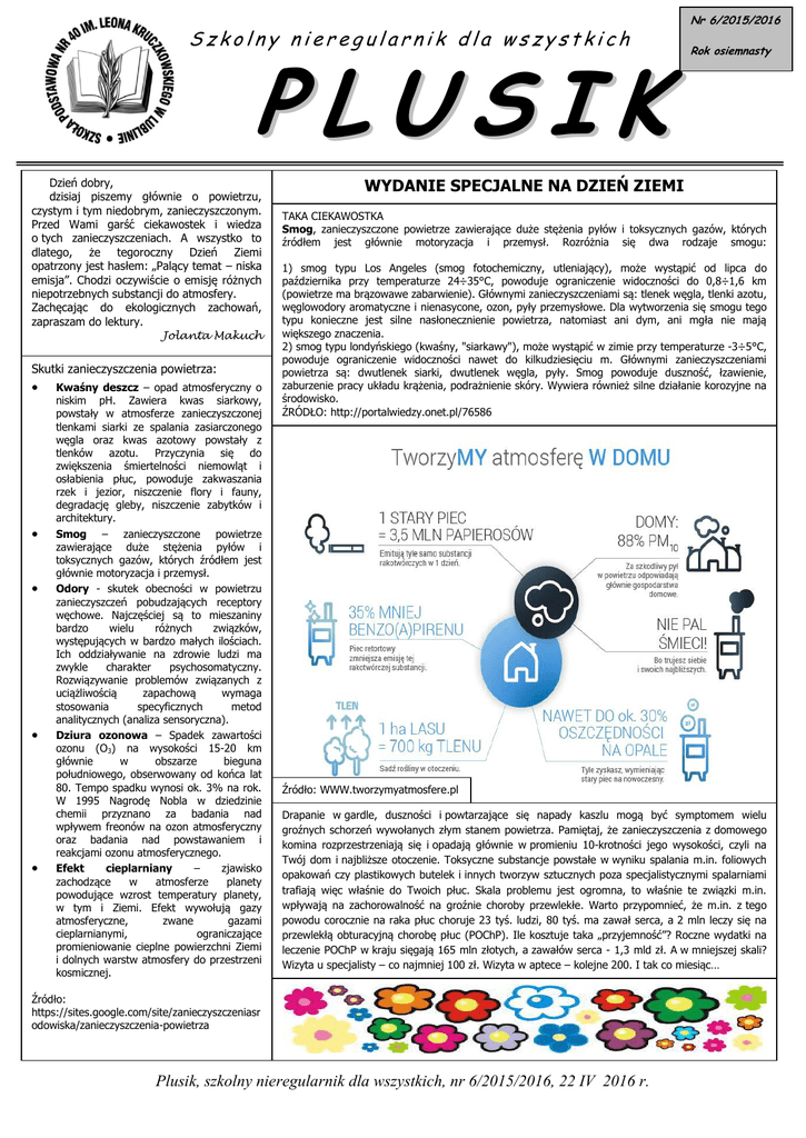 Szkolny nieregularnik dla wszystkich PLUSIK Dzień dobry, dzisiaj piszemy głównie o powietrzu, czystym i tym niedobrym, zanieczyszczonym. Przed Wami garść ciekawostek i wiedza o tych zanieczyszczeniach. A wszystko to dlatego, że tegoroczny Dzień Ziemi opatrzony jest hasłem: „Palący temat – niska emisja”. Chodzi oczywiście o emisję różnych niepotrzebnych substancji do atmosfery. Zachęcając do ekologicznych zachowań, zapraszam do lektury. Jolanta Makuch Skutki zanieczyszczenia powietrza:      Kwaśny deszcz – opad atmosferyczny o niskim pH. Zawiera kwas siarkowy, powstały w atmosferze zanieczyszczonej tlenkami siarki ze spalania zasiarczonego węgla oraz kwas azotowy powstały z tlenków azotu. Przyczynia się do zwiększenia śmiertelności niemowląt i osłabienia płuc, powoduje zakwaszania rzek i jezior, niszczenie flory i fauny, degradację gleby, niszczenie zabytków i architektury. Smog – zanieczyszczone powietrze zawierające duże stężenia pyłów i toksycznych gazów, których źródłem jest głównie motoryzacja i przemysł. Odory - skutek obecności w powietrzu zanieczyszczeń pobudzających receptory węchowe. Najczęściej są to mieszaniny bardzo wielu różnych związków, występujących w bardzo małych ilościach. Ich oddziaływanie na zdrowie ludzi ma zwykle charakter psychosomatyczny. Rozwiązywanie problemów związanych z uciążliwością zapachową wymaga stosowania specyficznych metod analitycznych (analiza sensoryczna). Dziura ozonowa – Spadek zawartości ozonu (O3) na wysokości 15-20 km głównie w obszarze bieguna południowego, obserwowany od końca lat 80. Tempo spadku wynosi ok. 3% na rok. W 1995 Nagrodę Nobla w dziedzinie chemii przyznano za badania nad wpływem freonów na ozon atmosferyczny oraz badania nad powstawaniem i reakcjami ozonu atmosferycznego. Efekt cieplarniany – zjawisko zachodzące w atmosferze planety powodujące wzrost temperatury planety, w tym i Ziemi. Efekt wywołują gazy atmosferyczne, zwane gazami cieplarnianymi, ograniczające promieniowanie cieplne powierzchni Ziemi i dolnych warstw atmosfery do przestrzeni kosmicznej. Nr 6/2015/2016 Rok osiemnasty WYDANIE SPECJALNE NA DZIEŃ ZIEMI TAKA CIEKAWOSTKA Smog, zanieczyszczone powietrze zawierające duże stężenia pyłów i toksycznych gazów, których źródłem jest głównie motoryzacja i przemysł. Rozróżnia się dwa rodzaje smogu: 1) smog typu Los Angeles (smog fotochemiczny, utleniający), może wystąpić od lipca do października przy temperaturze 24÷35°C, powoduje ograniczenie widoczności do 0,8÷1,6 km (powietrze ma brązowawe zabarwienie). Głównymi zanieczyszczeniami są: tlenek węgla, tlenki azotu, węglowodory aromatyczne i nienasycone, ozon, pyły przemysłowe. Dla wytworzenia się smogu tego typu konieczne jest silne nasłonecznienie powietrza, natomiast ani dym, ani mgła nie mają większego znaczenia. 2) smog typu londyńskiego (kwaśny, "siarkawy"), może wystąpić w zimie przy temperaturze -3÷5°C, powoduje ograniczenie widoczności nawet do kilkudziesięciu m. Głównymi zanieczyszczeniami powietrza są: dwutlenek siarki, dwutlenek węgla, pyły. Smog powoduje duszność, łzawienie, zaburzenie pracy układu krążenia, podrażnienie skóry. Wywiera również silne działanie korozyjne na środowisko. ŹRÓDŁO: http://portalwiedzy.onet.pl/76586 Źródło: WWW.tworzymyatmosfere.pl Drapanie w gardle, duszności i powtarzające się napady kaszlu mogą być symptomem wielu groźnych schorzeń wywołanych złym stanem powietrza. Pamiętaj, że zanieczyszczenia z domowego komina rozprzestrzeniają się i opadają głównie w promieniu 10-krotności jego wysokości, czyli na Twój dom i najbliższe otoczenie. Toksyczne substancje powstałe w wyniku spalania m.in. foliowych opakowań czy plastikowych butelek i innych tworzyw sztucznych poza specjalistycznymi spalarniami trafiają więc właśnie do Twoich płuc. Skala problemu jest ogromna, to właśnie te związki m.in. wpływają na zachorowalność na groźnie choroby przewlekłe. Warto przypomnieć, że m.in. z tego powodu corocznie na raka płuc choruje 23 tyś. ludzi, 80 tyś. ma zawał serca, a 2 mln leczy się na przewlekłą obturacyjną chorobę płuc (POChP). Ile kosztuje taka „przyjemność”? Roczne wydatki na leczenie POChP w kraju sięgają 165 mln złotych, a zawałów serca - 1,3 mld zł. A w mniejszej skali? Wizyta u specjalisty – co najmniej 100 zł. Wizyta w aptece – kolejne 200. I tak co miesiąc… Źródło: https://sites.google.com/site/zanieczyszczeniasr odowiska/zanieczyszczenia-powietrza Plusik, szkolny nieregularnik dla wszystkich, nr 6/2015/2016, 22 IV 2016 r. ROZMAITOŚCI Wykreślanka: tu ukryło się 14 wyrazów „ekologicznych” i związanych z ochroną czystego powietrza Krzyżówka „czystościowa” 1. Maszyna do prania POWIEDZENIA O POWIETRZU. Traktować kogoś jak powietrze – NIE ZAUWAŻAĆ, IGNOROWAĆ Być dla kogoś jak powietrze – BYĆ POTRZEBNYM, NIEZBĘDNYM Coś wisi w powietrzu – PRZECZUWAĆ COŚ, DOMYŚLAĆ SIĘ TAKA CIEKAWOSTKA Władze francuskiego lotniska w Lyonie postanowiły badać poziom zanieczyszczenia powietrza przy pomocy pszczół. Pszczoły, a w zasadzie miód, który wytwarzają, jest doskonałym indykatorem zanieczyszczeń. Na roślinach, z których owady pobierają nektar i pyłki osadzają się wszystkie obecne powietrzu związki chemiczne, tak więc jeśli w powietrzu znajdują się toksyny, znajdziemy je też w plastrach miodu. Pomysł wykorzystania pszczół do pomiaru poziomu zanieczyszczeń wcale nie jest nowy. Część niemieckich lotnisk korzysta z ich pomocy już od lat 90. Oczywiście nie zaprzestano tradycyjnych metod monitoringu. ŹRÓDŁO: www.eko-samorządowiec.pl Europejska Agencja Środowiska opracowała też ranking najbardziej zanieczyszczonych miast w Europie. Nie jest od dla nas niestety powodem do dumy. Okazuje się, że w skali Europy Polska ma aż sześć miast w pierwszej dziesią