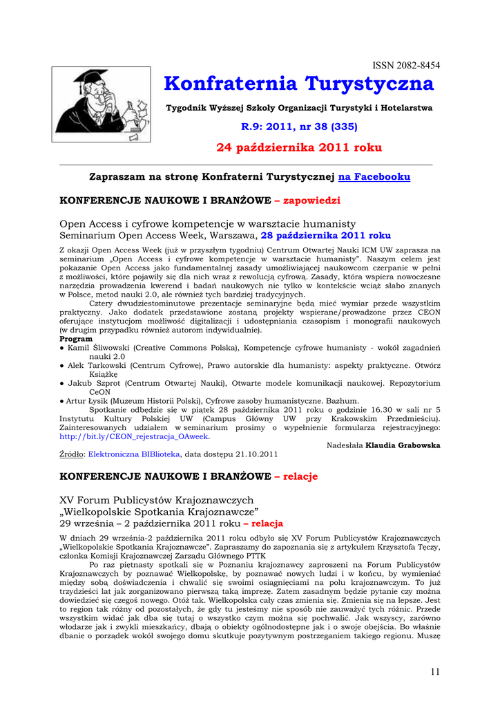ISSN 2082-8454 Konfraternia Turystyczna Tygodnik Wyższej Szkoły Organizacji Turystyki i Hotelarstwa R.9: 2011, nr 38 (335) 24 października 2011 roku __________________________________________________________________________ Zapraszam na stronę Konfraterni Turystycznej na Facebooku KONFERENCJE NAUKOWE I BRANŻOWE – zapowiedzi Open Access i cyfrowe kompetencje w warsztacie humanisty Seminarium Open Access Week, Warszawa, 28 października 2011 roku Z okazji Open Access Week (już w przyszłym tygodniu) Centrum Otwartej Nauki ICM UW zaprasza na seminarium „Open Access i cyfrowe kompetencje w warsztacie humanisty”. Naszym celem jest pokazanie Open Access jako fundamentalnej zasady umożliwiającej naukowcom czerpanie w pełni z możliwości, które pojawiły się dla nich wraz z rewolucją cyfrową. Zasady, która wspiera nowoczesne narzędzia prowadzenia kwerend i badań naukowych nie tylko w kontekście wciąż słabo znanych w Polsce, metod nauki 2.0, ale również tych bardziej tradycyjnych. Cztery dwudziestominutowe prezentacje seminaryjne będą mieć wymiar przede wszystkim praktyczny. Jako dodatek przedstawione zostaną projekty wspierane/prowadzone przez CEON oferujące instytucjom możliwość digitalizacji i udostępniania czasopism i monografii naukowych (w drugim przypadku również autorom indywidualnie). Program ● Kamil Śliwowski (Creative Commons Polska), Kompetencje cyfrowe humanisty - wokół zagadnień nauki 2.0 ● Alek Tarkowski (Centrum Cyfrowe), Prawo autorskie dla humanisty: aspekty praktyczne. Otwórz Książkę ● Jakub Szprot (Centrum Otwartej Nauki), Otwarte modele komunikacji naukowej. Repozytorium CeON ● Artur Łysik (Muzeum Historii Polski), Cyfrowe zasoby humanistyczne. Bazhum. Spotkanie odbędzie się w piątek 28 października 2011 roku o godzinie 16.30 w sali nr 5 Instytutu Kultury Polskiej UW (Campus Główny UW przy Krakowskim Przedmieściu). Zainteresowanych udziałem w seminarium prosimy o wypełnienie formularza rejestracyjnego: http://bit.ly/CEON_rejestracja_OAweek. Nadesłała Klaudia Grabowska Źródło: Elektroniczna BIBlioteka, data dostępu 21.10.2011 KONFERENCJE NAUKOWE I BRANŻOWE – relacje XV Forum Publicystów Krajoznawczych „Wielkopolskie Spotkania Krajoznawcze” 29 września – 2 października 2011 roku – relacja W dniach 29 września-2 października 2011 roku odbyło się XV Forum Publicystów Krajoznawczych „Wielkopolskie Spotkania Krajoznawcze”. Zapraszamy do zapoznania się z artykułem Krzysztofa Tęczy, członka Komisji Krajoznawczej Zarządu Głównego PTTK Po raz piętnasty spotkali się w Poznaniu krajoznawcy zaproszeni na Forum Publicystów Krajoznawczych by poznawać Wielkopolskę, by poznawać nowych ludzi i w końcu, by wymieniać między sobą doświadczenia i chwalić się swoimi osiągnięciami na polu krajoznawczym. To już trzydzieści lat jak zorganizowano pierwszą taką imprezę. Zatem zasadnym będzie pytanie czy można dowiedzieć się czegoś nowego. Otóż tak. Wielkopolska cały czas zmienia się. Zmienia się na lepsze. Jest to region tak różny od pozostałych, że gdy tu jesteśmy nie sposób nie zauważyć tych różnic. Przede wszystkim widać jak dba się tutaj o wszystko czym można się pochwalić. Jak wszyscy, zarówno włodarze jak i zwykli mieszkańcy, dbają o obiekty ogólnodostępne jak i o swoje obejścia. Bo właśnie dbanie o porządek wokół swojego domu skutkuje pozytywnym postrzeganiem takiego regionu. Muszę 11 powiedzieć, że z tych właśnie względów zawsze chętnie tu przyjeżdżam. Tym bardziej, że ziemia ta jest niezwykle zasobna w walory krajoznawcze. Zarówno te większe jak i te zupełnie malutkie, czy wydawałoby się nieważne. Wszystkie one składają się jednak na wizerunek jaki zapamiętamy wracając do swoich domów. Na wizerunek jaki będziemy przekazywali naszym znajomym i sąsiadom. A przecież właśnie to w jaki sposób zapamiętamy nasz tutaj pobyt i w jaki sposób opowiemy o tym co tutaj widzieliśmy na pewno przełoży się na ewentualne wizyty kolejnych osób zauroczonych tymi opowieściami. Zatem nie pozostaje mi nic innego jak rozpocząć swoją opowieść o tym co nas tym razem spotkało. […] Krzysztof Tęcza Całą relację znajdziesz tutaj: Komisja Krajoznawcza ZG PTTK, dokument online: http://kkraj.pttk.pl/index.php?co=11forum, data dostępu 20.10.2011 roku W poszukiwaniu nowych rynków turystycznych Kraków, 5-7 października 2011 roku – relacja Podczas 10. Europejskiego Forum Turystyki, część obrad poświęcono nowej strategii rozwoju turystyki, z nastawieniem na zwiększenie liczby odwiedzających z krajów azjatyckich oraz Ameryki Łacińskiej. Wiceprzewodniczący Komisji Europejskiej Antonio Tajani zwrócił uwagę na mnogość aspektów przemawiających za poszukiwaniem nowych rynków. Zauważył, że w Chinach i Rosji rośnie tzw. „klasa średnia”, a potencjalni turyści z tych krajów mają do dyspozycji więcej środków. Z kolei mieszkańcy Ameryki Południowej to w większości imigranci z Europy, lub też mają europejskie korzenie, dlatego zechcą wrócić na stary kontynent jako turyści. Wystarczy tylko ich odpowiednio zachęcić. Wiceprzewodniczący wspomniał, że w planach są negocjacje z Chinami, w celu stworzenia nowych zasad wizowych dla turystów z tego kraju. Obecnie ważne jest, aby przestrzegać podstawowych zasad bezpieczeństwa podróży, przy jednoczesnym promowaniu turystyki. Tajani jest zdania, że jest możliwe zmniejszenie biurokracji oraz nawiązanie bliższej współpracy turystycznej na linii Europa-Azja oraz Europa-Ameryka Południowa. Podczas spotkania w Krakowie Komisja Europejska podpisała deklarację z Europejską Komisją Turystyki (ETC). Dokument dotyczy współpracy w dziedzinie turystyki i promocji Europy na rynkach pozaeuropejskich. Powstała nowa strategia marketingowa nastawiona na mieszkańców Brazylii, Rosji, Indii oraz Chin. Całość przebiegnie pod hasłem „Europa -