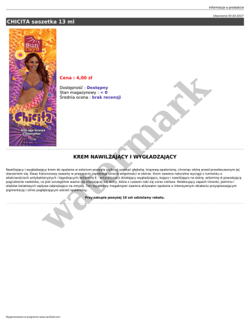 Informacje o produkcie Utworzono 03-03-2017 CHICITA saszetka 13 ml Cena : 4,00 zł er m ar k Dostępność : Dostępny Stan magazynowy : < 0 Średnia ocena : brak recenzji KREM NAWILŻAJĄCY I WYGŁADZAJĄCY at Nawilżający i wygładzający krem do opalania w solarium pozwala szybciej uzyskać głęboką, brązową opaleniznę, chroniąc skórę przed przedwczesnym jej starzeniem się. Kwas hialuronowy zawarty w preparacie zapobiega utracie wilgotności w skórze. Krem zawiera naturalne wyciągi z rumianku o właściwościach antybakteryjnych i łagodzących, witaminę E - antyutleniacz działający wygładzająco, kojąco i nawilżająco na skórę, witaminę A powodującą pogrubienie naskórka, co jest szczególnie ważne dla starzejącej się skóry, która z czasem robi się coraz cieńsza. Relaksujący zapach limonki, jaśminu i olejków kwiatowych wpływa odprężająco na zmysły. Ten wyjątkowy megabrązer zawiera aktywator opalania o intensywnym działaniu przyspieszającym pigmentację i silnie pogłębiającym odcień opalenizny. w Przy zakupie powyżej 10 szt udzielamy rabatu. Wygenerowano w programie www.oscGold.com