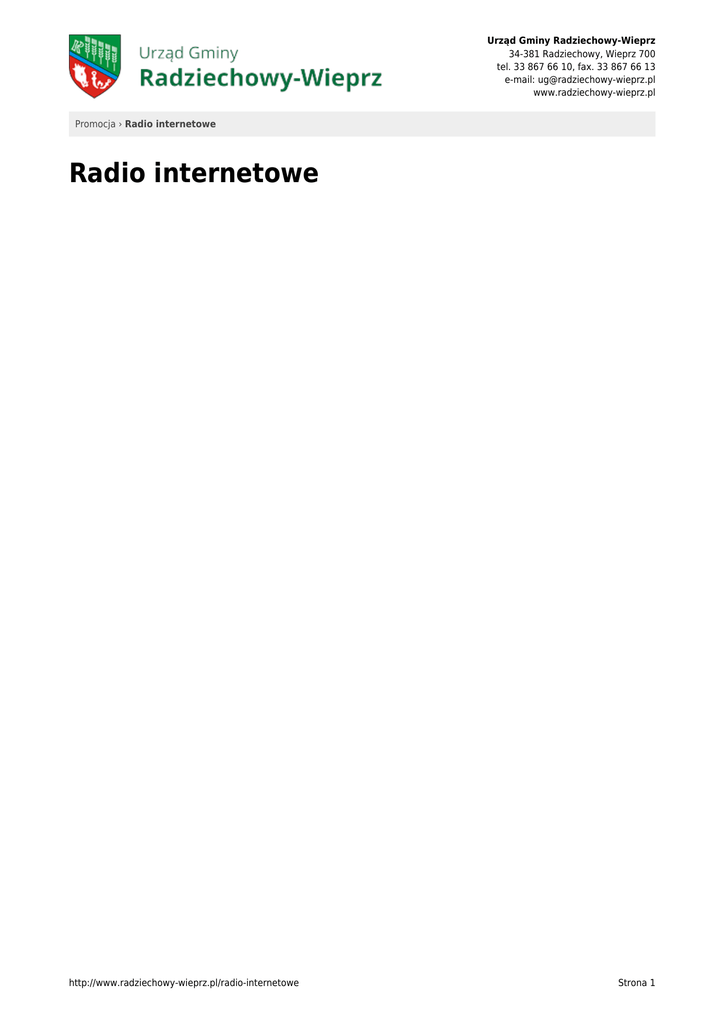 Urząd Gminy Radziechowy-Wieprz 34-381 Radziechowy, Wieprz 700 tel. 33 867 66 10, fax. 33 867 66 13 e-mail: [email protected] www.radziechowy-wieprz.pl Promocja › Radio internetowe Radio internetowe http://www.radziechowy-wieprz.pl/radio-internetowe Strona 1