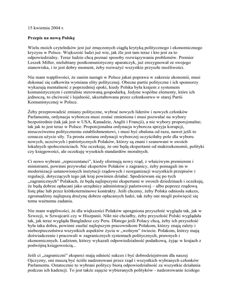 15 kwietnia 2004 r. Przepis na nową Polskę Wielu moich czytelników jest już zmęczonych ciągłą krytyką politycznego i ekonomicznego kryzysu w Polsce. Większość ludzi już wie, jak źle jest tam teraz i kto jest za to odpowiedzialny. Teraz ludzie chcą poznać sposoby rozwiązywania problemów. Premier Leszek Miller, nielubiany postkomunistyczny aparatczyk, już zrezygnował ze swojego stanowiska, i to jest dobry moment, żeby rozważyć wszystkie przyszłe możliwości. Nie mam wątpliwości, że zanim nastąpi w Polsce jakaś poprawa w zakresie ekonomii, musi dokonać się całkowita wymiana elity politycznej. Obecne partie polityczne i ich sponsorzy wykazują mentalność z poprzedniej epoki, kiedy Polska była krajem z systemem komunistycznym i centralnie sterowaną gospodarką. Jedyne wspólne elementy, które ich jednoczą, to chciwość i lojalność, ukształtowana przez członkostwo w starej Partii Komunistycznej w Polsce. Żeby przeprowadzić zmiany polityczne, wybrać nowych liderów i nowych członków Parlamentu, ordynacja wyborcza musi zostać zmieniona i musi pozwalać na wybory bezpośrednie (tak jak jest w USA, Kanadzie, Anglii i Francji), a nie wybory proporcjonalne; tak jak to jest teraz w Polsce. Proporcjonalna ordynacja wyborcza sprzyja korupcji, nieuczciwemu politycznemu establishmentowi, i musi być obalona od razu, nawet jeśli to oznacza użycie siły. Ta prosta zmiana ordynacji wyborczej oczyściłaby pole dla wyboru nowych, uczciwych i patriotycznych Polaków, którzy są znani i szanowani w swoich lokalnych społecznościach. Nie oczekuję, że oni będą ekspertami od makroekonomii, polityki czy księgowości, ale oczekuję wysokich standardów moralnych. Ci nowo wybrani „reprezentanci”, kiedy sformują nowy rząd, z właściwym premierem i ministrami, powinni przywołać ekspertów Polaków z zagranicy, żeby pomagali im w modernizacji ustanowionych instytucji rządowych i reorganizacji wszystkich przepisów i regulacji, dotyczących tego jak kraj powinien działać. Spodziewam się po tych „zagranicznych” Polakach, że będą najlepszymi ekspertami w swoich dziedzinach i oczekuję, że będą dobrze opłacani jako urzędnicy administracji państwowej – albo poprzez rządową listę płac lub przez krótkoterminowe kontrakty. Jeśli chcemy, żeby Polska odniosła sukces, zgromadźmy najlepszą drużynę dobrze opłacanych ludzi, tak żeby oni mogli poświęcić się temu ważnemu zadaniu. Nie mam wątpliwości, że dla większości Polaków upragniona przyszłość wygląda tak, jak w Szwecji, w Szwajcarii czy w Hiszpanii. Nikt nie chciałby, żeby przyszłość Polski wyglądała tak, jak teraz wygląda Bangladesz czy Peru. Dlatego jeśli Polacy chcą, żeby ich przyszłość była taka dobra, powinni zaufać najlepszym pracownikom Polakom, którzy znają zalety i niebezpieczeństwa wszystkich aspektów życia w „wolnym” świecie. Polakom, którzy mają doświadczenie i pracowali w zagranicznych systemach politycznych, prawnych i ekonomicznych. Ludziom, którzy wykazali odpowiedzialność podatkową, żyjąc w krajach z podwójną księgowością... Jeśli ci „zagraniczni” eksperci mają odnieść sukces i być dobrodziejstwem dla naszej Ojczyzny, oni muszą być ściśle nadzorowani przez rząd i wszystkich wybranych członków Parlamentu. Ostatecznie to wybrani politycy biorą odpowiedzialność za wszystkie działania podczas ich kadencji. To jest także zajęcie wybieranych polityków - nadzorowanie ścisłego podziału władz legislacyjnych, prawnych i wykonawczych wszystkich instytucji rządowych. Tylko wtedy, kiedy ten podział będzie istnieć, będzie w Polsce zaufanie i bezpieczeństwo dla naszych obywateli oraz krajowych i zagranicznych inwestorów. Ale z kilku powodów ten scenariusz nie może się zdarzyć. Po pierwsze, większość Polaków nie rozumie potrzeby zbierania pieniędzy na pokrycie kosztów kampanii wyborczych swoich politycznych kandydatów. Oni oczekują, że każdy kandydat, albo jego partia polityczna, znajdzie pieniądze „gdzie indziej”. Co w rzeczywistości oznacza, że ludzie oczekują, że ich reprezentanci będą dzielić lojalność między wyborców i osoby indywidualne lub organizacje, które sfinansują ich kampanie polityczne. To jest w całkowitej sprzeczności ze wszystkimi zasadami demokracji i moralności w polityce. Po drugie, inne kraje nie chcą, żeby Polska miała rząd, który jest silnie wspierany przez społeczeństwo. Oni wolą, żeby polscy politycy byli zależni od ich poparcia. Zawsze istnieje presja, wywierana przez obce kraje i ich agentów, którzy mają silne powiązania z elitą polityczną w Polsce. Po trzecie, ludzie w Polsce oczekują, że najlepsi eksperci na świecie rozwiążą gigantyczne problemy w postkomunistycznej Polsce, ale nie są skłonni płacić tym ekspertom konkurencyjnych pensji. Ludzie, którzy zarabiają rocznie 4000 dolarów, nie mogą sobie wyobrazić eksperta od światowej gospodarki zarabiającego 100 000 dolarów rocznie. W tym samym czasie Polska traci miliardy przez korupcję, niekompetencję i ignorancję ciał legislacyjnych, które nie potrafią przygotować swojego kraju do przyszłego sukcesu. Na temat możliwych rozwiązań kryzysu w Polsce mógłbym napisać książkę. Ale pozwólcie sobie powiedzieć, że dobry plan działania powinien zmieścić się na jednej kartce. To bez sensu pisać książkę, w której proponowane rozwiązania nigdy nie będą urzeczywistnione, albo nawet gorzej, będą adoptowane przez politycznych bandytów i postkomunistycznych agentów w jednym tylko celu – żeby wygrać następne wybory. Najpierw zróbmy wymianę elit politycznych w Polsce. Z nowymi uczciwymi ludźmi w Parlamencie i w Rządzie możemy szybko odbudować kraj. Oddaję cześć pracy Ruchu Obywatelskiego na rzecz Jednomandatowych Okręgów Wyborczych (JOW) w Polsce, grupy patriotów z niestrudzonym przywódcą, Profesorem Jerzym Przys