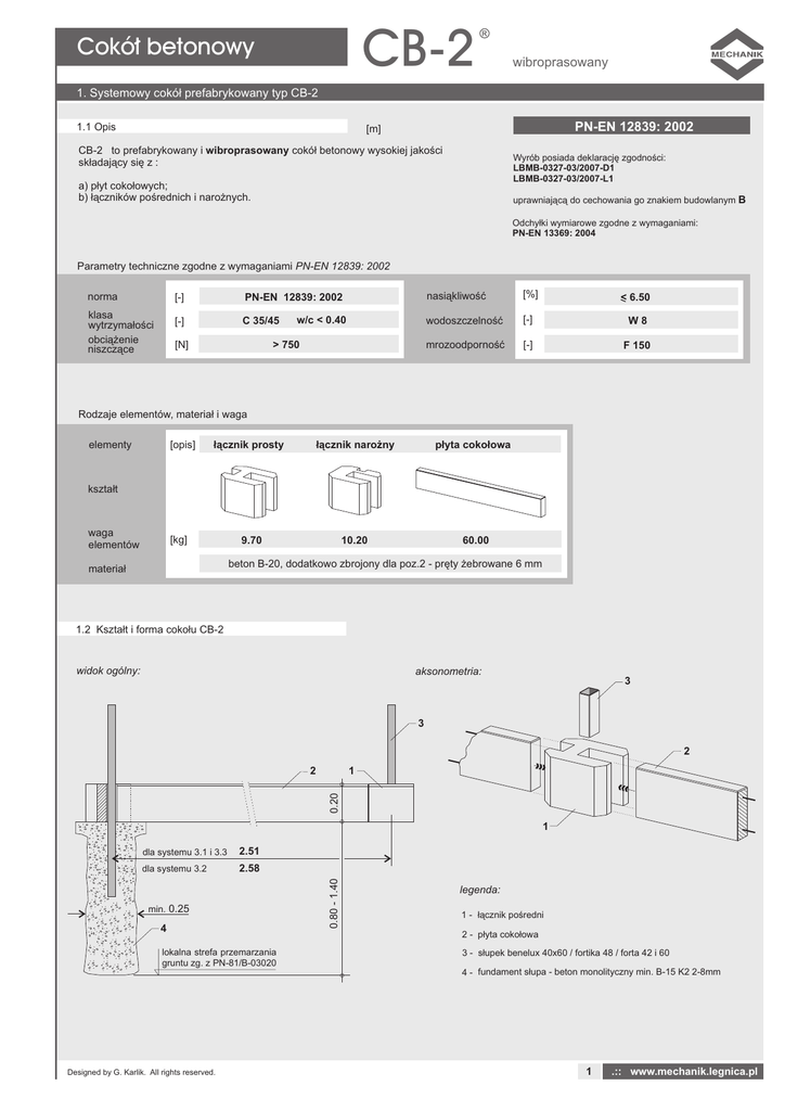 CB-2 Cokól betonowy wibroprasowany 1. Systemowy cokó³ prefabrykowany typ CB-2 1.1 Opis PN-EN 12839: 2002 [m] CB-2 to prefabrykowany i wibroprasowany cokó³ betonowy wysokiej jakoœci sk³adaj¹cy siê z : Wyrób posiada deklaracjê zgodnoœci: LBMB-0327-03/2007-D1 LBMB-0327-03/2007-L1 a) p³yt coko³owych; b) ³¹czników poœrednich i naro¿nych. uprawniaj¹c¹ do cechowania go znakiem budowlanym B Odchy³ki wymiarowe zgodne z wymaganiami: PN-EN 13369: 2004 Parametry techniczne zgodne z wymaganiami PN-EN 12839: 2002 norma klasa wytrzyma³oœci obci¹¿enie niszcz¹ce [-] PN-EN 12839: 2002 [-] C 35/45 [N] w/c < 0.40 > 750 nasi¹kliwoœæ [%] < 6.50 wodoszczelnoœæ [-] W8 mrozoodpornoœæ [-] F 150 Rodzaje elementów, materia³ i waga [opis] elementy ³¹cznik prosty ³¹cznik naro¿ny p³yta coko³owa 9.70 10.20 60.00 kszta³t waga elementów [kg] beton B-20, dodatkowo zbrojony dla poz.2 - prêty ¿ebrowane 6 mm materia³ 1.2 Kszta³t i forma coko³u CB-2 widok ogólny: aksonometria: 3 3 2 1 0.20 2 dla systemu 3.1 i 3.3 2.51 dla systemu 3.2 2.58 min. 0.25 4 lokalna strefa przemarzania gruntu zg. z PN-81/B-03020 0.80 - 1.40 1 legenda: 1 - ³¹cznik poœredni 2 - p³yta coko³owa 3 - s³upek benelux 40x60 / fortika 48 / forta 42 i 60 4 - fundament s³upa - beton monolityczny min. B-15 K2 2-8mm Designed by G. Karlik. All rights reserved. 1 .:: www.mechanik.legnica.pl CB-2 Cokól betonowy wibroprasowany 2. Parametry coko³u 2.1 Aksonomertia [mm] 10 2.2 Wymiary szczegó³owe (*) 210 A skala 1:10 120 60 2490 27 50 50 220 1 2 140 220 45 35 45 27 10 165 61 10 A-A: (*) - zbrojenie p³yty coko³owej > prêty Q=6.0 mm x 2 szt 220 1 - ³¹cznik poœredni 2 - ³¹cznik naro¿ny Designed by G. Karlik. All rights reserved. 2 .:: www.mechanik.legnica.pl