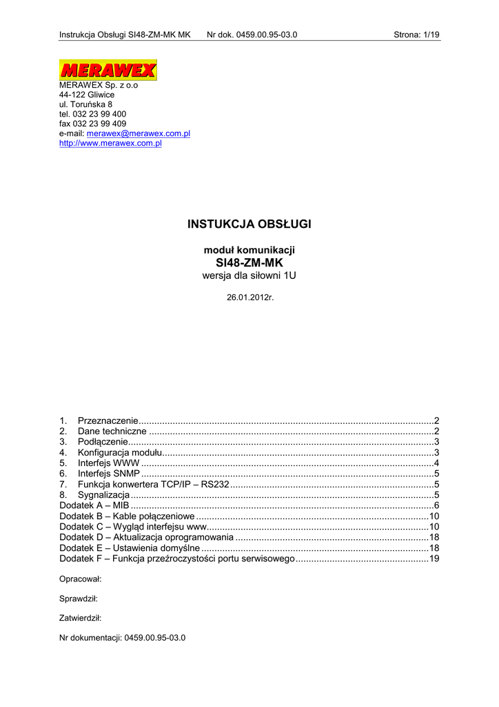 Instrukcja Obsługi SI48-ZM-MK MK Nr dok. 0459.00.95-03.0 Strona: 1/19 MERAWEX Sp. z o.o 44-122 Gliwice ul. Toruńska 8 tel. 032 23 99 400 fax 032 23 99 409 e-mail: [email protected] http://www.merawex.com.pl INSTUKCJA OBSŁUGI moduł komunikacji SI48-ZM-MK wersja dla siłowni 1U 26.01.2012r. 1. Przeznaczenie .................................................................................................................2 2. Dane techniczne .............................................................................................................2 3. Podłączenie.....................................................................................................................3 4. Konfiguracja modułu........................................................................................................3 5. Interfejs WWW ................................................................................................................4 6. Interfejs SNMP ................................................................................................................5 7. Funkcja konwertera TCP/IP – RS232 ..............................................................................5 8. Sygnalizacja ....................................................................................................................5 Dodatek A – MIB ....................................................................................................................6 Dodatek B – Kable połączeniowe .........................................................................................10 Dodatek C – Wygląd interfejsu www.....................................................................................10 Dodatek D – Aktualizacja oprogramowania ..........................................................................18 Dodatek E – Ustawienia domyślne .......................................................................................18 Dodatek F – Funkcja przeźroczystości portu serwisowego ...................................................19 Opracował: Sprawdził: Zatwierdził: Nr dokumentacji: 0459.00.95-03.0 Instrukcja Obsługi SI48-ZM-MK MK Nr dok. 0459.00.95-03.0 Strona: 2/19 1. Przeznaczenie Moduł SI48–ZM–MK jest dedykowany do współpracy z siłowniami telekomunikacyjnymi SI48-1U produkcji MERAWEX. Funkcją modułu jest umożliwienie dostępu do siłowni poprzez sieci komputerowe oparte o TCP/IP. Podstawowe informacje o stanie siłowni dostępne są z poziomu przeglądarki internetowej oraz agenta protokołu SNMP. Moduł przeznaczony jest do zamocowania na szynie TS-35. 2. Dane techniczne Moduł może być zasilany napięciem 48V wprost z wyjścia siłowni lub napięciem 12V po zamontowaniu na szynie z magistralą HBUS. W zależności od konfiguracji moduł realizuje następujące funkcje: • Prostego serwera HTTP prezentującego na stronie www podstawowe informacje o stanie pracy siłowni, konfiguracji, pomiarach, parametrach i alarmach. • Agenta SNMP wraz z funkcją zgłaszania zdarzeń (TRAP), Moduł posiada własny plik definicji obiektów MIB-II, co pozwala na włączenie urządzenia do nadzoru w dowolnym systemie aplikacji menadżera SNMP. • Konwertera TCP/IP na RS232, co umożliwia dostęp z poziomu innych aplikacji wprost do siłowni Konfigurację modułu można wykonać przy pomocy przeglądarki internetowej lub dowolnego programu terminala po podłączeniu komputera do portu serwisowego modułu. Parametry elektryczne i mechaniczne Nazwa Wartość Zakres napięć zasilania przez złącze ZAS 32…48…72V Zakres napięć zasilania przez złącze HBUS 8...12…14V Maksymalny pobór mocy 2W Zakres temperatur pracy -40…55°C Gabaryty (S×W×G) – bez włożonych do gniazd wtyków 36×94×61 Stopień ochrony PN-EN 60529:2003 IP20 Instrukcja Obsługi SI48-ZM-MK MK Nr dok. 0459.00.95-03.0 Strona: 3/19 3. Podłączenie Opis złącz modułu Nazwa złącza RS-232 SERWIS RS232 SYSTEM Numer wyprowadzenia 5 3 4 5 3 4 1 ZAS 2 ETHERNET 1 2 3 4 5 6 7 8 Sygnał GND RxD TxD GND TxD RxD + zasilania – zasilania RX+ RXTX+ NC NC TXNC NC Widok złącza Wymagany wtyk Wymagany kabel RJ12-6/6 Funkcja Podłączenie terminala tekstowego *) RJ12-6/6 kabel prosty Podłączenie siłowni MSTB 2.5/2-ST-5.08 PHOENIX 2× min 0.5mm 2 RJ45-8/8 połączenia z HUB: skrzyżowany PC: prosty Zasilanie modułu Podłączenie sieci Ethernet *) kabel należy zakończyć gniazdem DB9M do podłączenia z komputerem. Patrz dodatek B. 4. Konfiguracja modułu Interfejs RS-232 SERWIS jest izolowany i służy do lokalnego ustalania konfiguracji modułu SI48–ZM–MK. Przed pierwszym podłączeniem modułu do sieci należy ustawić odpowiednie parametry pracy. Do konfiguracji modułu wykorzystuje się dowolny program terminala tekstowego (np. HyperTerminal). Komunikacja odbywa się z następującymi nastawami: prędkość 57600 bps, 8 bitów danych, brak kontroli parzystości, 1 bit stopu. Po włączeniu modułu na ekranie terminala wyświetlana jest informacja o wersji oprogramowania, np.: Merawex SI - ver. 0.24 (23.03.2009) Po wciśnięciu spacji otrzymamy menu zawierające możliwe funkcje serwisowe: i - status o - ustawienia IP s - ustawienia SNMP h - ustawienia HTTP t - ustawienia modbus po TCP p - ustawianie uzytkownikow i hasel g - logowanie goscia (bez hasla) m - adres modbus silowni f - przywroc ustawienia fabryczne r - reset Aby skorzystać z wybranej funkcji należy wybrać odpowiadającą jej literę. Instrukcja Obsługi SI48-ZM-MK MK Nr dok. 0459.00.95-03.0 Strona: 4/19 Poszczególne funkcje serwisowe umożliwiają: status – wyświetla informacje o aktualnej konfiguracji sieciowej modułu: adres IP, maska podsieci, adres bramki oraz adres fizyczny modułu, stan funkcji klienta DHCP oraz ustawienia SNMP i HTTP; ustawienia IP – umożliwia włączenie lub wyłączenie klienta DHCP, ustalenie statycznego adresu IP, maski podsieci oraz adresu bramki; ustawienia SNMP – pozwala na włączenie l