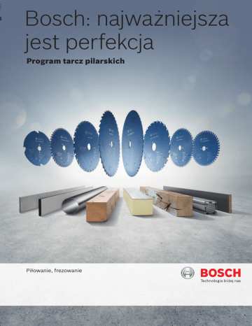 PLPL 4 Bosch: najważniejsza jest perfekcja Program tarcz pilarskich Piłowanie, frezowanie 2 | Przegląd Osprzęt Bosch Program osprzętu Przegląd Innowacyjne i wysoce efektywne produkty gwarantują sukces handlowy. W prowadzonych przez firmę Bosch działach badawczo-rozwojowych projektuje się oraz optymalizuje osprzęt pod kątem wymagań użytkowników. Program wierteł do metalu Program tarcz pilarskich Wiercenie w metalu i drewnie Osprzęt do wkręcania Osprzęt do urządzeń Praca bezprzewodowa Bezpieczeństwo pracy Piłowanie Frezowanie 1 4 Program osprzętu do obróbki betonu i kamienia Program brzeszczotów i otwornic Wyrzynarki Piły szablaste Narzędzia wielofunkcyjne Multi-Cutter Piły otwornice Wiercenie udarowe Wiercenie w kamieniu Dłutowanie 2 5 Program osprzętu diamentowego Program tarcz tnących i ściernych Cięcie osprzętem diamentowym Szlifowanie osprzętem diamentowym Wiercenie osprzętem diamentowym Szlifowanie i polerowanie Cięcie i ścieranie Obróbka szczotkami 3 6 Infolinia dla użytkowników Tel: 0 801 100 900 [email protected] Jest to numer infolinii firmy Bosch, której eksperci szybko i bez zbędnych formalności udzielą odpowiedzi na pytania dotyczące obsługi i zastosowania. Poza godzinami pracy Państwa zapytania przyjmie automatyczna sekretarka. Przegląd | 3 Osprzęt Bosch Spis treści Frezowanie Informacje Doświadczenie firmy Bosch 4 Szeroki asortyment 6 Informacje Expert Piłowanie Wstęp Best 8 Standard Program Best Informacje 12 Top Precision Best for Wood 14 Top Precision Best for Laminated Panel 16 Abrasive i Fine Expert Standard 70 Program Expert Informacje 73 Precyzja pracy: połączenia 75 Nadawanie kształtu: profilowanie 82 Best Expert Program Standard Informacje 90 Precyzja pracy: połączenia 92 Nadawanie kształtu: profilowanie 102 Osprzęt do frezarki uniwersalnej oraz do 115 Standard frezarki do łączników płaskich Bosch Top Precision Best for Multi Material 19 Best for Laminate 20 Expert Informacje ogólne Program Expert Informacje 21 Indeks 117 Expert for Wood 24 Data produkcji ew. data zapakowania 119 Expert for Construct Wood 32 Zamówienia i opakowania 120 Expert for Laminated Panel 33 Przegląd opakowań 121 Expert for High Pressure Laminate 36 Piktogramy 127 Expert for Multi Material 37 Expert for Aluminium 38 Expert for Steel 42 Expert for Sandwich Panel 44 Expert for Fiber Cement 45 Program Standard Informacje 46 Optiline Wood 48 Speedline Wood 51 Construct Wood 53 Multi Material 55 Standard 4 | Przegląd Osprzęt Bosch Tarcze pilarskie i frezy doświadczenie firmy Bosch Kompetencje w produkcji Innowacyjne badania i rozwój W największej na świecie fabryce wysokiej jakości Nasz nowoczesny ośrodek badawczo-rozwojowy na- tarcz pilarskich wykorzystujemy najnowocześniejsze rzędzi skrawających umożliwia nam wprowadzanie i najbardziej zaawansowane technologicznie maszy- dalszych ulepszeń i przygotowywanie kolejnych inno- ny oraz procesy: np. cięcie laserowe blach stalowych, wacji. Nowa technologia wypełnianych poliuretanem lutowanie zębów z węglików spiekanych, szlifowanie szczelin w tarczach antywibracyjnych o niewielkiej zębów – gwarantuje to zdecydowanie wyższą jakość emisji hałasu jest zaledwie jednym z wielu naszych in- naszych produktów. nowacyjnych rozwiązań. Wyjątkowe właściwości System Vibration Control Specjalnie skonstruowane szczeliny dylatacyjne zapewniają wyjątkowo spokojną pracę. Rozmieszczenie szczelin bazuje na wnioskach z symulacji laboratoryjnych i pomaga obniżyć emisję hałasu oraz drgania. Przegląd | 5 Osprzęt Bosch Wiodąca technologia produkcji węglików spieka- Wiodąca technologia powlekania nych Sami opracowujemy i produkujemy nasze wyjątko- Produkcja własna proszku węglikowego jest unikatem we powłoki Cleanteq i Proteqtion. Ich właściwo- w skali światowej. Z precyzyjnie odmierzonych ilości ści chłodzące i zapobiegające przywieraniu wydłu- kobaltu, tytanu oraz wolframu tworzymy dopasowane żają żywotność produktu i umożliwiają wykonanie do różnorodnych zastosowań receptury, które pozwa- precyzyjnych cięć. lają osiągnąć maksymalną żywotność i jakość cięcia. Microteq Powłoka Proteqtion oraz Cleanteq Produkujemy m.in. węgliki spiekane o najdrobniej- Nasze wyjątkowe powłoki minimalizują przywieranie szych ziarnach (Microteq). Wielkość ziarna węglików do tarczy i zębów substancji zawartych w materiale, spiekanych ma znaczenie dla ostrości i żywotności takich jak żywica czy soki drzewne. Pozwala to ostrza skrawającego. Im drobniejsze ziarno węgliko- ograniczyć tarcie, a tarcza mniej się nagrzewa. we, tym wolniej zużywa się ostrze. Dzięki drobnemu Dodatkowo powłoka zapewnia wysoki stopień i bardzo drobnemu ziarnu naszego proszku węgliko- ochrony antykorozyjnej – wydłuża to żywotność wego możemy zaoferować wysoką jakość cięcia tarczy oraz zwiększa precyzję cięcia. i trwałość produktów. 6 | Przegląd Osprzęt Bosch Tarcze pilarskie Szeroki asortyment Best Expert Standard Bardzo wymagające zastoso- Perfekcyjnie wykonane cięcia Optymalnie wykonane cięcia Standardowe węgliki spiekane wania – jakość przemysłowa Zęby Microteq Microteq Warstwa wierzchnia Cleanteq Proteqtion Lakier Szczeliny antywibracyjne Stabilteq System Vibration Control częściowo Stalowy korpus wycinane laserem wycinane laserem wycinane laserem lub sztancowane Stabilizujący pierścień obiegowy tak tak tak Szczelina dylatacyjna wycinane laserem wycinane laserem wycinane laserem lub sztancowane Frezy Szeroki asortyment Węgliki spiekane Expert Standard Perfekcyjny rezultat cięcia Optymalny rezultat cięcia Microteq standardowe węgliki spiekane Warstwa wierzchnia Proteqtion, Cleanteq elektrostatyczna powłoka proszkowa Kąt cięcia kąt ścinania 0° i nachylony kąt ścinania 0° Długość robocza frezy do wpustów i frezy do wyrównywania powyżej 50 mm frezy do wpustów do 40 mm Piłowanie 8 | Piłowanie 