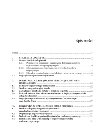 ä Wstęp ..................................................................................................................................... 5 I. 1.1. 1.2. II. 2.1. 2.2. 2.3. 2.4. 2.5. III. 3.1. 3.2. 3.3. 3.4. STRATEGIA LOGISTYKI .................................................................................. 7 Geneza i definicja logistyki .................................................................................. 7 1.1.1. Podstawowe znaczenie i zagadnienia dotyczące logistyki w przestrzeni usług turystycznych .......................................................... 9 1.1.2. Istota zarządzania logistycznego w przedsiębiorstwie turystycznym ........................................................................................... 12 1.1.3. Globalny wymiar logistycznej obsługi ruchu turystycznego ............. 16 Logistyczne aspekty obsługi klienta ................................................................ 18 LOGISTYKA, A ZARZĄDZANIE PRZEDSIĘBIORSTWEM HOTELARSKIM ................................................................................................. 23 Podstawy logistycznego zarządzania ............................................................... 23 Struktura organizacyjna hotelu ........................................................................ 27 Zarządzanie zasobami hotelu w aspekcie logistyki ...................................... 32 Łańcuch dostaw, jako nieodzowny element w logistyce zaopatrzenia usług hotelarskich ............................................................................................... 35 Logistyczna praca hotelu z wykorzystaniem Outsourcingu oraz Just In Time ................................................................................................. 37 LOGISTYKA W DZIAŁALNOŚCI BIURA PODRÓŻY ............................. 39 Struktury logistycznego funkcjonowania przedsiębiorstw turystycznych ......................................................................... 39 Organizacja imprezy turystycznej ................................................................... 45 Techniczne środki organizacji w obsłudze ruchu turystycznego .............. 51 Just In Time oraz Outsourcing w logistycznej obsłudze ruchu turystycznego ........................................................................................... 51 IV. 4.1. 4.2. 4.3. LOGISTYKA USŁUG TRANSPORTOWYCH OBSŁUGUJĄCYCH RUCH TURYSTYCZNY ..................................................................................... 57 Wzajemne relacje transportu oraz tursytyki ................................................. 57 Logistyka w transporcie ..................................................................................... 60 4.2.1. Transport autokarowy ............................................................................. 62 4.2.2. Transport samochodowy ........................................................................ 65 4.2.3. Transport lotniczy ................................................................................... 65 4.2.4. Transport kolejowy ................................................................................. 68 4.2.5. Transport morski ..................................................................................... 70 Outsourcing usług transportowych ................................................................. 71 Zakończenie ....................................................................................................................... 73 Bibliografia ......................................................................................................................... 75