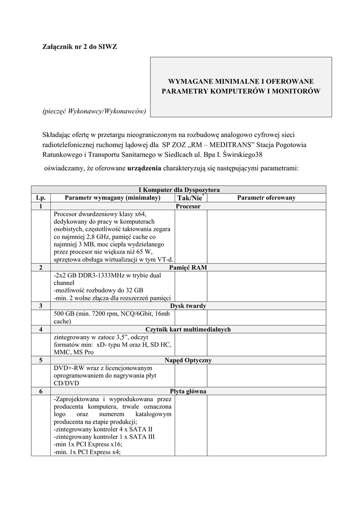 Załącznik nr 2 do SIWZ WYMAGANE MINIMALNE I OFEROWANE PARAMETRY KOMPUTERÓW I MONITORÓW (pieczęć Wykonawcy/Wykonawców) Składając ofertę w przetargu nieograniczonym na rozbudowę analogowo cyfrowej sieci radiotelefonicznej ruchomej lądowej dla SP ZOZ „RM – MEDITRANS” Stacja Pogotowia Ratunkowego i Transportu Sanitarnego w Siedlcach ul. Bpa I. Świrskiego38 oświadczamy, że oferowane urządzenia charakteryzują się następującymi parametrami: Lp. 1 2 3 4 5 6 I Komputer dla Dyspozytora Parametr wymagany (minimalny) Parametr oferowany Tak/Nie* Procesor Procesor dwurdzeniowy klasy x64, dedykowany do pracy w komputerach osobistych, częstotliwość taktowania zegara co najmniej 2,8 GHz, pamięć cache co najmniej 3 MB, moc ciepła wydzielanego przez procesor nie większa niż 65 W, sprzętowa obsługa wirtualizacji w tym VT-d. Pamięć RAM -2x2 GB DDR3-1333MHz w trybie dual channel -możliwość rozbudowy do 32 GB -min. 2 wolne złącza dla rozszerzeń pamięci Dysk twardy 500 GB (min. 7200 rpm, NCQ/6Gbit, 16mb cache) Czytnik kart multimedialnych zintegrowany w zatoce 3,5”, odczyt formatów min: xD- typu M oraz H, SD HC, MMC, MS Pro Napęd Optyczny DVD+-RW wraz z licencjonowanym oprogramowaniem do nagrywania płyt CD/DVD Płyta główna -Zaprojektowana i wyprodukowana przez producenta komputera, trwale oznaczona logo oraz numerem katalogowym producenta na etapie produkcji; -zintegrowany kontroler 4 x SATA II -zintegrowany kontroler 1 x SATA III -min 1x PCI Express x16; -min. 1x PCI Express x4; -min. 1x PCI Express x1 -min 1x PCI 32bit; - możliwość zabezpieczenia hasłem dostępu do systemu operacyjnego i dostępu do BIOS komputera - zabezpieczenia te muszą działać niezależnie od siebie; - możliwość zabezpieczenia dysku twardego w sposób uniemożliwiający możliwość odczytu danych po podłączeniu dysku do innego komputera; -możliwość manualnego obniżenia poziomu głośności komputera z poziomu BIOS poprzez aktywację funkcji pracy z obniżoną głośnością dla dysku twardego, napędu optycznego i wentylatorów wbudowanych wewnątrz obudowy, wbudowany w płytę w pełni funkcjonalny głośnik; - możliwość odczytania z BIOS komputera informacji o numerze seryjnym, numerze inwentaryzacyjnym; -możliwość odczytania z BIOS dokładnych informacji o procesorze – co najmniej model, typ, częstotliwości szyny systemowej, prędkości rzeczywistej; -możliwość odczytania bezpośrednio z BIOS informacji o wersji i dacie wydania używanej wersji BIOS; - możliwość sprawdzenia z poziomu BIOS modelu i wersji firmware dysku twardego oraz modelu i wersji firmware napędu optycznego; -możliwość wyłączenia/włączenia pracy wielordzeniowej procesora z pozycji BIOS (konieczne w przypadku działania niektórych aplikacji); -możliwość wyłączenia portów COM, LPT, USB, FDD z BIOS komputera bez pośrednictwa systemu operacyjnego, ani bez pośrednictwa urządzeń zewnętrznych; -możliwość ograniczenia dostępu do portów USB dla dysków, pamięci flash oraz HUBów pracujących w standardzie USB 1.x i 2.x; -możliwość automatycznego wyłączenia nieużywanych portów USB; -możliwość ograniczenia dostępu do portów USB dla wszystkich typów urządzeń z wyłączeniem myszy i klawiatury USB; -możliwość wyłączenia automatycznej instalacji myszy i klawiatury USB po ich odłączeniu (powtórna instalacja możliwa jedynie po interwencji administratora); - rozwiązanie sprzętowe zintegrowane w płycie głównej komputera zapewniające możliwość przywrócenia BIOS w 7 8 9 10 11 przypadku jego uszkodzenia (ataki wirusów itp.) lub nieudanej aktualizacji bez pośrednictwa jakichkolwiek urządzeń zewnętrznych i w sytuacji gdy obraz na monitorze nie jest wyświetlany i/lub nie ma możliwości wprowadzania znaków za pomocą konsoli tekstowej; -zintegrowany z płytą główną układ szyfrujący umożliwiający zaszyfrowanie poufnych dokumentów oraz poczty elektronicznej, umożliwiający tworzenie zaszyfrowanych wirtualnych partycji. Usunięcie zabezpieczenia powoduje trwałe uszkodzenie płyty głównej a odczytanie zaszyfrowanych danych nie jest możliwe na innym urządzeniu. Układ zgodny ze standardem TPM 1.2 Karta dźwiękowa Zintegrowana w standardzie High Definition Karta sieciowa 10/100/1000 Mbps, WoL, PXE 2.1, Wymagana jest możliwość odczytania adresu MAC karty z BIOS komputera Karta graficzna Zintegrowana, z możliwością dynamicznego przydzielania pamięci w obrębie pamięci systemowej, ze wsparciem dla DirectX 10.1, HDCP i OpenGL 2.1, np. Intel HD Graphics lub równoważna, możliwość pracy na dwóch ekranach jednocześnie; Porty I/O 14 x USB 2.0 (w tym 4 z przodu obudowy); 1 x RS-232; 2 x porty PS2; 1 x DVI; 1 x DisplayPort; 1 x wejście audio, 2 x wyjście audio 2 x wejście mikrofonowe; 1 x RJ45; nie dopuszcza się możliwości zasłonięcia złączy USB znajdujących się na panelu przednim jakimikolwiek zaślepkami, maskownicami utrudniającymi wzrokową weryfikację ich użycia – np. obecności klucza USB czy innego urządzenia podłączonego do złączy na panelu przednim obudowy komputera; Obudowa -Typu Tower lub Minitower; -obudowa w kolorze czarnym; -w standardzie µATX; -zasilacz o mocy maksymalnej 280W z aktywnym filtrem PFC, o gwarantowanej sprawności 85% przy maksymalnym obciążeniu oraz 86% przy obciążeniu w 50% (wymagane dostarczenie oświadczenia producenta); -minimum dwie zewnętrzne zatoki 5.25 cala, w tym jedna musi zostać wolna; -minimum dwie zewnętrzne zatoki 3,5 cala; -minimum dwie wewnętrzne zatoki 3,5 cala; -nie dopuszcza się, aby maskownica obudowy czy inne elementy wystawały poza jej obrys określony maksymalnymi wymiarami obudowy; -otwierana boczna ściana obudowy umożliwiająca dostęp do wszystkich podzespołów komputera; -obudowa trwale oznaczona logo producenta komputera; - znak CE oraz numer seryjny komputera umieszczony na górnej części obudowy; -slot Kensington; -Obudowa zapewnia