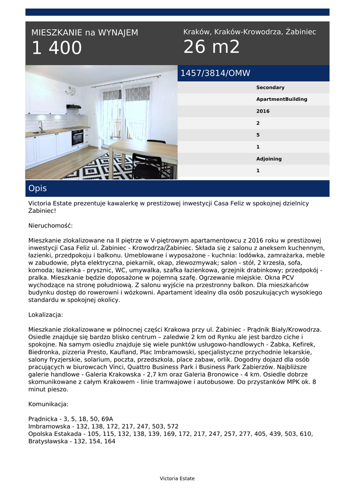 MIESZKANIE na WYNAJEM 1 400 Kraków, Kraków-Krowodrza, Żabiniec 26 m2 1457/3814/OMW Secondary ApartmentBuilding 2016 2 5 1 Adjoining 1 Opis Victoria Estate prezentuje kawalerkę w prestiżowej inwestycji Casa Feliz w spokojnej dzielnicy Żabiniec! Nieruchomość: Mieszkanie zlokalizowane na II piętrze w V-piętrowym apartamentowcu z 2016 roku w prestiżowej inwestycji Casa Feliz ul. Żabiniec - Krowodrza/Żabiniec. Składa się z salonu z aneksem kuchennym, łazienki, przedpokoju i balkonu. Umeblowane i wyposażone - kuchnia: lodówka, zamrażarka, meble w zabudowie, płyta elektryczna, piekarnik, okap, zlewozmywak; salon - stół, 2 krzesła, sofa, komoda; łazienka - prysznic, WC, umywalka, szafka łazienkowa, grzejnik drabinkowy; przedpokój pralka. Mieszkanie będzie doposażone w pojemną szafę. Ogrzewanie miejskie. Okna PCV wychodzące na stronę południową. Z salonu wyjście na przestronny balkon. Dla mieszkańców budynku dostęp do rowerowni i wózkowni. Apartament idealny dla osób poszukujących wysokiego standardu w spokojnej okolicy. Lokalizacja: Mieszkanie zlokalizowane w północnej części Krakowa przy ul. Żabiniec - Prądnik Biały/Krowodrza. Osiedle znajduje się bardzo blisko centrum – zaledwie 2 km od Rynku ale jest bardzo ciche i spokojne. Na samym osiedlu znajduje się wiele punktów usługowo-handlowych - Żabka, Kefirek, Biedronka, pizzeria Presto, Kaufland, Plac Imbramowski, specjalistyczne przychodnie lekarskie, salony fryzjerskie, solarium, poczta, przedszkola, place zabaw, orlik. Dogodny dojazd dla osób pracujących w biurowcach Vinci, Quattro Business Park i Business Park Zabierzów. Najbliższe galerie handlowe - Galeria Krakowska - 2,7 km oraz Galeria Bronowice - 4 km. Osiedle dobrze skomunikowane z całym Krakowem - linie tramwajowe i autobusowe. Do przystanków MPK ok. 8 minut pieszo. Komunikacja: Prądnicka - 3, 5, 18, 50, 69A Imbramowska - 132, 138, 172, 217, 247, 503, 572 Opolska Estakada - 105, 115, 132, 138, 139, 169, 172, 217, 247, 257, 277, 405, 439, 503, 610, Bratysławska - 132, 154, 164 Victoria Estate Opłaty: 1400 zł najem + ok. 200 zł czynsz administracyjny + prąd Gorąco polecam i zapraszam na prezentację mieszkania! Natalia Sujdak tel. +48 516 547 102 email: [email protected] Victoria Estate Powered by TCPDF (www.tcpdf.org)