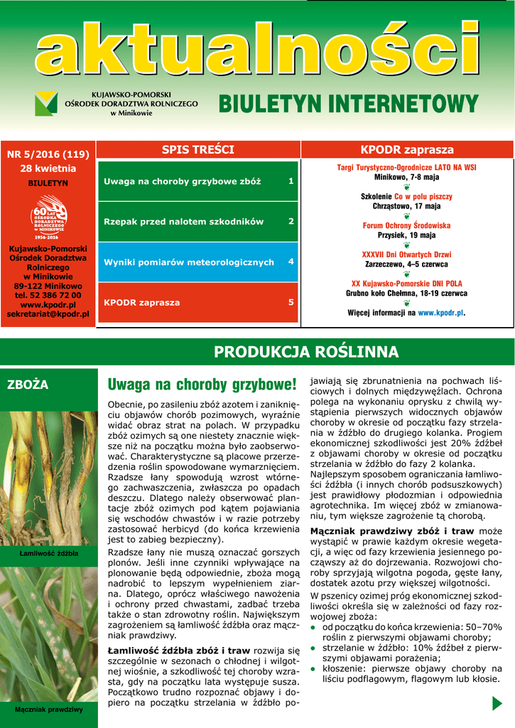 NR 5/2016 (119) 28 kwietnia biuletyn Spis treści Uwaga na choroby grzybowe zbóż KPODR zaprasza 1 Targi Turystyczno-Ogrodnicze LATO NA WSI Minikowo, 7-8 maja Szkolenie Co w polu piszczy Chrząstowo, 17 maja Rzepak przed nalotem szkodników Kujawsko-Pomorski Ośrodek Doradztwa Rolniczego w Minikowie 89-122 Minikowo tel. 52 386 72 00 www.kpodr.pl [email protected] 2 Forum Ochrony Środowiska Przysiek, 19 maja Wyniki pomiarów meteorologicznych 4 XXXVII Dni Otwartych Drzwi Zarzeczewo, 4–5 czerwca KPODR zaprasza 5 XX Kujawsko-Pomorskie DNI POLA Grubno koło Chełmna, 18-19 czerwca Więcej informacji na www.kpodr.pl. produkcja roślinna ZBOŻA Łamliwość źdźbła Mączniak prawdziwy Uwaga na choroby grzybowe! Obecnie, po zasileniu zbóż azotem i zaniknięciu objawów chorób pozimowych, wyraźnie widać obraz strat na polach. W przypadku zbóż ozimych są one niestety znacznie większe niż na początku można było zaobserwować. Charakterystyczne są placowe przerzedzenia roślin spowodowane wymarznięciem. Rzadsze łany spowodują wzrost wtórnego zachwaszczenia, zwłaszcza po opadach deszczu. Dlatego należy obserwować plantacje zbóż ozimych pod kątem pojawiania się wschodów chwastów i w razie potrzeby zastosować herbicyd (do końca krzewienia jest to zabieg bezpieczny). Rzadsze łany nie muszą oznaczać gorszych plonów. Jeśli inne czynniki wpływające na plonowanie będą odpowiednie, zboża mogą nadrobić to lepszym wypełnieniem ziarna. Dlatego, oprócz właściwego nawożenia i ochrony przed chwastami, zadbać trzeba także o stan zdrowotny roślin. Największym zagrożeniem są łamliwość źdźbła oraz mączniak prawdziwy. Łamliwość źdźbła zbóż i traw rozwija się szczególnie w sezonach o chłodnej i wilgotnej wiośnie, a szkodliwość tej choroby wzrasta, gdy na początku lata występuje susza. Początkowo trudno rozpoznać objawy i dopiero na początku strzelania w źdźbło po- jawiają się zbrunatnienia na pochwach liściowych i dolnych międzywęźlach. Ochrona polega na wykonaniu oprysku z chwilą wystąpienia pierwszych widocznych objawów choroby w okresie od początku fazy strzelania w źdźbło do drugiego kolanka. Progiem ekonomicznej szkodliwości jest 20% źdźbeł z objawami choroby w okresie od początku strzelania w źdźbło do fazy 2 kolanka. Najlepszym sposobem ograniczania łamliwości źdźbła (i innych chorób podsuszkowych) jest prawidłowy płodozmian i odpowiednia agrotechnika. Im więcej zbóż w zmianowaniu, tym większe zagrożenie tą chorobą. Mączniak prawdziwy zbóż i traw może wystąpić w prawie każdym okresie wegetacji, a więc od fazy krzewienia jesiennego począwszy aż do dojrzewania. Rozwojowi choroby sprzyjają wilgotna pogoda, gęste łany, dostatek azotu przy większej wilgotności. W pszenicy ozimej próg ekonomicznej szkodliwości określa się w zależności od fazy rozwojowej zboża: l od początku do końca krzewienia: 50–70% roślin z pierwszymi objawami choroby; l strzelanie w źdźbło: 10% źdźbeł z pierwszymi objawami porażenia; l kłoszenie: pierwsze objawy choroby na liściu podflagowym, flagowym lub kłosie. zboża Zagrożenie chorobą wzrasta wraz ze wzrostem roślin. Jest to spowodowane tym, że mączniak osłabiając rośliny ułatwia ich porażenie także przez inne grzyby. Przy jednoczesnym wystąpieniu łamliwości i mączniaka warto rozważyć zastosowanie środka zarejestrowanego do zwalczania obu chorób. Wtedy próg ekonomicznej szkodliwości wystarczy określić tylko dla jednej z nich. Rzepak Spośród wielu gatunków owadów żerujących na rzepaku, najgroźniejszym w Polsce jest słodyszek rzepakowy. Chociaż rozpoznanie chrząszczy tego owada nie sprawia trudności żadnemu plantatorowi, to jednak szkodnik ten ciągle wyrządza duże straty. Coraz częściej również szkodniki łuszczynowe atakują plantacje przekwitającego rzepaku i coraz bardziej obniżają plon. Dlatego krótko przed „zażółceniem się” pól warto przypomnieć sobie o tych szkodnikach. słodyszek rzepakowy 2 Słodyszek rzepakowy jest owalnym chrząszczem z rodziny łyszczynkowatych, wielkości 1,5–2,5 mm, o zielononiebieskawym połysku. Pojawia się wiosną, gdy temperatura gleby wynosi 10–11°C. Początkowo odżywia się pyłkiem i nektarem kwiatów innych gatunków roślin. Gdy temperatura osiągnie 15°C, a wegetacja rzepaku osiąga fazę początku rozwoju pąków kwiatowych, słodyszek nalatuje na plantacje rzepaczane. Chrząszcze przegryzają pąki, aby dostać się do pyłku kwiatowego, którym się żywią. Powstałe w ten sposób uszkodzenia powodują usychanie i odpadanie pąków. Efektem żerowania we wczesnym stadium rozwojowym pąka kwiatowego są same szypułki kwiatowe, bez zawiązanych łuszczyn. Najgroźniejszy dla upraw jest słodyszek żerujący na roślinach rzepaku w fazie zwartego kwiatostanu. Największe uszkodzenia powstają w niewyrośniętych jeszcze pąkach kwiatowych, ponieważ samice wygryzają w nich dość duży otwór, by dostać się do nasady pylników, gdzie składają pojedynczo jaja. Po kilku dniach wylęgają się larwy, których głównym pożywieniem jest pyłek kwiatowy i nektar. W tym roku łany zbóż ozimych są znacznie przerzedzone, w związku z czym należy ostrożnie stosować regulatory wzrostu (preparaty do skracania źdźbła). Ich użycie może być na większości pól zbędne. Jest ono konieczne tylko na plantacjach o dużej gęstości roślin, na których planowane jest bardzo wysokie nawożenie azotowe. Marek Radzimierski Termin nalotu słodyszka zależy od przebiegu pogody; w tym roku będzie to zapewne stosunkowo późno. Jednak trzeba pamiętać, że im bardziej zwarty pąk, tym większe straty powodowane przez tego szkodnika. Kwitnący rzepak nie jest już narażony na szkody wyrządzane żerem chrząszczy; w tym stadium rozwoju roślin słodyszek może nawet przyczynić się do lepszego zapylenia rzepaku, poprzez przenoszenie pył