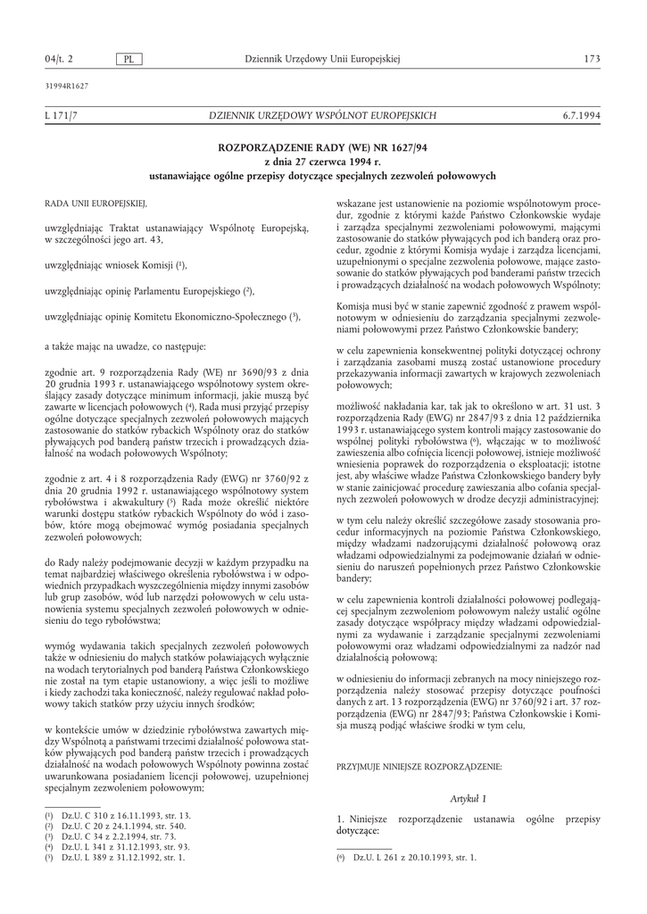04/t. 2 Dziennik Urzędowy Unii Europejskiej PL 173 31994R1627 L 171/7 DZIENNIK URZĘDOWY WSPÓLNOT EUROPEJSKICH 6.7.1994 ROZPORZĄDZENIE RADY (WE) NR 1627/94 z dnia 27 czerwca 1994 r. ustanawiające ogólne przepisy dotyczące specjalnych zezwoleń połowowych RADA UNII EUROPEJSKIEJ, uwzględniając Traktat ustanawiający Wspólnotę Europejską, w szczególności jego art. 43, uwzględniając wniosek Komisji (1), uwzględniając opinię Parlamentu Europejskiego (2), uwzględniając opinię Komitetu Ekonomiczno-Społecznego (3), a także mając na uwadze, co następuje: zgodnie art. 9 rozporządzenia Rady (WE) nr 3690/93 z dnia 20 grudnia 1993 r. ustanawiającego wspólnotowy system określający zasady dotyczące minimum informacji, jakie muszą być zawarte w licencjach połowowych (4), Rada musi przyjąć przepisy ogólne dotyczące specjalnych zezwoleń połowowych mających zastosowanie do statków rybackich Wspólnoty oraz do statków pływających pod banderą państw trzecich i prowadzących działalność na wodach połowowych Wspólnoty; zgodnie z art. 4 i 8 rozporządzenia Rady (EWG) nr 3760/92 z dnia 20 grudnia 1992 r. ustanawiającego wspólnotowy system rybołówstwa i akwakultury (5) Rada może określić niektóre warunki dostępu statków rybackich Wspólnoty do wód i zasobów, które mogą obejmować wymóg posiadania specjalnych zezwoleń połowowych; do Rady należy podejmowanie decyzji w każdym przypadku na temat najbardziej właściwego określenia rybołówstwa i w odpowiednich przypadkach wyszczególnienia między innymi zasobów lub grup zasobów, wód lub narzędzi połowowych w celu ustanowienia systemu specjalnych zezwoleń połowowych w odniesieniu do tego rybołówstwa; wymóg wydawania takich specjalnych zezwoleń połowowych także w odniesieniu do małych statków poławiających wyłącznie na wodach terytorialnych pod banderą Państwa Członkowskiego nie został na tym etapie ustanowiony, a więc jeśli to możliwe i kiedy zachodzi taka konieczność, należy regulować nakład połowowy takich statków przy użyciu innych środków; w kontekście umów w dziedzinie rybołówstwa zawartych między Wspólnotą a państwami trzecimi działalność połowowa statków pływających pod banderą państw trzecich i prowadzących działalność na wodach połowowych Wspólnoty powinna zostać uwarunkowana posiadaniem licencji połowowej, uzupełnionej specjalnym zezwoleniem połowowym; wskazane jest ustanowienie na poziomie wspólnotowym procedur, zgodnie z którymi każde Państwo Członkowskie wydaje i zarządza specjalnymi zezwoleniami połowowymi, mającymi zastosowanie do statków pływających pod ich banderą oraz procedur, zgodnie z którymi Komisja wydaje i zarządza licencjami, uzupełnionymi o specjalne zezwolenia połowowe, mające zastosowanie do statków pływających pod banderami państw trzecich i prowadzących działalność na wodach połowowych Wspólnoty; Komisja musi być w stanie zapewnić zgodność z prawem wspólnotowym w odniesieniu do zarządzania specjalnymi zezwoleniami połowowymi przez Państwo Członkowskie bandery; w celu zapewnienia konsekwentnej polityki dotyczącej ochrony i zarządzania zasobami muszą zostać ustanowione procedury przekazywania informacji zawartych w krajowych zezwoleniach połowowych; możliwość nakładania kar, tak jak to określono w art. 31 ust. 3 rozporządzenia Rady (EWG) nr 2847/93 z dnia 12 października 1993 r. ustanawiającego system kontroli mający zastosowanie do wspólnej polityki rybołówstwa (6), włączając w to możliwość zawieszenia albo cofnięcia licencji połowowej, istnieje możliwość wniesienia poprawek do rozporządzenia o eksploatacji; istotne jest, aby właściwe władze Państwa Członkowskiego bandery były w stanie zainicjować procedurę zawieszania albo cofania specjalnych zezwoleń połowowych w drodze decyzji administracyjnej; w tym celu należy określić szczegółowe zasady stosowania procedur informacyjnych na poziomie Państwa Członkowskiego, między władzami nadzorującymi działalność połowową oraz władzami odpowiedzialnymi za podejmowanie działań w odniesieniu do naruszeń popełnionych przez Państwo Członkowskie bandery; w celu zapewnienia kontroli działalności połowowej podlegającej specjalnym zezwoleniom połowowym należy ustalić ogólne zasady dotyczące współpracy między władzami odpowiedzialnymi za wydawanie i zarządzanie specjalnymi zezwoleniami połowowymi oraz władzami odpowiedzialnymi za nadzór nad działalnością połowową; w odniesieniu do informacji zebranych na mocy niniejszego rozporządzenia należy stosować przepisy dotyczące poufności danych z art. 13 rozporządzenia (EWG) nr 3760/92 i art. 37 rozporządzenia (EWG) nr 2847/93; Państwa Członkowskie i Komisja muszą podjąć właściwe środki w tym celu, PRZYJMUJE NINIEJSZE ROZPORZĄDZENIE: Artykuł 1 (1) (2) (3) (4) (5) Dz.U. C 310 z 16.11.1993, str. 13. Dz.U. C 20 z 24.1.1994, str. 540. Dz.U. C 34 z 2.2.1994, str. 73. Dz.U. L 341 z 31.12.1993, str. 93. Dz.U. L 389 z 31.12.1992, str. 1. 1. Niniejsze dotyczące: rozporządzenie ustanawia (6) Dz.U. L 261 z 20.10.1993, str. 1. ogólne przepisy 174 Dziennik Urzędowy Unii Europejskiej PL a) specjalnych zezwoleń połowowych mających zastosowanie do działalności połowowej statków rybackich Wspólnoty, podlegających środkom wspólnotowym, w odniesieniu do warunków dostępu do wód i zasobów, przyjętych zgodnie z art. 4 i 8 rozporządzenia (EWG) nr 3760/92. Za każdym razem gdy Komisja podejmuje decyzję o warunkach dostępu, ocenia potrzebę wprowadzenia specjalnych zezwoleń połowowych; 04/t. 2 Artykuł 4 1. Państwo Członkowskie wydaje i zarządza specjalnymi zezwoleniami połowowymi dla statków pływających pod jego banderą zgodnie z odpowiednimi przepisami prawa wspólnotowego, włączając w to środki określone w art. 11 rozporządzenia (EWG) nr 3760/92. b) licencji połowowych i specjaln