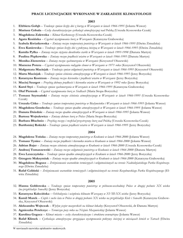 PRACE LICENCJACKIE WYKONANE W ZAKŁADZIE KLIMATOLOGII 2003 1. 2. 3. 4. 5. 6. 7. 8. 9. 10. 11. 12. 13. 14. 15. 16. 17. 18. 19. 20. 21. 22. 23. Elżbieta Gołąb – Tendencje zmian liczby dni z burzą w Warszawie w latach 1966-1995 (Jolanta Wawer) Mariusz Cebula – Cechy charakterystyczne cyrkulacji atmosferycznej nad Polską (Urszula Kossowska-Cezak) Magdalena Zalewska – Klimat Karkonoszy (Urszula Kossowska-Cezak) Agata Kosińska – Częstość występowania burz w Warszawie (Katarzyna Grabowska) Izabela Kwiatkowska – Zmiany roczne temperatury powietrza w Warszawie w latach 1966-1995 (Elwira Żmudzka) Ewa Kaniewska – Tendencje zmian liczby dni z pokrywą śnieżną w Warszawie w latach 1966-1995 (Elwira Żmudzka) Kamila Pyłka – Zmiany roczne stężenia dwutlenku siarki w Warszawie w latach 1993-1998 (Danuta Martyn) Paulina Piątkowska – Zmiany roczne prędkości wiatru w Warszawie w latach 1966-1995 (Danuta Martyn) Monika Zienowicz – Zmiany roczne zachmurzenia w Warszawie (Krzysztof Olszewski) Marzena Potera – Częstość występowania rodzajów chmur w Warszawie w 1971 roku (Krzysztof Olszewski) Małgorzata Maciejak – Tendencja zmian wilgotności powietrza w Warszawie w latach 1966-1995 (Krzysztof Olszewski) Marta Maciejak – Tendencje zmian ciśnienia atmosferycznego w Warszawie w latach 1966-1995 (Jerzy Boryczka) Katarzyna Kostrzon – Zmiany roczne kierunku i prędkości wiatru w Warszawie (Jerzy Boryczka) Maciej Szurgot – Przebieg dobowy prędkości i kierunku wiatru w Warszawie w 1992 roku (Jerzy Boryczka) Karol Styś – Tendencje zmian zachmurzenia w Warszawie w latach 1966-1995 (Katarzyna Grabowska) Olaf Pietrzak – Częstość występowania burz w Siedlcach (Maria Stopa-Boryczka) Tomasz Szymański – Zmiany roczne ciśnienia atmosferycznego w Warszawie w latach 1966-1995 (Urszula KossowskaCezak) Urszula Citko – Tendencje zmian temperatury powietrza w Białymstoku i Warszawie w latach 1966-1995 (Jolanta Wawer) Magdalena Gozdecka – Tendencje zmian opadów atmosferycznych w Warszawie w latach 1966-1995 (Jolanta Wawer) Danuta Dziedzic – Zmiany roczne opadów atmosferycznych w Warszawie w latach 1966-1995 (Jolanta Wawer) Bartosz Wojtulewicz – Zmiany dobowe burz w Polsce (Maria Stopa-Boryczka) Barbara Błachnio – Przebieg roczny i rozkład przestrzenny burz nad Polską (Urszula Kossowska-Cezak) Bartłomiej Rokicki – Tendencje zmian prędkości wiatru w Warszawie w latach 1966-1995 (Jerzy Boryczka) 2004 24. 25. 26. 27. 28. 29. 30. Magdalena Tońska – Zmiany roczne temperatury powietrza w Krakowie w latach 1966-2000 (Jolanta Wawer) Tomasz Tyniec – Zmiany roczne prędkości i kierunku wiatru w Krakowie w latach 1966-2000 (Jolanta Wawer) Adrian Bajer – Zmiany roczne ciśnienia atmosferycznego w Krakowie w latach 1966-2000 (Urszula Kossowska-Cezak) Andrzej Tomaszewski – Zmiany roczne wilgotności powietrza w Krakowie w latach 1966-2000 (Danuta Martyn) Ewa Leszczyńska – Tendencje zmian opadów atmosferycznych w Krakowie w latach 1966-2000 (Jerzy Boryczka) Grzegorz Maksymiuk – Zmiany roczne opadów atmosferycznych w Krakowie w latach 1966-2000 (Katarzyna Grabowska) Magdalena Bogusz – Zróżnicowanie warunków termicznych i wilgotnościowych na terenie Nadnidziańskiego Parku Krajobrazowego (Elwira Żmudzka) 31. Rafał Celiński – Zróżnicowanie warunków termicznych i wilgotnościowych na terenie Kozubowskiego Parku Krajobrazowego (Elwira Żmudzka) 2005 32. Hanna Gołdowska – Tendencje zmian temperatury powietrza w północno-wschodniej Polsce w drugiej połowie XX wieku (na przykładzie Suwałk) (Jerzy Boryczka) 33. Katarzyna Kalecińska – Ochłodzenia i ocieplenia klimatu Warszawy w XVIII-XX wieku (Jerzy Boryczka) 34. Kamil Marek – Ciepłe i suche lata w Polsce w drugiej połowie XX wieku na przykładzie Kielc i Suwałk (Katarzyna Grabowska, Krzysztof Olszewski) 35. Aleksandra Wojtczak – Wpływ jezior mazurskich na klimat lokalny (Krzysztof Olszewski, dr Danuta Martyn) 36. Agnieszka Petelczyc – Termiczne pory roku na Nizinie Mazowieckiej (Jolanta Wawer) 37. Karolina Gogacz – Klimat miasta – cechy charakterystyczne i struktura wewnętrzna (Jolanta Wawer) 38. Rafał Klimek – Cyrkulacja atmosferyczna sprzyjająca występowaniu pokrywy śnieżnej w miesiącach letnich w Tatrach (Elwira Żmudzka) ------------------------------------------------------------------------------------------------- W nawiasach nazwiska opiekunów naukowych. 39. 40. 41. 42. Katarzyna Krokos – Częstość zjawiska miejskiej wyspy ciepła w Warszawie (Jolanta Wawer) Karolina Błasiak – Warunki występowania mgieł na lotnisku Warszawa-Okęcie (Bożena Kicińska) Zofia Łozińska – Zróżnicowanie warunków termicznych we wschodniej części Wigierskiego Parku Narodowego (Bożena Kicińska) Piotr Kaliński – Wpływ typów cyrkulacji atmosferycznej nad Europą na przebieg dobowy rodzajów zachmurzenia w roku 2000 na przykładzie Warszawy (Katarzyna Grabowska) 43. Błażej Jasiński – Tendencje zmian temperatury powietrza w klimacie śródziemnomorskim w XIX i XX wieku na przykładzie Aten (Katarzyna Grabowska) 2006 44. 45. 46. 47. 48. 49. 50. 51. 52. 53. 54. 55. 56. 57. 58. 59. 60. 61. 62. Anna Misiewicz – Ochłodzenia i ocieplenia klimatu Moskwy w XVIII-XX wieku (Jerzy Boryczka) Dorota Celińska-Janowicz – Miejska wyspa ciepła w Warszawie w wybranych dniach z pogodą wyżową (Jolanta Wawer) Monika Marks – Hydrometeory w Warszawie w latach 1966-2000 (Jolanta Wawer) Paweł Parzuchowski – Tendencje zmian temperatury powietrza we Wrocławiu i na Śnieżce w XX wieku (Jerzy Boryczka) Anna Jarocińska – Częstość występowania burz w Gdańsku w latach 1951-1990 (Katarzyna Grabowska) Izabela Zabłocka – Zmiany liczby dni z burzą w Kielcach w latach 1951-1990 (Katarzyna Grabowska) Tomasz Pajączkowski – Warunki termiczne i wiatrowe na Pojezierzu Mazurskim w sezonie żeglarskim (Bożena Kicińska) Piotr de la Bache – Pokrywa śni