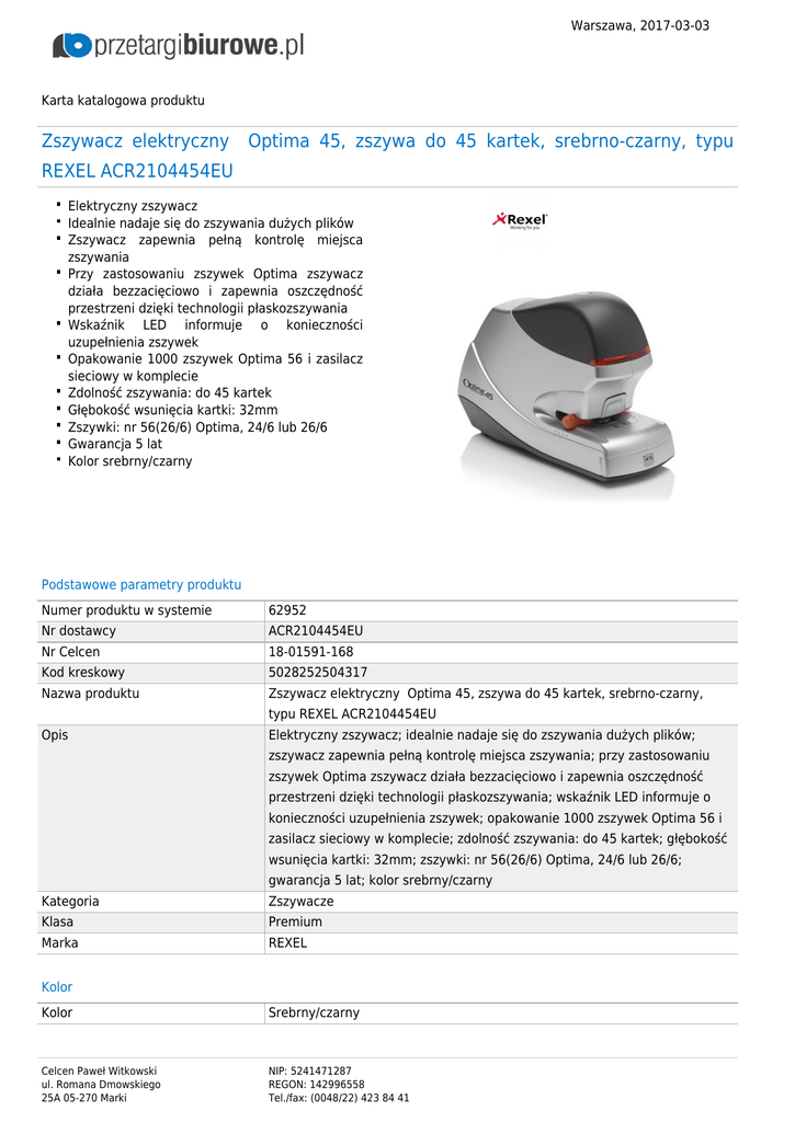 Warszawa, 2017-03-03 Karta katalogowa produktu Zszywacz elektryczny Optima 45, zszywa do 45 kartek, srebrno-czarny, typu REXEL ACR2104454EU Elektryczny zszywacz Idealnie nadaje się do zszywania dużych plików Zszywacz zapewnia pełną kontrolę miejsca zszywania Przy zastosowaniu zszywek Optima zszywacz działa bezzacięciowo i zapewnia oszczędność przestrzeni dzięki technologii płaskozszywania Wskaźnik LED informuje o konieczności uzupełnienia zszywek Opakowanie 1000 zszywek Optima 56 i zasilacz sieciowy w komplecie Zdolność zszywania: do 45 kartek Głębokość wsunięcia kartki: 32mm Zszywki: nr 56(26/6) Optima, 24/6 lub 26/6 Gwarancja 5 lat Kolor srebrny/czarny Podstawowe parametry produktu Numer produktu w systemie 62952 Nr dostawcy ACR2104454EU Nr Celcen 18-01591-168 Kod kreskowy 5028252504317 Nazwa produktu Zszywacz elektryczny Optima 45, zszywa do 45 kartek, srebrno-czarny, typu REXEL ACR2104454EU Opis Elektryczny zszywacz; idealnie nadaje się do zszywania dużych plików; zszywacz zapewnia pełną kontrolę miejsca zszywania; przy zastosowaniu zszywek Optima zszywacz działa bezzacięciowo i zapewnia oszczędność przestrzeni dzięki technologii płaskozszywania; wskaźnik LED informuje o konieczności uzupełnienia zszywek; opakowanie 1000 zszywek Optima 56 i zasilacz sieciowy w komplecie; zdolność zszywania: do 45 kartek; głębokość wsunięcia kartki: 32mm; zszywki: nr 56(26/6) Optima, 24/6 lub 26/6; gwarancja 5 lat; kolor srebrny/czarny Kategoria Zszywacze Klasa Premium Marka REXEL Kolor Kolor Srebrny/czarny Celcen Paweł Witkowski ul. Romana Dmowskiego 25A 05-270 Marki NIP: 5241471287 REGON: 142996558 Tel./fax: (0048/22) 423 84 41 Warszawa, 2017-03-03 Cecha Materiał Metal Produkt Zszywacz W ofercie od 2017-01 Typ Elektryczny Ilość kartek 45 Wymiary Gł. wsunięcia (mm) 32 Rozmiar No 56,24/6,26/6 Certyfikaty Ilość lat gwarancji 5 Nowy produkt w ofercie Nowość Hit Standard Wspólny słownik zamówień CPV 30197320-5 Zszywacze Jesteśmy przekonani, że z pomocą przetargibiurowe.pl usprawnicie Państwo własne procesy biznesowe związane ze żmudnym poszukiwaniem odpowiadających Państwu produktów oraz opracowaniem specyfikacjii zapytań ofertowych. Serdecznie zapraszamy do wspópracy Zespół, PrzetargiBiurowe.pl Celcen Paweł Witkowski ul. Romana Dmowskiego 25A 05-270 Marki NIP: 5241471287 REGON: 142996558 Tel./fax: (0048/22) 423 84 41