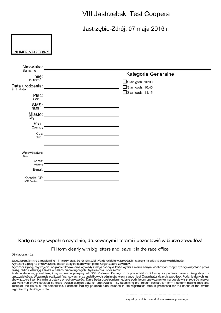VIII Jastrzębski Test Coopera Jastrzębie-Zdrój, 07 maja 2016 r. Nazwisko: Surname Imię: F. name Data urodzenia: Birth date Płeć: Kategorie Generalne Start godz. 10:00 Start godz. 10:45 Start godz. 11:15 Sex SMS: SMS Miasto: City Kraj: Country Klub: Club Województwo: State Adres: Address E-mail: Kontakt ICE: ICE Contact Kartę należy wypełnić czytelnie, drukowanymi literami i pozostawić w biurze zawodów! Fill form clearly with big letters and leave it in the race office! Oświadczam, że: zapoznałem/am się z regulaminem imprezy oraz, że jestem zdolny/a do udziału w zawodach i startuję na własną odpowiedzialność. Wyrażam zgodę na przetwarzanie moich danych osobowych przez Organizatora zawodów. Wyrażam zgodę, aby zdjęcia, nagrania filmowe oraz wywiady z moją osobą, a także wyniki z moimi danymi osobowymi mogły być wykorzystane przez prasę, radio i telewizję a także w celach marketingowych Organizatora i sponsorów. Podane dane są prawdziwe, i są mi znane przepisy art. 233 Kodeksu Karnego o odpowiedzialności karnej za podanie danych niezgodnych z rzeczywistością. W zakresie rozliczeń finansowych oraz podatkowych administratorem danych jest Organizator danych zawodów. Podanie danych jest obowiązkowe i wynika m.in. z ustawy o rachunkowości. Dane będą udostępniane jedynie podmiotom upoważnionym na podstawie przepisów prawa. Ma Pani/Pan prawo dostępu do treści swoich danych oraz ich poprawiania. By submitting the present registration form I confirm having read and accepted the Rules of the competition. I consent that my personal data included in the registration form is processed for the needs of the events organized by the Organizator. ........................................................................... czytelny podpis zawodnika/opiekuna prawnego VIII Jastrzębski Test Coopera Jastrzębie-Zdrój, 07 maja 2016 r. Nazwisko: Surname Imię: F. name Data urodzenia: Birth date Płeć: Kategorie Generalne Start godz. 10:00 Start godz. 10:45 Start godz. 11:15 Sex SMS: SMS Miasto: City Kraj: Country Klub: Club Województwo: State Adres: Address E-mail: Kontakt ICE: ICE Contact Kartę należy wypełnić czytelnie, drukowanymi literami i pozostawić w biurze zawodów! Fill form clearly with big letters and leave it in the race office! Oświadczam, że: zapoznałem/am się z regulaminem imprezy oraz, że jestem zdolny/a do udziału w zawodach i startuję na własną odpowiedzialność. Wyrażam zgodę na przetwarzanie moich danych osobowych przez Organizatora zawodów. Wyrażam zgodę, aby zdjęcia, nagrania filmowe oraz wywiady z moją osobą, a także wyniki z moimi danymi osobowymi mogły być wykorzystane przez prasę, radio i telewizję a także w celach marketingowych Organizatora i sponsorów. Podane dane są prawdziwe, i są mi znane przepisy art. 233 Kodeksu Karnego o odpowiedzialności karnej za podanie danych niezgodnych z rzeczywistością. W zakresie rozliczeń finansowych oraz podatkowych administratorem danych jest Organizator danych zawodów. Podanie danych jest obowiązkowe i wynika m.in. z ustawy o rachunkowości. Dane będą udostępniane jedynie podmiotom upoważnionym na podstawie przepisów prawa. Ma Pani/Pan prawo dostępu do treści swoich danych oraz ich poprawiania. By submitting the present registration form I confirm having read and accepted the Rules of the competition. I consent that my personal data included in the registration form is processed for the needs of the events organized by the Organizator. ........................................................................... czytelny podpis zawodnika/opiekuna prawnego