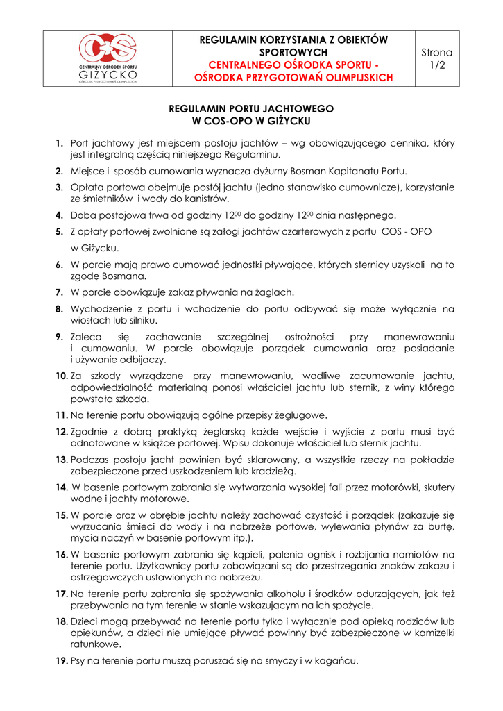 REGULAMIN KORZYSTANIA Z OBIEKTÓW SPORTOWYCH CENTRALNEGO OŚRODKA SPORTU OŚRODKA PRZYGOTOWAŃ OLIMPIJSKICH Strona 1/2 REGULAMIN PORTU JACHTOWEGO W COS-OPO W GIŻYCKU 1. Port jachtowy jest miejscem postoju jachtów – wg obowiązującego cennika, który jest integralną częścią niniejszego Regulaminu. 2. Miejsce i sposób cumowania wyznacza dyżurny Bosman Kapitanatu Portu. 3. Opłata portowa obejmuje postój jachtu (jedno stanowisko cumownicze), korzystanie ze śmietników i wody do kanistrów. 4. Doba postojowa trwa od godziny 1200 do godziny 1200 dnia następnego. 5. Z opłaty portowej zwolnione są załogi jachtów czarterowych z portu COS - OPO w Giżycku. 6. W porcie mają prawo cumować jednostki pływające, których sternicy uzyskali na to zgodę Bosmana. 7. W porcie obowiązuje zakaz pływania na żaglach. 8. Wychodzenie z portu i wchodzenie do portu odbywać się może wyłącznie na wiosłach lub silniku. 9. Zaleca się zachowanie szczególnej ostrożności przy manewrowaniu i cumowaniu. W porcie obowiązuje porządek cumowania oraz posiadanie i używanie odbijaczy. 10. Za szkody wyrządzone przy manewrowaniu, wadliwe zacumowanie jachtu, odpowiedzialność materialną ponosi właściciel jachtu lub sternik, z winy którego powstała szkoda. 11. Na terenie portu obowiązują ogólne przepisy żeglugowe. 12. Zgodnie z dobrą praktyką żeglarską każde wejście i wyjście z portu musi być odnotowane w książce portowej. Wpisu dokonuje właściciel lub sternik jachtu. 13. Podczas postoju jacht powinien być sklarowany, a wszystkie rzeczy na pokładzie zabezpieczone przed uszkodzeniem lub kradzieżą. 14. W basenie portowym zabrania się wytwarzania wysokiej fali przez motorówki, skutery wodne i jachty motorowe. 15. W porcie oraz w obrębie jachtu należy zachować czystość i porządek (zakazuje się wyrzucania śmieci do wody i na nabrzeże portowe, wylewania płynów za burtę, mycia naczyń w basenie portowym itp.). 16. W basenie portowym zabrania się kąpieli, palenia ognisk i rozbijania namiotów na terenie portu. Użytkownicy portu zobowiązani są do przestrzegania znaków zakazu i ostrzegawczych ustawionych na nabrzeżu. 17. Na terenie portu zabrania się spożywania alkoholu i środków odurzających, jak też przebywania na tym terenie w stanie wskazującym na ich spożycie. 18. Dzieci mogą przebywać na terenie portu tylko i wyłącznie pod opieką rodziców lub opiekunów, a dzieci nie umiejące pływać powinny być zabezpieczone w kamizelki ratunkowe. 19. Psy na terenie portu muszą poruszać się na smyczy i w kagańcu. REGULAMIN KORZYSTANIA Z OBIEKTÓW SPORTOWYCH CENTRALNEGO OŚRODKA SPORTU OŚRODKA PRZYGOTOWAŃ OLIMPIJSKICH Strona 2/2 20. W porcie i otaczającym go terenie obowiązuje cisza nocna w godzinach od 2200 do 600. 21. Wchodzenie i wychodzenie z portu dozwolone jest tylko w porze dziennej tj. od świtu do zmroku. 22. Wjazd i postój pojazdów samochodowych na terenie portu jest zabroniony. Za zezwoleniem Ochrony dopuszcza się wjazd pojazdu na teren portu i postój w wyznaczonym miejscu na czas rozładunku, nie dłużej jednak niż 30 minut. W przypadku przekroczenia tego limitu czasowego Ochrona uprawniona jest do usunięcie pojazdu na parking COS - OPO w Giżycku na koszt właściciela pojazdu. 23. Właściciele/armatorzy zobowiązani są do oznaczenia swoich jednostek i posiadania aktualnych dokumentów rejestracyjnych, zgodnie z obowiązującymi przepisami. 24. Właściciel/armator jachtu zobowiązany jest do prawidłowego zabezpieczenia jachtu przed kradzieżą i włamaniem. 25. Użytkowników portu obowiązują ogólne przepisy w zakresie bezpieczeństwa przeciwpożarowego. 26. COS – OPO nie ponosi jakiejkolwiek odpowiedzialności za skutki ewentualnej kradzieży jachtu/motorówki lub ich elementów wyposażenia. 27. Do korzystania z jachtów i łodzi należących do COS - OPO w Giżycku uprawnione są spełniające wymagania określone obowiązującymi przepisami dotyczącymi uprawiania żeglugi śródlądowej. 28. Wypożyczenie sprzętu niepełnoletnim może mieć miejsce wyłącznie za pisemną zgodą rodziców lub opiekunów prawnych z zachowaniem pkt. 27 niniejszego Regulaminu. 29. Użytkownicy portu zobowiązani są do stosowania się do niniejszego Regulaminu i poleceń Bosmana w zakresie ustaleń przewidzianych niniejszym regulaminem. 30. Nieprzestrzeganie przepisów niniejszego Regulaminu może spowodować zakaz korzystania z portu. DYREKCJA COS-OPO W GIŻYCKU