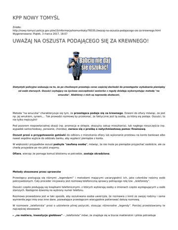 KPP NOWY TOMYŚL Źródło: http://nowy-tomysl.policja.gov.pl/w15/informacje/komunikaty/78335,Uwazaj-na-oszusta-podajacego-sie-za-krewnego.html Wygenerowano: Piątek, 3 marca 2017, 18:07 UWAŻAJ NA OSZUSTA PODAJĄCEGO SIĘ ZA KREWNEGO! Statystyki policyjne wskazują na to, że po chwilowym przestoju coraz częściej dochodzi do przestępstw wyłudzania pieniędzy od osób starszych. Oszuści czyhający na życiowe oszczędności seniorów z reguły działają wykorzystując metodę "na wnuczka". Niektórzy z nich są naprawdę skuteczni. Metoda "na wnuczka" charakteryzuje się tym, że przestępca podaje się za krewnego. Dzwoni do ofiary mówiąc, że jest np. jej wnukiem, synem,... Tak prowadzi rozmowę by przekonać, że faktycznie jest tą osobą, za którą się podaje. Oszuści, to nie tylko mężczyźni! Pod pozorem niepowtarzalnej okazji (np. promocja w sklepie, okazyjny zakup mieszkania), lub nagłego nieszczęścia (np. wypadek samochodowy, porwanie, choroba), zwraca się z prośbą o natychmiastową pomoc finansową. Oszust prosi o przygotowanie gotówki do odbioru z mieszkania ofiary lub wykonanie przelewu na konto bankowe albo nawet wspólne wyjście do oddziału banku, aby wypłacić pieniądze z konta. W większości przypadków oszust podsyła "zaufaną osobę", mówiąc, że nie może po pieniądze przyjechać osobiście, ale za chwilę przyjedzie po nie jakiś znajomy. Ofiara, wierząc że pomaga komuś bliskiemu w potrzebie, zostaje okradziona. Metody stosowane przez sprawców Przestępcy posługują się różnymi „legendami” i metodami mającymi uwiarygodnić ich, jako członków rodziny osób pokrzywdzonych. Cały proceder inicjowany jest rozmową telefoniczną sprawcy pełniącego rolę tzw. „telefonisty”. Oszuści często posługują się książkami telefonicznymi, z których wybierają osoby o imionach często występujących u osób starszych. Następnie dzwonią na wybrany numer telefonu. Rozmowa prowadzona jest w taki sposób, aby oszukiwana osoba uwierzyła, że rozmawia z kimś ze swojej rodziny i sama wymieniła jego imię oraz inne dane, pozwalające przestępcom wiarygodnie pokierować dalszą rozmową. W rozmowie „telefonista” prosi o udzielenie pilnej pożyczki, stosując różnorodne „legendy”. Poniżej przedstawiamy te najczęściej stosowane: ● „na maklera, inwestycje giełdowe” – „telefonista” mówi, że znajduje się w biurze maklerskim i pilnie potrzebuje pieniędzy na inwestycję giełdową, bo inaczej straci dużą sumę pieniędzy. Po odbiór gotówki wysyła kogoś podającego się za „maklera giełdowego”, ● „na wypadek” – „telefonista” informuje, że spowodował wypadek samochodowy i pilnie potrzebuje pieniędzy na zapłacenie ofierze wypadku, aby uniknąć wezwania policji i rozprawy sądowej, ● „na porwanie” – rolę „telefonisty” pełni kobieta podająca się za córkę lub wnuczkę informując, że została porwana i musi zapłacić okup, ● „na zwrot długu znajomemu” – „telefonista” informuje, że zaciągnął u znajomego pożyczkę i w związku z nieszczęśliwym zdarzeniem tamtej osoby musi szybko zwrócić dług. Następnie po odbiór pieniędzy od oszukiwanej osoby przychodzi rzekomy znajomy, który potwierdza swoją ciężką sytuację finansową. ● „na zakup nieruchomości lub ruchomości” – „telefonista” informuje, że jest w trakcie dokonywania bardzo korzystnej transakcji np. u notariusza i pilnie potrzebuje brakującej kwoty na jej sfinalizowanie. Zdarza się, że „telefonista” nie wskazuje żadnego celu, na który potrzebuje pieniędzy, lecz niemal zawsze prosi o dyskrecję wobec innych członków rodziny. Zapewnia także o bardzo szybkim i osobistym zwrocie gotówki. Często oprócz gotówki (waluta polska i zagraniczna) sprawcy nakłaniają osobę oszukiwaną do wydania im również wartościowej biżuterii. Kiedy oszustowi udaje się nakłonić osobę pokrzywdzoną do „udzielenia pożyczki” informuje, że nie będzie mógł osobiście odebrać pieniędzy i podaje sposób przekazania gotówki lub kosztowności innej osobie. Przestępcom chodzi o to, aby skłonić ofiarę do przekazania pieniędzy nieznajomemu, mimo że będzie widziała oszusta po raz pierwszy w życiu. Z danych Policji wynika, że osoba oszukiwana najczęściej przekazuje pieniądze obcej osobie, która pełni rolę tzw. „odbieraka”. Sprawca ten podaje się za dobrego znajomego rzekomego „wnuczka” lub inną zaufaną osobę, np. maklera giełdowego, pracownika banku lub sklepu. „Odbierak” po przybyciu do oszukiwanej osoby, przekazuje telefon komórkowy, umożliwiając w ten sposób ponowną rozmowę z rzekomym „wnuczkiem”, co ma dodatkowo uwiarygodnić konieczność przekazania pieniędzy. Pamiętaj nie dzwoń z telefonu „odbieraka”. To kolejny sygnał, że jest coś nie w porządku i należy natychmiast powiadomić Policję. Gotówka i kosztowności przekazywane są w miejscu zamieszkania oszukiwanej osoby albo na ulicy, bądź w placówkach bankowych. Zdarza się, że sprawcy przyjeżdżają po swoje ofiary taksówkami, z którymi razem jadą np. do banku w celu dokonania przelewu i pobrania gotówki. „Pożyczki”, na prośbę „telefonisty”, mają również formę przelewów bankowych na podane konta, przelewów błyskawicznych (usługa Poczty Polskiej), jak również przelewów za pośrednictwem instytucji przekazujących pieniądze na odległość (np. Western Union). Oszukiwana osoba dokonuje przelewu na rachunki bankowe zakładane na tzw. „słupy”, czyli osoby, które za drobną opłatą zakładają rachunki bankowe na swoje personalia, po czym udostępniają je oszustom. Udostępniają im także karty bankomatowe z kodami PIN, umożliwiając łatwe podjęcie gotówki. Pieniądze z takich rachunków wypłacane są natychmiast po zrealizowaniu przelewów przez oszukiwaną osobę. Na tzw. „słupy” z reguły są wybierane osoby bezdo