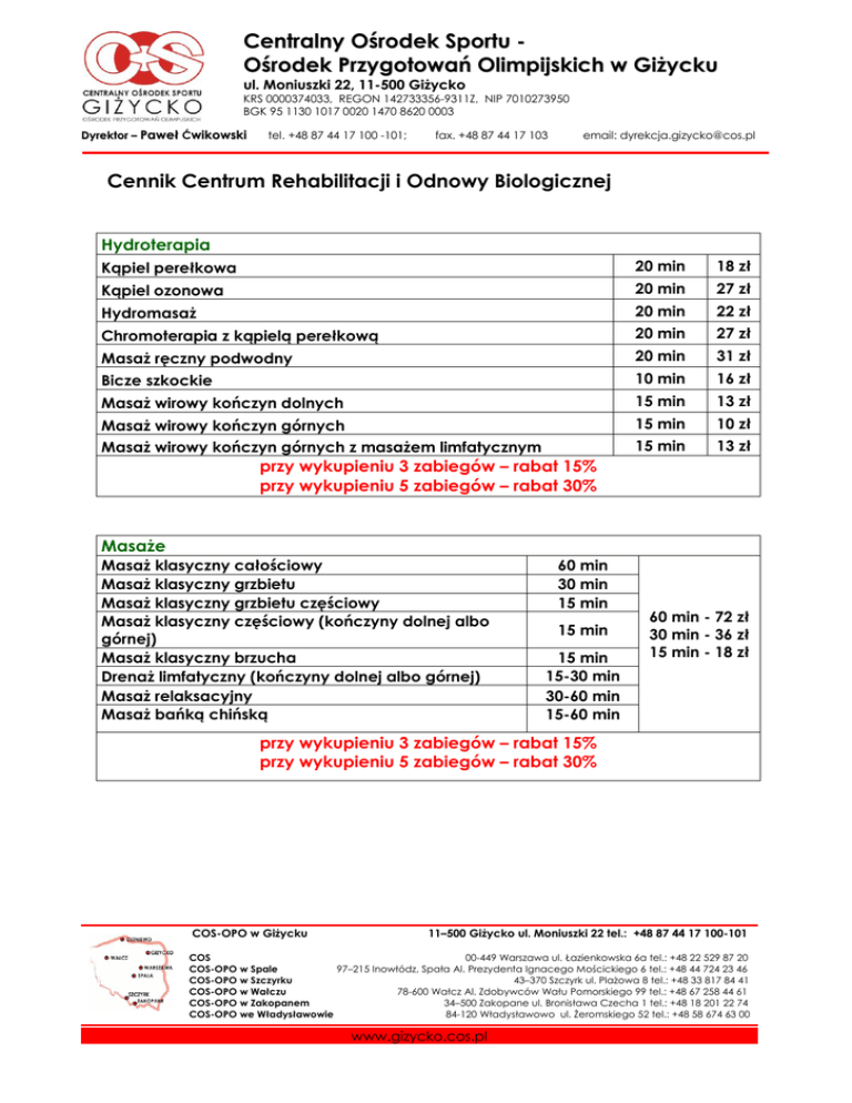 Centralny Ośrodek Sportu Ośrodek Przygotowań Olimpijskich w Giżycku ul. Moniuszki 22, 11-500 Giżycko KRS 0000374033, REGON 142733356-9311Z, NIP 7010273950 BGK 95 1130 1017 0020 1470 8620 0003 Dyrektor – Paweł Ćwikowski tel. +48 87 44 17 100 -101; fax. +48 87 44 17 103 email: [email protected] Cennik Centrum Rehabilitacji i Odnowy Biologicznej Hydroterapia Kąpiel perełkowa 20 min 18 zł Kąpiel ozonowa 20 min 27 zł Hydromasaż 20 min 22 zł Chromoterapia z kąpielą perełkową 20 min 27 zł Masaż ręczny podwodny 20 min 31 zł Bicze szkockie 10 min 16 zł Masaż wirowy kończyn dolnych 15 min 13 zł Masaż wirowy kończyn górnych Masaż wirowy kończyn górnych z masażem limfatycznym 15 min 10 zł 15 min 13 zł przy wykupieniu 3 zabiegów – rabat 15% przy wykupieniu 5 zabiegów – rabat 30% Masaże Masaż klasyczny całościowy Masaż klasyczny grzbietu Masaż klasyczny grzbietu częściowy Masaż klasyczny częściowy (kończyny dolnej albo górnej) Masaż klasyczny brzucha Drenaż limfatyczny (kończyny dolnej albo górnej) Masaż relaksacyjny Masaż bańką chińską 60 min 30 min 15 min 15 min 15 min 15-30 min 30-60 min 15-60 min 60 min - 72 zł 30 min - 36 zł 15 min - 18 zł przy wykupieniu 3 zabiegów – rabat 15% przy wykupieniu 5 zabiegów – rabat 30% COS-OPO w Giżycku 11–500 Giżycko ul. Moniuszki 22 tel.: +48 87 44 17 100-101 COS 00-449 Warszawa ul. Łazienkowska 6a tel.: +48 22 529 87 20 COS-OPO w Spale 97–215 Inowłódz, Spała Al. Prezydenta Ignacego Mościckiego 6 tel.: +48 44 724 23 46 COS-OPO w Szczyrku 43–370 Szczyrk ul. Plażowa 8 tel.: +48 33 817 84 41 COS-OPO w Wałczu 78-600 Wałcz Al. Zdobywców Wału Pomorskiego 99 tel.: +48 67 258 44 61 COS-OPO w Zakopanem 34–500 Zakopane ul. Bronisława Czecha 1 tel.: +48 18 201 22 74 COS-OPO we Władysławowie 84-120 Władysławowo ul. Żeromskiego 52 tel.: +48 58 674 63 00 www.gizycko.cos.pl Centralny Ośrodek Sportu Ośrodek Przygotowań Olimpijskich w Giżycku ul. Moniuszki 22, 11-500 Giżycko KRS 0000374033, REGON 142733356-9311Z, NIP 7010273950 BGK 95 1130 1017 0020 1470 8620 0003 Dyrektor – Paweł Ćwikowski tel. +48 87 44 17 100-101; fax. +48 87 44 17 103 email: [email protected] Fizykoterapia Galwanizacja Jonoforeza Prądy TENS Prądy Diadynamiczne Prądy Interferencyjne Elektrostymulacja Prądy Kotza Prądy Träberta Ultradźwięki Fonoforeza (własny lek) Laseroterapia punktowa Laseroterapia skaner Sollux Krioterapia miejscowa Terapia skojarzona 10 -15 min 10 -15 min 10 -15 min 10 -15 min 10 -15 min 10 -15 min 10 -15 min 10 -15 min 5 -10 min 5 -10 min 5 -10 min 5 -10 min 10 -15 min 3min/5min/7min 10 min 8 zł 8 zł 8 zł 8 zł 8 zł 8 zł 8 zł 8 zł 8 zł 8 zł 8 zł 8 zł 8 zł 8zł/10zł/12zł 8 zł przy wykupieniu serii 10 zabiegów – rabat 30% (ze skierowaniem od lekarza) Sauna Sauna mała / na podczerwień/ 6 osób Sauna duża/ 10 osób 60 min 60 min 47 zł 74 zł Zajęcia ruchowe Ćwiczenia na przyrządach (UGUL) 30 min 15 zł Ćwiczenia z terapeutą 30 min 25 zł Ćwiczenia grupowe "STRETCHING" 60 min 8 zł/ osoba STRETCHING + PILATES KARNET (ważny 60 dni) 9 wejść 64 zł/ osoba Pilates 60 min 8 zł/ osoba Ułożenie planu ćwiczeń do samodzielnego wykonania w domu COS-OPO w Giżycku 25 zł 11–500 Giżycko ul. Moniuszki 22 tel.: +48 87 44 17 100-101 COS 00-449 Warszawa ul. Łazienkowska 6a tel.: +48 22 529 87 20 COS-OPO w Spale 97–215 Inowłódz, Spała Al. Prezydenta Ignacego Mościckiego 6 tel.: +48 44 724 23 46 COS-OPO w Szczyrku 43–370 Szczyrk ul. Plażowa 8 tel.: +48 33 817 84 41 COS-OPO w Wałczu 78-600 Wałcz Al. Zdobywców Wału Pomorskiego 99 tel.: +48 67 258 44 61 COS-OPO w Zakopanem 34–500 Zakopane ul. Bronisława Czecha 1 tel.: +48 18 201 22 74 COS-OPO we Władysławowie 84-120 Władysławowo ul. Żeromskiego 52 tel.: +48 58 674 63 00 www.gizycko.cos.pl 2 Centralny Ośrodek Sportu Ośrodek Przygotowań Olimpijskich w Giżycku ul. Moniuszki 22, 11-500 Giżycko KRS 0000374033, REGON 142733356-9311Z, NIP 7010273950 BGK 95 1130 1017 0020 1470 8620 0003 Dyrektor – Paweł Ćwikowski tel. +48 87 44 17 100-101; fax. +48 87 44 17 103 email: [email protected] Taping Kinesiotaping Taping drenażowy / cała kończyna górna Taping drenażowy / cała kończyna górna - dzieci Taping drenażowy / 2 całe kończyny górne Taping drenażowy / 2 całe kończyny górne - dzieci Taping drenażowy / dłoń Taping drenażowy / dłoń - dzieci Taping drenażowy / 2 dłonie Taping drenażowy / 2 dłonie - dzieci Taping drenażowy / dłoń i przedramię Taping drenażowy / dłoń i przedramię - dzieci Taping drenażowy / 2 dłonie i 2 przedramiona Taping drenażowy / 2 dłonie i 2 przedramiona - dzieci Taping drenażowy / ramię Taping drenażowy / ramię - dzieci Taping drenażowy / 2 ramiona Taping drenażowy / 2 ramiona - dzieci Taping drenażowy / ramię i przedramię Taping drenażowy / ramię i przedramię - dzieci Taping drenażowy / 2 ramiona i przedramiona Taping drenażowy / 2 ramiona i przedramiona - dzieci Taping drenażowy / cała kończyna dolna Taping drenażowy / cała kończyna dolna - dzieci Taping drenażowy / 2 całe kończyny dolne Taping drenażowy / 2 całe kończyny dolne - dzieci Taping drenażowy / cała kończyna dolna Taping drenażowy / cała kończyna dolna - dzieci Taping drenażowy / 2 całe kończyny dolne Taping drenażowy / 2 całe kończyny dolne - dzieci Taping drenażowy / stopa Taping drenażowy / stopa - dzieci COS-OPO w Giżycku 1 aplikacja 1 aplikacja 25 zł 40 zł 1 aplikacja 40 zł 1 aplikacja 50 zł 1 aplikacja 50 zł 1 aplikacja 1 aplikacja 1 aplikacja 1 aplikacja 1 aplikacja 20 zł 20 zł 30 zł 30 zł 30 zł 1 aplikacja 30 zł 1 aplikacja 1 aplikacja 1 aplikacja 1 aplikacja 1 aplikacja 1 aplikacja 1 aplikacja 40 zł 40 zł 20 zł 20 zł 30 zł 30 zł 30 zł 1 aplikacja 30 zł 1 aplikacja 40 zł 1 aplikacja 40 zł 1 aplikacja 40 zł 1 aplikacja 40 zł 1 aplikacja 1 aplikacja 1 aplikacja 50 zł 50 zł 40 zł 1 aplikacja 40 zł 1 