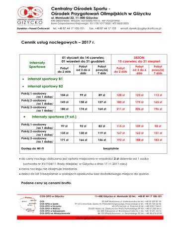 Centralny Ośrodek Sportu Ośrodek Przygotowań Olimpijskich w Giżycku ul. Moniuszki 22, 11-500 Giżycko KRS 0000374033, REGON 142733356-9311Z, NIP 7010273950 Bank Gospodarstwa Krajowego: 95 1130 1017 0020 1470 8620 0003 Dyrektor – Paweł Ćwikowski tel. +48 87 44 17 100-101; fax. +48 87 44 17 103 email: [email protected] Cennik usług noclegowych – 2017 r. Internaty Sportowe 01 styczeń do 14 czerwiec 01 wrzesień do 31 grudzień Pobyt od 3 do 6 dób Pobyt powyżej 7 dób Pobyt do 2 dób Pobyt od 3 do 6 dób Pobyt powyżej 7 dób 104 zł 99 zł 89 zł 128 zł 123 zł 113 zł 143 zł 138 zł 127 zł 180 zł 175 zł 165 zł 180 zł 174 zł 164 zł 211 zł 206 zł 196 zł 97 zł 92 zł 82 zł 115 zł 109 zł 98 zł 135 zł 130 zł 119 zł 167 zł 162 zł 151 zł 171 zł 166 zł 156 zł 193 zł 188 zł 183 zł Pobyt do 2 dób internat sportowy B1 internat sportowy B2 Pokój 1-osobowy /za 1 dobę/ Pokój 2-osobowy /za 1 dobę/ Pokój 3-osobowy /za 1 dobę/ SEZON 15 czerwiec do 31 sierpień internaty sportowe (9 szt.) Pokój 1-osobowy /za 1 dobę/ Pokój 2-osobowy /za 1 dobę/ Pokój 3-osobowy /za 1 dobę/ Dostęp do Wi-Fi bezpłatnie do ceny noclegu doliczana jest opłata miejscowa w wysokości 2 zł dziennie od 1 osoby (uchwała nr XV/104/11 Rady Miejskiej w Giżycku z dnia 17.11.2011 roku) cena noclegu nie obejmuje śniadania dzieci do lat 3 bezpłatnie w pokojach opiekunów bez dodatkowego miejsca do spania Podane ceny są cenami brutto. COS-OPO w Giżycku COS COS-OPO w Spale COS-OPO w Szczyrku COS-OPO w Wałczu COS-OPO w Zakopanem COS-OPO we Władysławowie 11–500 Giżycko ul. Moniuszki 22 tel.: +48 87 44 17 100-101 00-449 Warszawa ul. Łazienkowska 6a tel.: +48 22 529 87 20 97–215 Inowłódz, Spała Al. Prezydenta Ignacego Mościckiego 6 tel.: +48 44 724 23 46 43–370 Szczyrk ul. Plażowa 8 tel.: +48 33 817 84 41 78-600 Wałcz Al. Zdobywców Wału Pomorskiego 99 tel.: +48 67 258 44 61 34–500 Zakopane ul. Bronisława Czecha 1 tel.: +48 18 201 22 74 84-120 Władysławowo ul. Żeromskiego 52 tel.: +48 58 674 63 00 www.gizycko.cos.pl