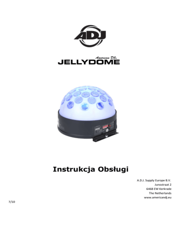 Instrukcja Obsługi A.D.J. Supply Europe B.V. Junostraat 2 6468 EW Kerkrade The Netherlands www.americandj.eu 7/10 Spis treści WSTĘP ..................................................................................................................................................................................... 3 WSKAZÓWKI OGÓLNE ............................................................................................................................................................ 3 CHARAKTERYSTYKA ................................................................................................................................................................. 3 UWAGI DOTYCZĄCE OBSŁUGI ................................................................................................................................................. 3 ŚRODKI BEZPIECZEŃSTWA ...................................................................................................................................................... 4 USTAWIENIA ........................................................................................................................................................................... 5 DZIAŁANIE ............................................................................................................................................................................... 7 UC3 CONTROL ......................................................................................................................................................................... 8 CECHY DMX ............................................................................................................................................................................. 8 WYMIANA BEZPIECZNIKA ....................................................................................................................................................... 9 CZYSZCZENIE ........................................................................................................................................................................... 9 USUWANIE USTEREK............................................................................................................................................................... 9 SPECYFIKACJA ....................................................................................................................................................................... 10 ROHS oraz WEE ..................................................................................................................................................................... 11 A.D.J. Supply Europe B.V. – www.americandj.eu – Jellydome Instrukcja Obsługi Str. 2 WSTĘP Wypakowanie: Dziękujemy za zakup urządzenia świetlnego Jellydome firmy American DJ®. KaŜdy egzemplarz Jellydome został gruntownie przetestowany, co jest gwarancją jego prawidłowego funkcjonowania. Przed rozpakowaniem naleŜy sprawdzić czy opakowanie nie zostało uszkodzone w czasie transportu. W razie stwierdzenia uszkodzenia opakowania, dokładnie sprawdź, czy nie nastąpiło uszkodzenie sprzętu oraz upewnij się, Ŝe wszystkie części konieczne do obsługi urządzenia przybyły w stanie nienaruszonym. W razie stwierdzenia usterek lub braku części, naleŜy skontaktować się z bezpłatnym biurem obsługi klienta w celu uzyskania dalszych instrukcji. Prosimy o taki kontakt przed podjęciem decyzji o zwrocie urządzenia do sprzedawcy. Wstęp: Jellydome jest inteligentnym diodowym urządzeniem świetlnym kompatybilnym z systemem DMX. Urządzenie posiada trzy tryby operacyjne: tryb reakcji na dźwięk (Sound Active Mode), tryb pokazu (Show Mode) oraz tryb DMX. MoŜe ono pracować indywidualnie (Stand Alone) lub w konfiguracji Master/Slave. W celu uzyskania lepszych efektów poprzez poprawienie widoczności projektowanej wiązki światła, naleŜy uŜyć maszyny mgielnej lub dymu do efektów specjalnych. Obsługa klienta: W razie jakichkolwiek problemów, prosimy o kontakt z zaufanym punktem sprzedaŜy American Audio. Istnieje równieŜ moŜliwość bezpośredniego kontaktu z nami. MoŜna to zrobić poprzez naszą stronę internetową www.americandj.eu oraz pisząc na adres: [email protected]. OstrzeŜenie! Aby zapobiec lub zmniejszyć ryzyko poraŜenia prądem lub poŜaru, nie włączaj urządzenia w warunkach deszczowych lub przy podwyŜszonej wilgotności powietrza. OstrzeŜenie! Urządzenie moŜe powaŜnie uszkodzić wzrok. Nie naleŜy patrzeć bezpośrednio na źródło światła. WSKAZÓWKI OGÓLNE Aby w pełni wykorzystać moŜliwości urządzenia, prosimy o przeczytanie instrukcji obsługi i zapoznanie się z podstawowymi funkcjami urządzenia. Instrukcja zawiera waŜne informacje dotyczące bezpieczeństwa obsługi oraz sposobu konserwacji urządzenia. Prosimy o zachowanie instrukcji obsługi w celu ponownego uŜycia. CHARAKTERYSTYKA • • • • • • Protokół DMX-512 3 Kanały DMX 3 Tryby Operacyjne – Reakcja na Dźwięk (Sound Active), Tryb Pokazu (Show), Sterowanie Sygnałem DMX (DMX Control) Praca Indywidualna (Stand Alone) lub Konfiguracja Master/Slave Wbudowany Mikrofon Kompatybilne z konsolą UC3 (sprzedawana osobno) UWAGI DOTYCZĄCE OBSŁUGI Uwaga! Urządzenie nie zawiera Ŝadnych elementów przeznaczonych do serwisowania przez uŜytkownika. Gwarancja na urządzenie traci waŜność, jeśli uŜytkownik zdecyduje się na samowolną naprawę którejkolwiek części. JeŜeli jakaś część wymaga naprawy to naleŜy się skontaktować z American DJ®. Firma American DJ® nie ponosi Ŝadnej odpowiedzialności za usterki powstałe w wyniku nie zapoznania się z treścią niniejszej instrukcji lub z powodu nieautoryzowanej modyfikacji sprzętu. A.D.J. Supply Europe B.V. – www.americandj.eu – Jellydome Instrukcja Obsługi Str. 3 ŚRODKI BEZPIECZEŃSTWA Dla własnego bezpieczeństwa, przed rozpoczęciem instalacji i uruchomieniem urzą