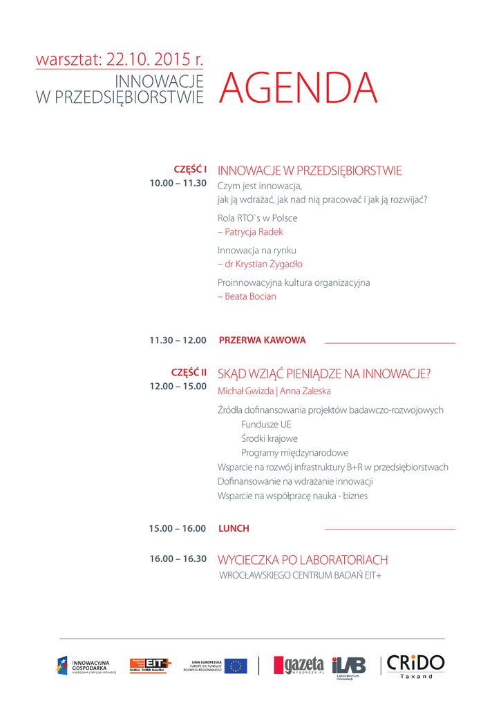 CZĘŚĆ I 10.00 – 11.30 INNOWACJE W PRZEDSIĘBIORSTWIE Czym jest innowacja, jak ją wdrażać, jak nad nią pracować i jak ją rozwijać? Rola RTO`s w Polsce – Patrycja Radek Innowacja na rynku – dr Krystian Żygadło Proinnowacyjna kultura organizacyjna – Beata Bocian 11.30 – 12.00 PRZERWA KAWOWA CZĘŚĆ II 12.00 – 15.00 SKĄD WZIĄĆ PIENIĄDZE NA INNOWACJE? Michał Gwizda | Anna Zaleska Źródła dofinansowania projektów badawczo-rozwojowych Fundusze UE Środki krajowe Programy międzynarodowe Wsparcie na rozwój infrastruktury B+R w przedsiębiorstwach Dofinansowanie na wdrażanie innowacji Wsparcie na współpracę nauka - biznes 15.00 – 16.00 LUNCH 16.00 – 16.30 WYCIECZKA PO LABORATORIACH WROCŁAWSKIEGO CENTRUM BADAŃ EIT+ PROWADZĄCY PATRYCJA RADEK Dyrektor Departamentu Rozwoju Biznesu Wrocławskiego Centrum Badań EIT+ Od czerwca 2011 r. związana z EIT+, gdzie odpowiada za strategiczny rozwój biznesowy firmy, budowanie polityki sprzedaży usług, kreowanie polityki marketingowej i promocyjnej spółki. Absolwentka Wydziału Chemicznego Politechniki Wrocławskiej (specjalność: Biotechnologia) oraz Wydziału Informatyki i Zarządzania Politechniki Wrocławskiej (specjalność: Zarządzanie i Marketing). Certyfikowany menedżer projektów zgodnie ze standardem International Project Management Association. Certyfikowany trener biznesu. Absolwentka Programu TOP500 Innovators na Uniwersytecie Kalifornijskim w Berkeley organizowanego przez Ministerstwo Nauki i Szkolnictwa Wyższego. BEATA BOCIAN Specjalista ds. zarządzania zasobami ludzkimi, trener i certyfikowany coach ICF, mgr filologii hiszpańskiej. Ukończyła polsko–austriacką szkołę dla trenerów WIFI Osterreich w Wiedniu oraz francuską Szkołę Dystrybucji ECAL (Ecole de la Distribution)we Francji. Od kilkunastu lat w biznesie, zajmowała się przygotowywaniem programów rozwojowych, doskonaleniem kompetencji pracowników różnych szczebli (zwłaszcza kadry menedżerskiej) oraz tworzeniem i wdrażaniem efektywnych rozwiązań i narzędzi w zakresie zarządzania zasobami ludzkimi. Ostatnio pracowała jako HR Biznes Partner w Grupie Netia. Uczennica Johna Scherera i Amy Barnes – autorytetów w zakresie tworzenia efektywnych zespołów w organizacji. We Wrocławskim Centrum Badań EIT+ Sp. z o.o. dołączyła do Działu HR jako starszy specjalista ds. systemów HR. PROWADZĄCY Dr KRYSTIAN ŻYGADŁO Specjalista ds. Ewaluacji Projektów Badawczych w Departamencie Nanotechnologii WCB EIT+, gdzie odpowiada za zagadnienia związane z własnością przemysłową: typowanie rozwiązań do ochrony w procedurze krajowej oraz międzynarodowej, badania stanu techniki, ocenę zdolności patentowej oraz czystości patentowej. Ponadto jest zaangażowany w działania edukacyjne pracowników z zakresu własności przemysłowej i zarządzaniem własnością intelektualną. W ramach prowadzonych w WCB EIT+ zajmuje się ekspercką oceną projektów badawczych, koordynacją współpracy z grupami badawczymi oraz wyszukiwaniem i inicjowaniem nowych kierunków badań, posiadających potencjał komercyjny, na podstawie synergii pomiędzy różnymi obszarami, jak chemia, fizyka, inżynieria materiałowa. Absolwent Wydziału Chemii Uniwersytetu Wrocławskiego (specjalność: chemia fizyczna i teoretyczna). Ukończył szkolenia związane za oceną potencjału komercyjnego prowadzone przez Europejski Urząd Patentowy oraz dotyczące wyceny własności intelektualnej. PRELEGENCI MICHAŁ GWIZDA | Partner, Crido Taxand Michał posiada szerokie doświadczenie w zakresie negocjacji pakietów pomocy publicznej dla przedsiębiorców, a także ubiegania się o środki finansowe na realizację nowych inwestycji, działań na rzecz B+R oraz inwestycji związanych z ochroną środowiska. Pracował przy pozyskiwaniu finansowania największych bezpośrednich inwestycji zagranicznych w Polsce. Był także zaangażowany w pierwszy w Europie komercyjny projekt rewitalizacyjny, który uzyskał dofinansowanie w ramach inicjatywy JESSICA. Michał zajmuje się doradztwem związanym z pomocą publiczną od 2002 roku. Praktyczne doświadczenie zdobywał w Ministerstwie Finansów oraz w Ernst & Young. Obecnie pełni funkcję partnera odpowiedzialnego za Dział Doradztwa Europejskiego (EAST) w Crido Taxand (działającym do marca 2013r. pod nazwą Accreo Taxand). Prowadzony przez niego zespół został dwukrotnie (w 2009 i 2010) uznany za najskuteczniejszy w Polsce w pozyskiwaniu dotacji unijnych przez miesięcznik FORBES i pozyskał dla przedsiębiorców ponad 3,8 mld zł pomocy publicznej. Michał jest absolwentem SGH na kierunku Finanse i Bankowość, ukończył również Międzynarodowe Stosunki Gospodarcze i Polityczne. Jest stypendystą Uniwersytetu Johana Gutenberga w Moguncji. Michał jest autorem licznych publikacji i książek z zakresu pomocy publicznej, dla m.in.: The Economist, HBR i wydawnictwa C.H. Beck. PRELEGENCI ANNA ZALESKA | Manager, Crido Taxand Specjalizuje się w pozyskiwaniu pomocy publicznej dla przedsiębiorstw na realizację innowacyjnych inwestycji, projektów badawczo-rozwojowych, projektów związanych z tworzeniem centrów IT, centrów B+R, projektów prośrodowiskowych, a także w pozyskiwaniu pomocy w ramach Specjalnych Stref Ekonomicznych. Ponadto posiada szerokie doświadczenie w rozliczaniu projektów współfinansowanych ze środków publicznych. Doradzała wielu polskim i zagranicznym przedsiębiorcom w procesie pozyskiwania i wykorzystywania przyznanego dofinansowania publicznego, w tym przedsiębiorstwom z sektora energetycznego, IT, R&D, medycznego. W Zespole Doradztwa Europejskiego w Crido Taxand od sierpnia 2007 r. Absolwentka Wydziału Prawa i Administracji Uniwersytetu Łódzkiego na kierunku Administracja oraz Podyplomowego Studium Zarządzania Finansami Przedsiębiorstw Szkoły Głównej Handlowej. Posiada certyfikat zarządzania projektami PRINCE2. Jest autorką artykułów o tematyce związanej z pro