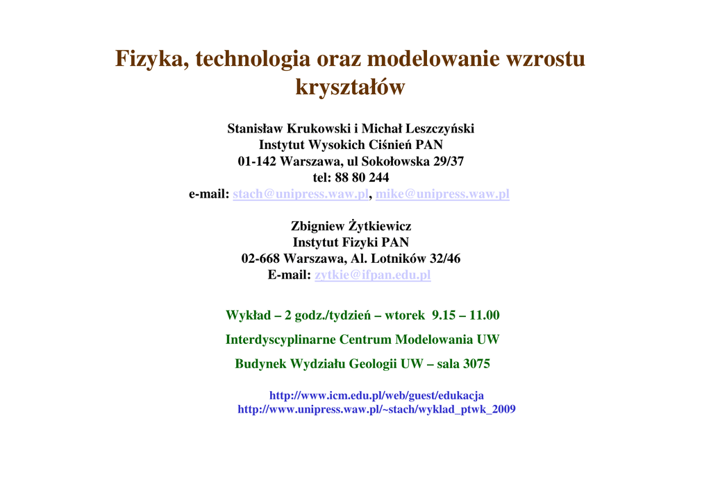 Fizyka, technologia oraz modelowanie wzrostu kryształów Stanisław Krukowski i Michał Leszczyński Instytut Wysokich Ciśnień PAN 01-142 Warszawa, ul Sokołowska 29/37 tel: 88 80 244 e-mail: [email protected], [email protected] Zbigniew Żytkiewicz Instytut Fizyki PAN 02-668 Warszawa, Al. Lotników 32/46 E-mail: [email protected] Wykład – 2 godz./tydzień – wtorek 9.15 – 11.00 Interdyscyplinarne Centrum Modelowania UW Budynek Wydziału Geologii UW – sala 3075 http://www.icm.edu.pl/web/guest/edukacja http://www.unipress.waw.pl/~stach/wyklad_ptwk_2009 Wykład 4. Równowagowe własności powierzchni krystalicznych Fazy skondensowane (stała, ciekła) – ujemna entalpia układu Energia oddziaływania – np. potencjał Lennarda-Jonesa (gazy szlachetne) 1.00 0.75 0.50 0.25 6 0.00 V/ε r r E(r ) = ε − σ σ 12 -0.25 -0.50 -0.75 -1.00 0.8 1.0 1.2 1.4 1.6 1.8 2.0 2.2 r/σ Do entalpii układu (jego energii wiązania) daje wkład wiele warstw atomowych. 2.4 2.6 2.8 3.0 Własności energetyczne warstw powierzchniowych Gęstość oraz energia oddziaływania – zmienia się w sposób ciągły Energia Gęstość Grubość warstwy powierzchniowej może być bardzo różna, jednak w wielu przypadkach, np. kryształy półprzewodników lub kryształy jonowe, może to być wiele warstw atomowych. Stosuje się wiele różnych przybliżeń do opisu własności powierzchni, jednak najprostszym jest opis Gibbsa Model powierzchni Gibbsa • Model Gibbsa – jednorodne własności faz objętościowych i dodatkowa gęstość (masy, energii, itp.) przypisywana powierzchni – gdy zachodzi taka potrzeba Energia Można wybrać położenie powierzchni tak, aby znikała powierzchniowa gęstość masy lub powierzchniowa gęstość energii. Gęstość W przypadku układy zawierającego kilka składników można wybrać położenie tak aby znikała powierzchniowa gęstość jednego ze składników. Opis standardowy – znika powierzchniowa gęstość masy Energia swobodna kryształu F jest sumą wkładu objętościowego i powierzchniowego: r r F = ∫ f s (T, p, r ) dV + ∫ f l (T, p, r ) dV + ∫ γ (θ, ϕ, T, p) dS Vs Vl S µl,s - potencjał chemiczny (s,l) fl,s - gęstość energii swobodnej na jednostkę objętości faz (s,l) γ - gęstość energii powierzchniowej Energia swobodna – w modelu Gibbsa jest więc równa: F = f s (T, p)Vs + f l (T, p)Vl + γ (θ, ϕ, T, p)A Napięcie powierzchniowe - i powierzchniowa gęstość energii • Powierzchniowa gęstość energii F= ∫ γ(θ, T, p) dS = γ(θ, T, p)A A • Napięcie powierzchniowe – siła działające na jednostkę długości obwodu powierzchni r σ Praca potrzebna na zwiększenie obwodu = zmiana energii powierzchni r r r r W = ∫ dlσ * δx ≅ σ δA = σ ∆Fpow = γδA r σ =γ Zwilżanie powierzchni • Rozważmy 3 układy: faza stała(1), faza gazowa(3) oraz inna faza (ciekła lub stała - 2) • Własności energetyczne powierzchni są określone przez ich energie powierzchniowe (napięcia powierzchniowe):γγ12, γ13, γ23. (A) • (B) Całkowite zwilżanie powierzchni (A) zachodzi gdy γ13 > γ12 + γ 23 Częściowe zwilżanie powierzchni – kąt zwilżania • Częściowe zwilżanie powierzchni (A) zachodzi gdy γ13 < γ12 + γ 23 γ13 > γ12 − γ 23 • Kąt zwilżania powierzchni definiujemy jako γ12 γ13 = γ12 + γ 23 cos(θ) θ γ 23 γ13 Brak zwilżania • Kąt zwilżania powierzchni γ12 γ13 = γ12 + γ 23 cos(θ) θ γ 23 • Brak zwilżania powierzchni (A) zachodzi gdy γ12 > γ13 + γ 23 γ13 Warunki stabilności (V,T) • Układy zamknięty – warunek na stabilności - fluktuacje izotermicznoizochoryczne δF ≥ 0 δF = − p1δV1 − p 2 δV1 + γδA + µ1δN1 + µ 2 δN 2 ≥ 0 N = N1 + N 2 = const δN1 = −δN 2 V = V1 + V2 = const δV1 = −V2 T = const δT = 0 • Równania równowagi p1 = p 2 + γ δA δV1 µ1 (p, T ) = µ 2 (p, T ) Stan równowagi zależy od kształtu powierzchni Powierzchnia płaska U1,V1,N1 U2,V2,N2 p1,T1,ρ ρ1 p2,T2,ρ ρ2 • Równania równowagi p1 = p 2 + γ δA δV1 µ1 (p, T ) = µ 2 (p, T ) • Dla powierzchni płaskiej – wielkość powierzchni nie zależy od objętości faz: δA =0 δV1 Warunki równowagi nie zależą od ich rozmiaru – są to wartości umieszczane na diagramach fazowych p1 = p 2 T1 = T2 = Tp Powierzchnia zakrzywiona – przypadek izotropowy • Równania równowagi p1 = p 2 + γ δA δV1 U1,V1,N1 µ1 (p, T ) = µ 2 (p, T ) p1,T1,ρ ρ1 U2,V2,N2 p2,T2,ρ ρ2 • Fazy izotropowe - kula: 4πR 3 V1 = 3 A = 4πR δA 2 = = κ1 + κ 2 δV1 R 2 κ1 , κ 2 - krzywizny powierzchni Warunki równowagi zależą od rozmiaru faz 2γ p1 = p 2 + R T1 = T2 ≠ Tp Powierzchnia zakrzywiona – efekt Gibbsa-Thompsona • Równania równowagi 2γ p1 = p 2 + R U1,V1,N1 p1,T1,ρ ρ1 • Przesunięcie ciśnienia – zmiana warunku równowagi chemicznej µ1 (p + dp, T + dT ) = µ 2 (p, T + dT ) Efekt Gibbsa - Thompsona – zmiana temperatury równowagi powierzchni zakrzywionej U2,V2,N2 p2,T2,ρ ρ2 Efekt Gibbsa-Thompsona • Powierzchnia płaska • Powierzchnia zakrzywiona µ1 (p, T ) = µ 2 (p, T ) µ1 (p + dp, T + dT ) = µ 2 (p, T + dT ) Po rozwinięciu otrzymujemy: vdp − s1dT = s 2 dT Tp dp vdp (V / N )dp Vdp = = = dT = s1 − s 2 (S1 − S2 ) / N S1 − S2 L Efekt Gibbsa - Thompsona – zmiana temperatury równowagi powierzchni zakrzywionej 2 do T = Tp 1 R do = γ γ = - długość kapilarna Tp (Sl - Ss ) L L – ciepło przemiany na jednostkę objętości Powierzchnia zakrzywiona – przypadek anizotropowy • Równania równowagi R2 1 1 p1 = p 2 + γ (θ, ϕ) + R R 2 1 • Dla powierzchni są zdefiniowane dwa promienie krzywizny R1 oraz R2 które dają rozmiar obszaru fazy 2. Zmiana ta powoduje zmianę potencjału chemicznego R1 µ1 (p + dp, T + dT ) = µ 2 (p, T + dT ) Efekt Gibbsa - Thompsona – zmiana temperatury równowagi powierzchni zakrzywionej: 1 1 T = Tm 1 - d o (θ, ϕ) + R 1 R 2 d o (θ, ϕ) = γ (θ, ϕ) γ (θ, ϕ) = Tm (Sl - Ss ) L Przypadek anizotropo