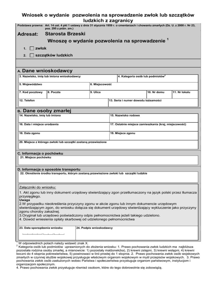 Wniosek o wydanie pozwolenia na sprowadzenie zwłok lub szczątków ludzkich z zagranicy Podstawa prawna: Art. 14 ust. 4 pkt 1 ustawy z dnia 31 stycznia 1959 r. o cmentarzach i chowaniu zmarłych (Dz. U. z 2000 r. Nr 23, poz. 295 z późn. zm.) Adresat: A. Starosta Brzeski Wnoszę o wydanie pozwolenia na sprowadzenie 1 1. zwłok 2. szczątków ludzkich Dane wnioskodawcy 4. Kategoria osób lub podmiotów2 3. Nazwisko, imię lub imiona wnioskodawcy 5. Województwo 7. Kod pocztowy 6. Miejscowość 8. Poczta 9. Ulica 11. Nr lokalu 13. Seria i numer dowodu tożsamości 12. Telefon B. 10. Nr domu Dane osoby zmarłej 14. Nazwisko, imię lub imiona 15. Nazwisko rodowe 16. Data i miejsce urodzenia 17. Ostatnie miejsce zamieszkania (kraj, miejscowość) 18. Data zgonu 19. Miejsce zgonu 20. Miejsce z którego zwłoki lub szczątki zostaną przewiezione C. Informacja o pochówku 21. Miejsce pochówku D. Informacja o sposobie transportu 22. Określenie środka transportu, którym zostaną przewiezione zwłoki lub szczątki ludzkie Załączniki do wniosku: 1. Akt zgonu lub inny dokument urzędowy stwierdzający zgon przetłumaczony na język polski przez tłumacza przysięgłego. Uwaga 2.W przypadku nieokreślenia przyczyny zgonu w akcie zgonu lub innym dokumencie urzędowym stwierdzającym zgon, do wniosku dołącza się dokument urzędowy stwierdzający wykluczenie jako przyczyny zgonu choroby zakaźnej. 3.Oryginał lub urzędowo poświadczony odpis pełnomocnictwa jeżeli takiego udzielono. 4. Dowód wniesienia opłaty skarbowej od udzielonego pełnomocnictwa 23. Data sporządzenia wniosku 1 24. Podpis wnioskodawcy W odpowiednich polach należy wstawić znak X. Kategoria osób lub podmiotów uprawnionych do złożenia wniosku: 1. Prawo pochowania zwłok ludzkich ma najbliższa pozostała rodzina osoby zmarłej, a mianowicie: 1) pozostały małżonek(ka), 2) krewni zstępni, 3) krewni wstępni, 4) krewni boczni do 4 stopnia pokrewieństwa, 5) powinowaci w linii prostej do 1 stopnia. 2. Prawo pochowania zwłok osób wojskowych zmarłych w czynnej służbie wojskowej przysługuje właściwym organom wojskowym w myśl przepisów wojskowych. 3. Prawo pochowania zwłok osób zasłużonych wobec Państwa i społeczeństwa przysługuje organom państwowym, instytucjom i organizacjom społecznym. 4. Prawo pochowania zwłok przysługuje również osobom, które do tego dobrowolnie się zobowiążą. 2