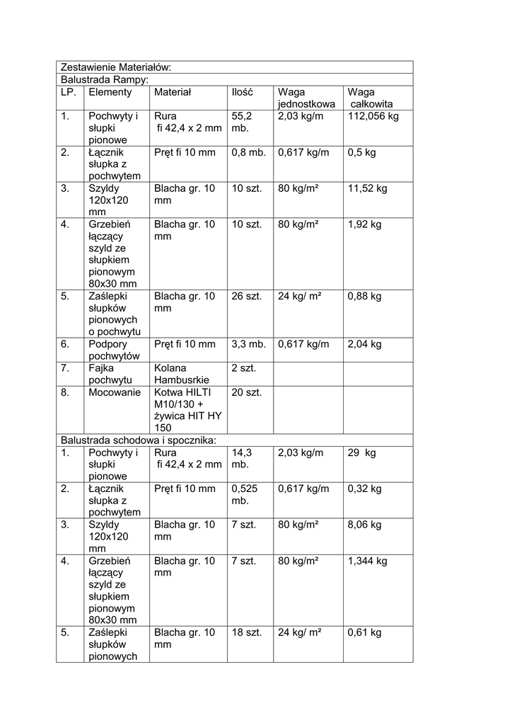 Zestawienie Materiałów: Balustrada Rampy: LP. Elementy Materiał 1. 2. 3. 4. 5. 6. 7. Pochwyty i słupki pionowe Łącznik słupka z pochwytem Szyldy 120x120 mm Grzebień łączący szyld ze słupkiem pionowym 80x30 mm Zaślepki słupków pionowych o pochwytu Podpory pochwytów Fajka pochwytu Mocowanie Ilość Rura 55,2 fi 42,4 x 2 mm mb. Waga jednostkowa 2,03 kg/m Waga całkowita 112,056 kg Pręt fi 10 mm 0,8 mb. 0,617 kg/m 0,5 kg Blacha gr. 10 mm 10 szt. 80 kg/m² 11,52 kg Blacha gr. 10 mm 10 szt. 80 kg/m² 1,92 kg Blacha gr. 10 mm 26 szt. 24 kg/ m² 0,88 kg Pręt fi 10 mm 3,3 mb. 0,617 kg/m 2,04 kg 14,3 mb. 2,03 kg/m 29 kg 0,525 mb. 0,617 kg/m 0,32 kg 7 szt. 80 kg/m² 8,06 kg 7 szt. 80 kg/m² 1,344 kg 18 szt. 24 kg/ m² 0,61 kg Kolana Hambusrkie 8. Kotwa HILTI M10/130 + Ŝywica HIT HY 150 Balustrada schodowa i spocznika: 1. Pochwyty i Rura słupki fi 42,4 x 2 mm pionowe 2. Łącznik Pręt fi 10 mm słupka z pochwytem 3. Szyldy Blacha gr. 10 120x120 mm mm 4. Grzebień Blacha gr. 10 łączący mm szyld ze słupkiem pionowym 80x30 mm 5. Zaślepki Blacha gr. 10 słupków mm pionowych 2 szt. 20 szt. 6. 7. 8. 9. o pochwytu Fajka pochwytu Mocowanie Kolana 2 szt. Hamburskie Kotwa HILTI 14 szt. M10/130 + Ŝywica HIT HY 150 Wypełnienie Pręt fi 10 mm 25 mb. balustrady pionowe elementy Wypełnienie Rura 9,56 balustrady fi 21,2 x 2 mm mb. poziome elementy 0,617 kg/m 15,425 kg 0,97 kg/m 9,27 kg Balustrada Rampy L= 5,6 mb. X 2 = 11,2 mb. Balustrada schodowa i spocznika. L= 6,245 mb.