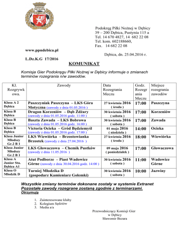 Podokręg Piłki Nożnej w Dębicy 39 – 200 Dębica, Pustynia 115 a Tel. 14 670 4827, 14 682 22 08 Tel. kom. 602188660, Fax. 14 682 22 08 www.ppndebica.pl Dębica, dn. 25.04.2016 r. L.Dz.K.G 17/2016 KOMUNIKAT Komisja Gier Podokręgu Piłki Nożnej w Dębicy informuje o zmianach terminów rozegrania n/w zawodów. Kl. Rozgrywk owa. Klasa A 2 Dębica Klasa B Dębica Klasa B Dębica Klasa B Dębica Klasa Junior Młodszy Gr.2 B 1 Klasa Junior Młodszy Gr.2 B 1 Klasa A Junior Sta. Dębica A1 Klasa O Młodzik D Zawody Data Rozegrania Meczu Paszczyniak Paszczyna – LKS Góra Motyczna (zawody z dnia 01.05.2016 ) Dragon Korzeniów – Dąb Żdżary 27 kwietnia 2016 ( środa ) Godz. Miejsce Rozegr rozegrania ania zawodów Meczu 17:00 Paszczyna 30 kwietnia 2016 ( sobota ) 30 kwietnia 2016 ( sobota ) 01 maja 2016 ( niedziela ) 27 kwietnia 2016 ( środa ) 17:00 Korzeniów 17:00 Zawada 14:00 Ocieka 18:00 Wiewiórka 09 maja 2016 ( poniedziałek ) 17:00 Głowaczowa Atut Podborze – Piast Wadowice Górne (zawody z dnia 30.04.2016 godz. 14:00 ) 30 kwietnia 2016 ( sobota ) 11:00 Wadowice Górne Turniej Młodzika D (gospodarz Kamieniarz Golemki) 30 kwietnia 2016 ( sobota ) 10:00 Jazwiny (zawody z dnia 01.05.2016 godz. 11:00 ) Baszta Zawada – LKS Bobrowa (zawody z dnia 01.05.2016 godz. 16:00 ) Victoria Ocieka – Gród Będziemyśl (zawody z dnia 01.05.2016 godz. 17:00 ) LKS Wiewiórka – Brzostowianka Brzostek (zawody z dnia 27.04.2016 ) LKS Głowaczowa – Chemik Pustków (zawody z dnia 11.05.2016 ) Wszystkie zmiany terminów dokonane zostały w systemie Extranet Pozostałe zawody rozegrane zostaną zgodnie z terminarzami. Otrzymują 1. Zainteresowane kluby 2. Kolegium Sędziów 3. Media a/a Przewodniczący Komisji Gier w Dębicy Sławomir Bezara
