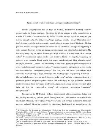 Jarosław A. Sobkowiak MIC Spór o kształt wiata w kontek cie „nowego porz dku moralnego” Historia przyzwyczaiła nas do tego, e wielkie, przełomowe momenty dziejów rozpoczynaj si form manifestu. Si gnijmy do tekstu jednego z nich, zostawionego u schyłku XX wieku. Czytamy w nim: My ludzie XX wieku niczego si tak nie boimy na tym wiecie, jak człowieka. Ów fakt powszechnego ludzkiego strachu – to jest Manetakel, które jawi si krwawymi literami na ostatniej stronie dotychczasowej historii Zachodu.1 Mo na postawi pytanie: Dlaczego człowiek tak bardzo boi si człowieka. Dlaczego boi si prawdy o sobie samym? Pierwszy powód jest natury egzystencjalnej: otó człowiek boi si mierci. Ma bowiem powody, aby si jej ba . U miercaj c Boga, u miercił w pewny sensie tak e samego siebie.2 W codzienno ci wyra a si to – jak powie G. Reale - w tragedii polegaj cej na ucieczce przed tragedi . Drugi powód jest natury metodologicznej. Otó u ywaj c poj takich jak „człowiek”, „osoba”, nie zauwa asi , e cał swoj gł bi i bogactwo czerpi one z wizji wiata kosmocentrycznego i wi tego. Tymczasem przenosi si te poj cia na opis wiata zsekularyzowanego i antropocentrycznego.3 Ów nowy dla nich wiat, pozbawiony wizji człowieka zakorzenionej w Bogu, atomizuje sens ludzkiego ycia i egzystencji. Człowiek – id c za McLuhanem – jawi si wtedy jako „wysepka czasu”, usiłuj c czasem przeskoczy z punktu do punktu. Nie potrafi jednak znale idei jednocz cej dla tego przeskoku.. Trudno mu te zrozumie słowa mówi ce o mo liwo ci odczytania Stwórcy z istnienia stworze , gdy wiat nie jest ju rzeczywisto ci. „zwierciadłem natury”, ale wył cznie „wstecznym lusterkiem” 4 Jak zauwa a ks. M. Dro d - jedn z konsekwencji takiego rozumienia wiata jest fakt, i uległ zasadniczej zmianie sposób formacji sumienia. Je li bowiem rzeczywisto nie ma stałych odniesie , wtedy spójna wizja wychowania jest równie niemo liwa. Sumienie zaczyna budowa 1 hierarchi warto ci w nieustannej konfrontacji ze zmieniaj cym si H. Weinstock, Die Tragödie des Humanismus. Warheit und Trug im abendländischen Menschenbild, Wiesbaden 1989, s. 346, cyt. za S. Folaron, Fenomen człowiecze stwa na przełomie XX/XXI wieku, „Ruch Filozoficzny” 48(2001) nr 2, s. 297; por tak e T. Michałek, Kontekst filozoficzno-kulturowy współczesno ci, „Sympozjum” 6(2002) nr 1(9), s. 8. 2 I. Sanna, L’antropologia della postmodernità e la conscienza christiana, „Studia Moralia” 2002 nr 2, s. 322; Ch. Delsol, Esej o człowieku pó nej nowoczesno ci, tłum. M. Kowalska, Kraków 2003, s. 203n. 3 Por. B. Sesboüé, Dieu et le concept de la personne, „Revue théologique de Louvain” 2002 nr 33, s. 321-322. 4 A. Doda, Przyszło we wstecznym lusterku. Inspiracje McLuhanowskie, „Sztuka i Filozofia” 1998 nr 15, s. 103-104. 2 wiatem. Rodzi to paradoks polegaj cy na tym, e przez konfrontacj człowiek uczy si zmienno ci, a jednocze nie odkrywa w sobie silne pragnienie jedno ci. Ten paradoks wn trza człowieka znajduje wyraz w zewn trznym wiecie. Wymownym tego wyrazem wyra onym przez Ryszarda Kapu ci skiego s dwie rzeki wiata: integracji i dezintegracji.5 A czasem wr cz chciałoby si dopowiedzie , i owe dwie rzeki wiata zlewaj si w jedno nowe koryto przera aj ce w swoim bezsensie. O co zatem si spiera : o wiat czy o człowieka? Gdyby tylko o wiat, to mo na by powiedzie , e ma si on w miar dobrze. Dobro osoby ju tylko niekiedy jest pierwszym celem ycia gospodarczego, bogactwa wiata nie przysłoni krajobraz ludzkiej n dzy i ubóstwa. I wszystko działoby si dobrze, gdyby nie teza Samuela Huntingtona mówi ca, i to kultura i to samo kulturowa, b d ce w szerokim poj ciu to samo ci cywilizacji, kształtuj wzorce spójno ci, dezintegracji i konfliktu w wiecie [...]. To samo za , niezale nie od tego czy jest narodowa, kulturowa czy cywilizacyjna, jest w pierwszym rz dzie to samo ci osoby. Spór o wiat jest w rzeczywisto ci sporem o człowieka.6 Ka dy spór musi odwoływa si do okre lonego porz dku, argumentów i hermeneutyki. Czy istnieje zatem nowy porz dek moralny, okre laj cy form istnienia, rozumienia i działania, czym si on charakteryzuje, w czym wyra a i jakie mo e mie konsekwencje dla przyszło ci człowieka? Na te wła nie pytania b dzie si poszukiwa odpowiedzi w proponowanej refleksji. W cz ci pierwszej, bardziej teoretycznej, uka e si funkcjonowanie nowego porz dku moralnego w trzech kontekstach: działania, my lenia i prawa. W drugiej dokona si egzemplifikacji teoretycznych stwierdze rozpatruj c bardzo aktualn płaszczyzn „nowego” we współczesnym wiecie, jakim jest globalizacja i towarzysz ce jej zjawisko godno ci w komunikacji. I. Płaszczyzny nowego porz dku moralnego Rozpocz cie analiz od szukania elementów „nowego porz dku moralnego” w systemach, szkołach czy o rodkach naukowych byłoby nieporozumieniem. System ten nie ma swoich sztandarowych przywódców, ma raczej społeczne siły, ideologów, rzadziej my licieli. Jego 5 Por. M. Dro d , Przestrze sensu w postmodernistycznej „cywilizacji medialnej”, „Tarnowskie Studia Teologiczne” 20(2001) nr 1, s. 29; R. Kapu ci ski, Rewolucja planetarna, „Wi ” 44(2001) nr 10, s. 15. 6 S.P. Huntington, Zderzenie cywilizacji, tłum. H. Jankowska, Warszawa 1998, s. 14; por. tak e T. Michałek, Kontekst filozoficzno-kulturowy współczesno ci, art. cyt., s. 22-25. 3 siła polega nie tyle na negowaniu tradycyjnych warto ci, co raczej na proponowaniu nowych płaszczyzn porz dku. Pozornie wydaje si , i w ramach nowego porz dku brakuje jasno okre lonej płaszczyzny moralnej. Łatwo jednak zauwa y , e płaszczyzn t usiłuje si zast pi ideologiczn podbudow współczesnego rozumienia praw człowieka.7 Ideologiczn , gdy miejscem powstawania norm nie jest jaki obiektywnie istniej cy system, ale konfrontacja zrodzona przez komunikacj . Nowym wymiarem tego porz dku jest specyficznie poj ty relatywizm. Wyra a si on nie tyle w klasycznie rozumianym relatywizmie moralnym, co