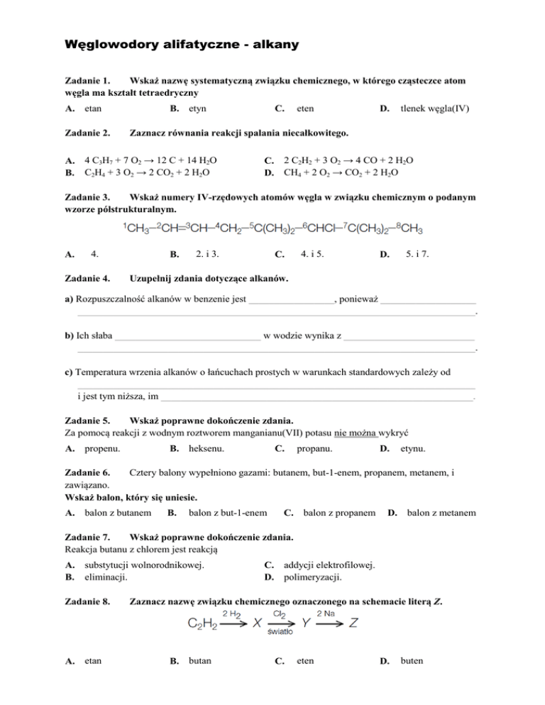 Węglowodory alifatyczne - alkany Zadanie 1. Wskaż nazwę systematyczną związku chemicznego, w którego cząsteczce atom węgla ma kształt tetraedryczny A. etan Zadanie 2. B. etyn C. eten D. tlenek węgla(IV) Zaznacz równania reakcji spalania niecałkowitego. A. 4 C3H7 + 7 O2 → 12 C + 14 H2O B. C2H4 + 3 O2 → 2 CO2 + 2 H2O C. 2 C2H2 + 3 O2 → 4 CO + 2 H2O D. CH4 + 2 O2 → CO2 + 2 H2O Zadanie 3. Wskaż numery IV-rzędowych atomów węgla w związku chemicznym o podanym wzorze półstrukturalnym. A. 4. Zadanie 4. B. 2. i 3. C. 4. i 5. D. 5. i 7. Uzupełnij zdania dotyczące alkanów. a) Rozpuszczalność alkanów w benzenie jest _________________, ponieważ ___________________ _______________________________________________________________________________. b) Ich słaba _____________________________ w wodzie wynika z __________________________ _______________________________________________________________________________. c) Temperatura wrzenia alkanów o łańcuchach prostych w warunkach standardowych zależy od _______________________________________________________________________________ i jest tym niższa, im ______________________________________________________________. Zadanie 5. Wskaż poprawne dokończenie zdania. Za pomocą reakcji z wodnym roztworem manganianu(VII) potasu nie można wykryć A. propenu. B. heksenu. C. propanu. D. etynu. Zadanie 6. Cztery balony wypełniono gazami: butanem, but-1-enem, propanem, metanem, i zawiązano. Wskaż balon, który się uniesie. A. balon z butanem B. balon z but-1-enem C. balon z propanem D. balon z metanem Zadanie 7. Wskaż poprawne dokończenie zdania. Reakcja butanu z chlorem jest reakcją A. substytucji wolnorodnikowej. B. eliminacji. Zadanie 8. A. etan C. addycji elektrofilowej. D. polimeryzacji. Zaznacz nazwę związku chemicznego oznaczonego na schemacie literą Z. B. butan C. eten D. buten Zadanie 9. Wskaż nazwę produktu chlorowania propenu. A. 1,1-dichloropropan B. 1,2-dichloropropan C. 1-chloropropan D. 2-chloropropan Zadanie 10. Wskaż poprawne dokończenie zdania. Mała reaktywność chemiczna etanu w reakcji z chlorem wynika z A. obecności wiązania π między atomami węgla. B. obecności wiązania σ między atomami węgla. C. dużej reaktywności chemicznej chloru. D. gazowego stanu skupienia reagentów. Zadanie 11. Butle gazowe napełnia się propanem i butanem. Wskaż, jaki procent objętościowy stanowił propan i butan w butli o pojemności 5 dm3, jeśli po całkowitym spaleniu tych gazów otrzymano 18,5 dm3 tlenku węgla(IV). A. 30% propanu i 70% butanu B. 20% propanu i 80% butanu C. D. 40% propanu i 60% butanu 60% propanu i 40% butanu Zadanie 12. Zaznacz równania reakcji spalania niecałkowitego. A. 4 C3H7 + 7 O2 → 12 C + 14 H2O B. C2H4 + 2 O2 → 2 CO + 2 H2O C. 2 C2H2 + 5 O2 → 4 CO2 + 2 H2O D. CH4 + 2 O2 → CO2 + 2 H2O Zadanie 13. Uzupełnij zdania dotyczące alkanów. a) Temperatura wrzenia alkanów o łańcuchach prostych w warunkach standardowych zależy od _________________________________________ i jest tym wyższa, im ___________________ ______________________________________________________________________________. b) Rozpuszczalność węglowodorów w wodzie jest _______________________________, ponieważ ______________________________________________________________________________. c) Ich dobra _________________________ w benzynie wynika z ___________________________ _____________________________________________________________________________ Zadanie 14. Zaznacz nazwę związku chemicznego oznaczonego na schemacie literą Z. A. metan B. eten C. etan D. etyn Zadanie 15. Wskaż nazwę głównego produktu reakcji 1 mola propanu z 1 molem chloru w obecności światła. A. 1,1-dichloropropan B. 1,2-dichloropropan C. chloropropan D. 2-chloropropan Zadanie 16. Wskaż poprawne dokończenie zdania. Homologi to A. atomy węgla o różnej hybrydyzacji. B. powtarzające się elementy we wzorze polimeru. C. związki chemiczne o wspólnym wzorze sumarycznym, różniące się krotnością grupy –CH2–. D. związki chemiczne o tym samym wzorze sumarycznym, lecz różnych wzorach strukturalnych. Zadanie 17. Wskaż numer schematu, który przedstawia otrzymywanie metanu. III A. schemat I B. schematy II i III C. schematy II i IV 3 D. schemat III
