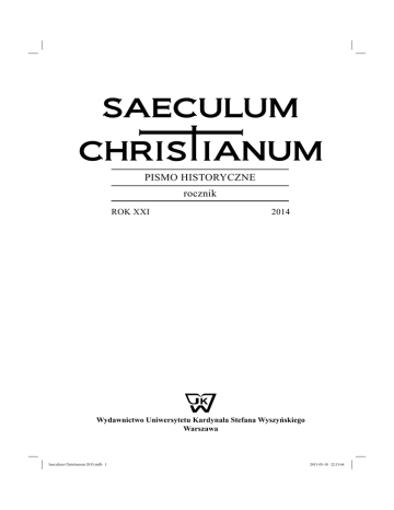 PISMO HISTORYCZNE rocznik ROK XXI 2014 Wydawnictwo Uniwersytetu Kardynała Stefana Wyszyńskiego Warszawa Saeculum Christianum 2015.indb 1 2015-05-18 22:13:44 UNIWERSYTET KARDYNAŁA STEFANA WYSZYŃSKIEGO WYDZIAŁ NAUK HISTORYCZNYCH I SPOŁECZNYCH Wersja papierowa czasopisma jest wersją pierwotną Kolegium Redakcyjne: Adam Buława, Rita Čapaite, Penelope Filacchione, Anna Głusiuk (Sekretarz), Waldemar Graczyk (Redaktor Naczelny), Stefan Kozłowski, Jolanta M. Marszalska, Dariusz Milewski, Janusz Nowiński, Tomasz Skibiński Rada Naukowa: prof. Marco Conti (USA, Rzym), prof. dr hab. Waldemar Deluga (UKSW), prof. dr hab. Jan Dzięgielewski (UKSW), prof. Penelope Filacchione (UPS Rzym), prof. dr hab. Martin Gojda (Uniwersytet w Pilźnie, UKSW), ks. prof. dr hab. Waldemar Graczyk (UKSW), ks. prof. dr hab. Ryszard Knapiński (KUL), ks. prof. dr hab. Kazimierz Łatak (UKSW), prof. dr hab. Ewa Łużyniecka (PWr), prof. dr hab. Rastislav Koziak (Bańska Bystrzyca, Słowacja), ks. prof. dr hab. Józef Mandziuk (UKSW), prof. dr hab. Jolanta M. Marszalska (UKSW), prof. dr hab. Mirosław Nagielski (UW), ks. prof. dr hab. Józef Naumowicz (UKSW), prof. dr hab. Janusz Odziemkowski (UKSW), prof. dr hab. Anna Pobóg-Lenartowicz (UO), prof. dr hab. Bogdan Rok (UWr), ks. prof. Manlio Sodi (UPS, Rzym), ks. prof. dr hab. Józef Stala (UPJPII), prof. dr hab. Leonid Tymoszenko (Uniwersytet w Drohobuczu, Ukraina), prof. dr hab. Andrzej Wyrwa (UAM), prof. dr hab. Wiesław Jan Wysocki (UKSW), prof. dr hab. Jan Żaryn (UKSW), prof. dr hab. Dorota Żołądź-Strzelczyk (UAM) Recenzenci tomu: prof. dr hab. Małgorzata Dąbrowska, dr hab. Dariusz Dekański, prof. dr hab. Ewa DubasUrwanowicz, dr hab. Wojciech Gajewski, ks. prof. dr hab. Michał Janocha, prof. dr hab. Eugeniusz Koko, dr hab. Aneta Kramiszewska, ks. prof. Mario Maritano, dr hab. Jacek Pielas, dr hab. Marta Pieniążek-Samek, prof. dr hab. Anna Pobóg-Lenartowicz, dr hab. Michał Polak, ks. prof. dr hab. Roland Prejs, prof. dr hab. Bogdan Rok, prof. dr hab. Waldemar Rozynkowski, ks. dr hab. Mieczysław Różański, prof. dr hab. Tadeusz Rutkowski, ks. prof. Manlio Sodi, dr hab. Krzysztof Sychowicz, ks. dr hab. Tadeusz Syczewski, dr hab. Anna Szylar, prof. dr hab. Stanisław Wiech, ks. prof. dr hab. Antoni Żurek, dr hab. Beata Wojciechowska Korekta edytorska: Joanna Graczyk Korekta języka angielskiego: Patrick Hennessy Korekta języka włoskiego: prof. Manlio Sodi Projekt okładki: ks. Paweł Dudziński ISSN 1232-1575 Zgłoszenia prenumeraty przyjmuje Wydawnictwo UKSW ul. Dewajtis 5, 01-815 Warszawa, tel./fax 22 561 89 23 www.wydawnictwo.uksw.edu.pl Adres redakcji: ul. Wóycickiego 1/3 bl. 23 pokój 320 01-938 Warszawa www.saeculum.christianum.uksw.edu.pl Druk i oprawa: Oficyna Wydawniczo-Poligraficzna „Adam” 02-729 Warszawa, ul. Rolna 191/193 tel. (22) 843-37-23, (22) 843-08-79, tel./fax (22) 843-20-52 Saeculum Christianum 2015.indb 2 2015-05-18 22:13:44 HISTORICAL WRITINGS annual YEAR XXI 2014 Wydawnictwo Uniwersytetu Kardynała Stefana Wyszyńskiego Warszawa Saeculum Christianum 2015.indb 3 2015-05-18 22:13:44 CARDINAL STEFAN WYSZYŃSKI UNIWERSITY FACULTY OF HISTORY AND SOCIAL SCIENCES Print edition is the original version of the periodical Editorial Staff: Adam Buława, Rita Čapaite, Penelope Filacchione, Anna Głusiuk (Secretary of editorial staff), Waldemar Graczyk (Editor-in-chief), Stefan Kozłowski, Jolanta M. Marszalska, Dariusz Milewski, Janusz Nowiński, Tomasz Skibiński Advisory Board: prof. Marco Conti (USA, Rzym), prof. dr hab. Waldemar Deluga (UKSW), prof. dr hab. Jan Dzięgielewski (UKSW), prof. Penelope Filacchione (UPS Rzym), prof. dr hab. Martin Gojda (Uniwersytet w Pilźnie, UKSW), ks. prof. dr hab. Waldemar Graczyk (UKSW), ks. prof. dr hab. Ryszard Knapiński (KUL), ks. prof. dr hab. Kazimierz Łatak (UKSW), prof. dr hab. Ewa Łużyniecka (PWr), prof. dr hab. Rastislav Koziak (Bańska Bystrzyca, Słowacja), ks. prof. dr hab. Józef Mandziuk (UKSW), prof. dr hab. Jolanta M. Marszalska (UKSW), prof. dr hab. Mirosław Nagielski (UW), ks. prof. dr hab. Józef Naumowicz (UKSW), prof. dr hab. Janusz Odziemkowski (UKSW), prof. dr hab. Anna Pobóg-Lenartowicz (UO), prof. dr hab. Bogdan Rok (UWr), ks. prof. Manlio Sodi (UPS, Rzym), ks. prof. dr hab. Józef Stala (UPJPII), prof. dr hab. Leonid Tymoszenko (Uniwersytet w Drohobuczu, Ukraina), prof. dr hab. Andrzej Wyrwa (UAM), prof. dr hab. Wiesław Jan Wysocki (UKSW), prof. dr hab. Jan Żaryn (UKSW), prof. dr hab. Dorota Żołądź-Strzelczyk (UAM) Reviewing Editors: prof. dr hab. Małgorzata Dąbrowska, dr hab. Dariusz Dekański, prof. dr hab. Ewa Dubas-Urwanowicz, dr hab. Wojciech Gajewski, ks. prof. dr hab. Michał Janocha, prof. dr hab. Eugeniusz Koko, dr hab. Aneta Kramiszewska, ks. prof. Mario Maritano, dr hab. Jacek Pielas, dr hab. Marta Pieniążek-Samek, prof. dr hab. Anna Pobóg-Lenartowicz, dr hab. Michał Polak, ks. prof. dr hab. Roland Prejs, prof. dr hab. Bogdan Rok, prof. dr hab. Waldemar Rozynkowski, ks. dr hab. Mieczysław Różański, prof. dr hab. Tadeusz Rutkowski, ks. prof. Manlio Sodi, dr hab. Krzysztof Sychowicz, ks. dr hab. Tadeusz Syczewski, dr hab. Anna Szylar, prof. dr hab. Stanisław Wiech, ks. prof. dr hab. Antoni Żurek, dr hab. Beata Wojciechowska Editing: Joanna Graczyk Proofreading of texts in English: Patrick Hennessy Proofreading of texts in Italian: prof. Manlio Sodi Cover design: ks. Paweł Dudziński ISSN 1232-1575 Requests for subscription should be sent to Editor: Wydawnictwo UKSW ul. Dewajtis 5, 01-815 Warszawa, tel./fax 225618923 www.wydawnictwo.uksw.edu.pl Publisher: ul. Wóycickiego 1/3 bl. 23 pokój 320 01-938 Warszawa www.saeculum.christianum.uksw.edu.pl Printed by: Oficyna Wydawniczo-Poligraficzna „Adam” 02-729 Warszawa, ul. Rolna 191/193 tel. (22) 843-37-23, (22) 843-08-79, tel./fax (22) 843-20-52 Saeculum Christianum 2015.indb 4 2015-05-18 22:13:44 R O Z P R A W Y I A R T Y K U Ł Y Saeculum Christianum t. XXI (2014) s. 5 -15 PRZEM
