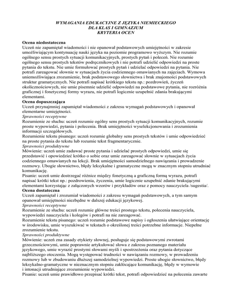 WYMAGANIA EDUKACYJNE Z JĘZYKA NIEMIECKIEGO DLA KLAS I GIMNAZJUM KRYTERIA OCEN Ocena niedostateczna Uczeń nie zapamiętał wiadomości i nie opanował podstawowych umiejętności w zakresie umożliwiającym kontynuację nauki języka na poziomie programowo wyższym. Nie rozumie ogólnego sensu prostych sytuacji komunikacyjnych, prostych pytań i poleceń. Nie rozumie ogólnego sensu prostych tekstów podręcznikowych i nie potrafi udzielić odpowiedzi na proste pytania do tekstu. Nie umie formułować prostych pytań i udzielać odpowiedzi na pytania. Nie potrafi zareagować słownie w sytuacjach życia codziennego omawianych na zajęciach. Wymowa uniemożliwiająca zrozumienie, brak podstawowego słownictwa i brak znajomości podstawowych struktur gramatycznych. Nie potrafi napisać krótkiego tekstu np.: pozdrowień, życzeń okolicznościowych, nie umie pisemnie udzielić odpowiedzi na podstawowe pytania, nie rozróżnia graficznej i fonetycznej formy wyrazu, nie potrafi logicznie uzupełnić zdania brakującymi elementami. Ocena dopuszczająca Uczeń przynajmniej zapamiętał wiadomości z zakresu wymagań podstawowych i opanował elementarne umiejętności. Sprawności receptywne Rozumienie ze słuchu: uczeń rozumie ogólny sens prostych sytuacji komunikacyjnych, rozumie proste wypowiedzi, pytania i polecenia. Brak umiejętności wyselekcjonowania i zrozumienia informacji szczegółowych. Rozumienie tekstu pisanego: uczeń rozumie globalny sens prostych tekstów i umie odpowiedzieć na proste pytania do tekstu lub rozumie tekst fragmentarycznie. Sprawności produktywne Mówienie: uczeń umie zadawać proste pytania i udzielać prostych odpowiedzi, umie się przedstawić i opowiedzieć krótko o sobie oraz umie zareagować słownie w sytuacjach życia codziennego omawianych na lekcji. Brak umiejętności samodzielnego nawiązania i prowadzenie rozmowy. Ubogie słownictwo, błędy leksykalne i gramatyczne mogą w znacznym stopniu utrudniać komunikację. Pisanie: uczeń umie dostrzegać różnice między fonetyczną a graficzną formą wyrazu, potrafi napisać krótki tekst np.: pozdrowienia, życzenia, umie logicznie uzupełnić zdanie brakującymi elementami korzystając z załączonych wzorów i przykładów oraz z pomocy nauczyciela /sugestia/. Ocena dostateczna Uczeń zapamiętał i zrozumiał wiadomości z zakresu wymagań podstawowych, a tym samym opanował umiejętności niezbędne w dalszej edukacji językowej. Sprawności receptywne Rozumienie ze słuchu: uczeń rozumie główne treści prostego tekstu, polecenia nauczyciela, wypowiedzi nauczyciela i kolegów i potrafi na nie zareagować. Rozumienie tekstu pisanego: uczeń rozumie podstawowe napisy i ogłoszenia ułatwiające orientację w środowisku, umie wyszukiwać w tekstach o określonej treści potrzebne informacje. Niepełne zrozumienie tekstu. Sprawności produktywne Mówienie: uczeń zna zasady etykiety słownej, posługuje się podstawowymi zwrotami grzecznościowymi, umie poprawnie artykułować słowa z zakresu poznanego materiału językowego, umie wyrazić prostymi słowami myśli i spostrzeżenia oraz pytania dotyczące najbliższego otoczenia. Mogą występować trudności w nawiązaniu rozmowy, w prowadzeniu rozmowy lub w zbudowaniu dłuższej samodzielnej wypowiedzi. Proste ubogie słownictwo, błędy leksykalno-gramatyczne w nieznacznym stopniu zakłócające komunikację, błędy w wymowie i intonacji utrudniające zrozumienie wypowiedzi. Pisanie: uczeń umie prawidłowo przepisać krótki tekst, potrafi odpowiedzieć na polecenia zawarte w ćwiczeniach /pisanie odtwórcze/. Ocena dobra Uczeń wykorzystuje wiadomości i umiejętności z zakresu wymagań ponadpodstawowych w sytuacjach typowych. Sprawności receptywne Rozumienie ze słuchu: uczeń rozumie globalnie sens nieskomplikowanych typowych sytuacji komunikacyjnych, rozumie dłuższe wypowiedzi partnerów komunikacyjnych. Mogą wystąpić niewielkie nieścisłości w zrozumieniu tekstu. Rozumienie tekstu pisanego: uczeń rozumie dłuższe teksty podręcznikowe, potrafi formułować pytania dotyczące ogólnej treści tekstu, zna podstawowe techniki czytania tekstu ze zrozumieniem /internacjonalizmy, słowa-klucze itp./ Dopuszczalne są drobne nieścisłości w zrozumieniu treści tekstu. Sprawności produktywne Mówienie: uczeń umie uzyskiwać i udzielać informacji w typowych sytuacjach dnia codziennego, posiada w miarę poprawną wymowę umożliwiającą komunikację. Wymowa i intonacja ogólnie poprawne, nie zakłócające możliwości porozumiewania się. Nieznaczne błędy gramatyczne i leksykalne nie utrudniające komunikacji. Pisanie: uczeń umie napisać kartkę z życzeniami okolicznościowymi, krótki list inicjujący znajomość, wypełnić formularz podstawowymi informacjami o sobie, zaproszenia na określoną imprezę, ogłoszenie. Ocena bardzo dobra Uczeń wykorzystuje wiadomości i umiejętności z zakresu wymagań ponadpodstawowych w sytuacjach nietypowych /problemowych/. Sprawności receptywne Rozumienie ze słuchu: uczeń rozumie globalnie teksty podręcznikowe i sens informacji płynących z mediów, potrafi wyszukiwać informacje szczegółowe i reagować w sytuacjach komunikacyjnych wyznaczonych przez przekazywane treści. Rozumienie tekstu pisanego: uczeń umie wyszukiwać w dłuższych fragmentach tekstu najważniejsze informacje, rozumie globalnie dłuższe teksty, dokonuje selekcji informacji zawartych w tekście. Pełne zrozumienie treści tekstu. Sprawności produktywne Mówienie: uczeń umie inicjować i podtrzymywać prostą rozmowę w sytuacji bezpośredniego kontaktu z rozmówcą i z jego pomocą, potrafi formułować krótkie wypowiedzi na określone tematy zachowując poprawność gramatyczno-językową. Bezbłędne, spontaniczne i naturalne reagowanie w sytuacjach dnia codziennego. Swoboda i bogactwo struktur gramatyczno-leksykalnych. Dopuszczalne są nieliczne, drobne błędy gramatyczne i leksykalne nie zakłó