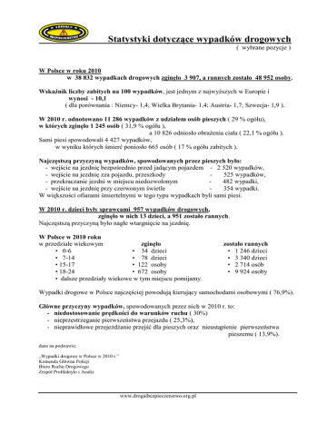 Statystyki dotyczące wypadków drogowych ( wybrane pozycje ) W Polsce w roku 2010 w 38 832 wypadkach drogowych zginęło 3 907, a rannych zostało 48 952 osoby. Wskaźnik liczby zabitych na 100 wypadków, jest jednym z najwyższych w Europie i wynosi - 10,1 ( dla porównania : Niemcy- 1,4; Wielka Brytania- 1,4; Austria- 1,7; Szwecja- 1,9 ). W 2010 r. odnotowano 11 286 wypadków z udziałem osób pieszych ( 29 % ogółu), w których zginęło 1 245 osób ( 31,9 % ogółu ), a 10 826 odniosło obrażenia ciała ( 22,1 % ogółu ). Sami piesi spowodowali 4 427 wypadków, w wyniku których śmierć poniosło 665 osób ( 17 % ogółu zabitych ). Najczęstszą przyczyną wypadków, spowodowanych przez pieszych było: - wejście na jezdnię bezpośrednio przed jadącym pojazdem - 2 520 wypadków, - wejście na jezdnię zza pojazdu, przeszkody 525 wypadków, - przekraczanie jezdni w miejscu niedozwolonym 482 wypadki, - wejście na jezdnię przy czerwonym świetle 354 wypadki. W większości ofiarami śmiertelnymi w tego typu wypadkach byli sami piesi. W 2010 r. dzieci były sprawcami 957 wypadków drogowych, zginęło w nich 13 dzieci, a 951 zostało rannych. Najczęstszą przyczyną było nagłe wtargnięcie na jezdnię. W Polsce w 2010 roku w przedziale wiekowym zginęło • 0-6 • 34 dzieci • 7-14 • 78 dzieci • 15-17 • 122 osoby • 18-24 • 672 osoby • dalsze przedziały wiekowe w tym miejscu pomijamy. zostało rannych • 1 246 dzieci • 3 340 dzieci • 2 714 osób • 9 924 osoby Wypadki drogowe w Polsce najczęściej powodują kierujący samochodami osobowymi ( 76,9%). Główne przyczyny wypadków, spowodowanych przez nich w 2010 r. to: - niedostosowanie prędkości do warunków ruchu ( 30%) - nieprzestrzeganie pierwszeństwa przejazdu ( 25,3%), - nieprawidłowe przejeżdżanie przejść dla pieszych oraz nieustąpienie pierwszeństwa pieszemu ( 13,9%). dane na podstawie: „Wypadki drogowe w Polsce w 2010 r.” Komenda Główna Policji Biuro Ruchu Drogowego Zespół Profilaktyki i Analiz www.drogaibezpieczenstwo.org.pl