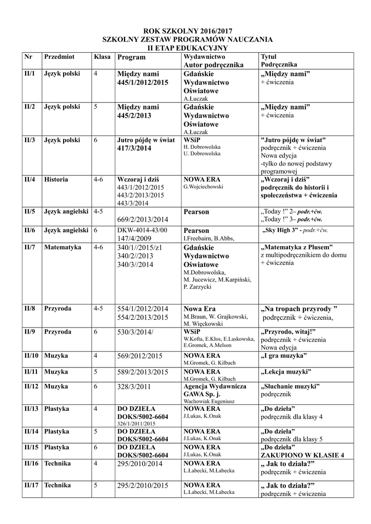 Nr Przedmiot II/1 Język polski II/2 Język polski ROK SZKOLNY 2016/2017 SZKOLNY ZESTAW PROGRAMÓW NAUCZANIA II ETAP EDUKACYJNY Klasa Program Wydawnictwo Tytuł Podręcznika Autor podręcznika 4 Między nami Gdańskie „Między nami” + ćwiczenia 445/1/2012/2015 Wydawnictwo Oświatowe A.Łuczak 5 Między nami 445/2/2013 Gdańskie Wydawnictwo Oświatowe „Między nami” + ćwiczenia A.Łuczak II/3 II/4 II/5 Język polski Historia 6 4-6 Jutro pójdę w świat WSiP 417/3/2014 H. Dobrowolska U. Dobrowolska Wczoraj i dziś 443/1/2012/2015 443/2/2013/2015 443/3/2014 NOWA ERA Język angielski 4-5 669/2/2013/2014 II/6 II/7 Język angielski 6 Matematyka 4-6 DKW-4014-43/00 147/4/2009 340/1//2015/z1 340/2//2013 340/3//2014 G.Wojciechowski "Jutro pójdę w świat" podręcznik + ćwiczenia Nowa edycja -tylko do nowej podstawy programowej „Wczoraj i dziś” podręcznik do historii i społeczeństwa + ćwiczenia Pearson „Today !” 2– podr.+ćw. „Today !” 3– podr.+ćw. Pearson „Sky High 3” - podr.+ćw. I.Freebairn, B.Abbs, Gdańskie Wydawnictwo Oświatowe „Matematyka z Plusem” z multipodręcznikiem do domu + ćwiczenia M.Dobrowolska, M. Jucewicz, M.Karpiński, P. Zarzycki II/8 II/9 Przyroda Przyroda II/10 Muzyka II/11 Muzyka 4-5 6 4 5 554/1/2012/2014 554/2/2013/2015 Nowa Era 530/3/2014/ WSiP 569/2012/2015 NOWA ERA 589/2/2013/2015 NOWA ERA Agencja Wydawnicza GAWA Sp. j. II/12 Muzyka 6 328/3/2011 II/13 Plastyka 4 DO DZIEŁA DOKS/5002-6604 M.Braun, W. Grajkowski, M. Więckowski W.Kofta, E.Kłos, E.Laskowska, E.Gromek, A.Melson „Na tropach przyrody ” podręcznik + ćwiczenia, „Przyrodo, witaj!” podręcznik + ćwiczenia Nowa edycja „I gra muzyka” M.Gromek, G. Kilbach „Lekcja muzyki” M.Gromek, G. Kilbach „Słuchanie muzyki” podręcznik Wachowiak Eugeniusz NOWA ERA J.Lukas, K.Onak „Do dzieła” podręcznik dla klasy 4 326/1/2011/2015 II/14 Plastyka II/15 Plastyka II/16 Technika II/17 Technika 5 6 4 5 DO DZIEŁA DOKS/5002-6604 DO DZIEŁA DOKS/5002-6604 NOWA ERA J.Lukas, K.Onak „Do dzieła” podręcznik dla klasy 5 „Do dzieła” ZAKUPIONO W KLASIE 4 295/2010/2014 NOWA ERA „ Jak to działa?” 295/2/2010/2015 J.Lukas, K.Onak NOWA ERA L.Łabecki, M.Łabecka NOWA ERA L.Łabecki, M.Łabecka podręcznik + ćwiczenia „ Jak to działa?” podręcznik + ćwiczenia II/18 Technika 6 II/19 Informatyka II/20 Informatyka II/21 Wychowanie fizyczne 4-5 6 4-6 Odkrywamy na nowo 384/2/2012 OPERON U. Białka LUBIĘ TO! NOWA ERA 729/1/2015 729/2/2016 M.Kęska LUBIĘ TO! NOWA ERA 583/m/2012 M.Kęska Koncepcja edukacji fizycznej ZdrowieSport-Rekreacja Korepetytor Zajęcia techniczne - część techniczna - podręcznik JEŚLI ZAKUPIONO W KLASIE 4 – NIE KUPOWAĆ „Lubię to!” nowoczesny pakiet do zajęć komputerowych „Lubię to!” nowoczesny pakiet do zajęć komputerowych ZAKUPIONO W KLASIE 4 Urszula Kierczak ______________________ Księgarnia Św. Wojciecha „ Jestem chrześcijaninem” podręcznik + karty pracy Poradnik metodyczny II/22 Religia 4 II/23 Religia 5 II/24 Religia 6 II/25 Wychowanie do życia w rodzinie II/26 Etyka 5-6 Poznaję Boga i w Niego wierzę J. Szpet, D. Jackowiak AZ-2-01/10 AZ-21-01/10-PO-1/11 Księgarnia Św. Poznaję Boga i w Wojciecha Niego wierzę J. Szpet, D. Jackowiak AZ-2-01/10 AZ-22-01/10-PO-1/12 Księgarnia Św. Poznaję Boga i w Wojciecha Niego wierzę J. Szpet, D. Jackowiak AZ-2-01/10 AZ-23-01/10-PO-2/13 W drodze ku Wydawnictwo RUBIKON OFICYNA WSPÓŁCZESNA dorosłości „Ludzkie ścieżki” „Wierzę w Kościół” podręcznik + karty pracy ________ „W drodze ku dorosłości” ćwiczenia i materiały do kl.5 i do kl. 6 ___________ ________ ___________ T. Król, 4-6 „Wierzę w Boga” podręcznik + karty pracy A.Ziemska Ł.Malinowski II/27 Program kształcenia muzycznego zespołu muzyki dawnej „Mała Ars Nova” 4-6 Program autorski J. Wojtaszek Uchwała nr 21/2008/2009 Rady Pedagogicznej z dnia 27.08.2009 Rodzice kupują zestawy podręczników do klas 6 oraz do religii i etyki klas 4-6. Zestawy do klas 4-5 (z wyłączeniem RELIGII i ETYKI) są bezpłatne – zamówienie składa Szkoła.